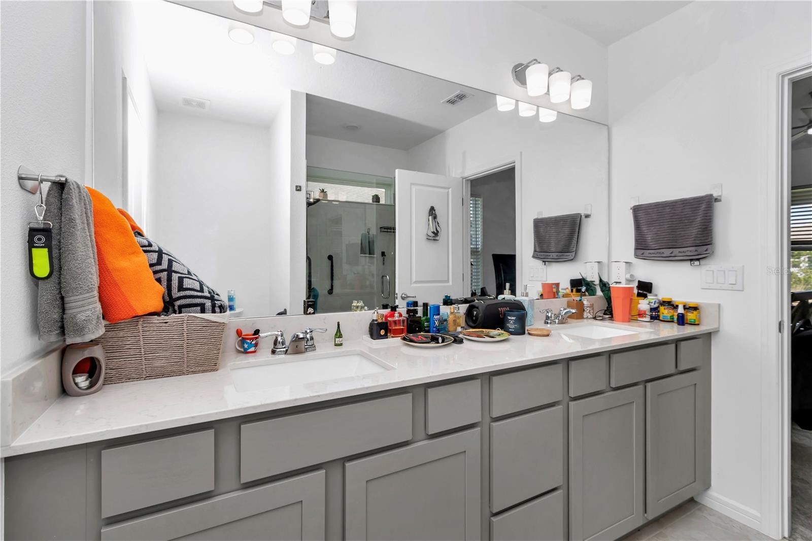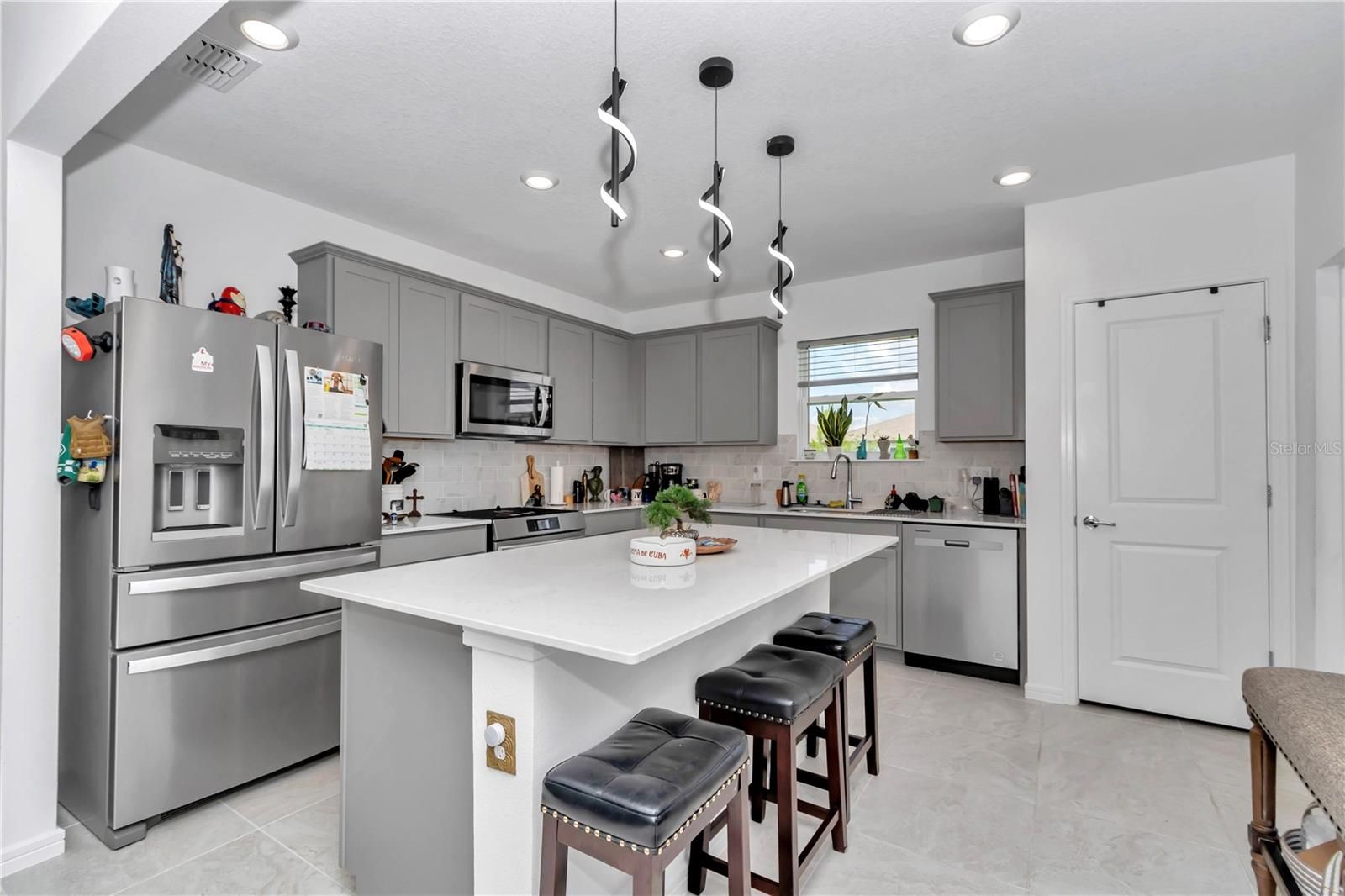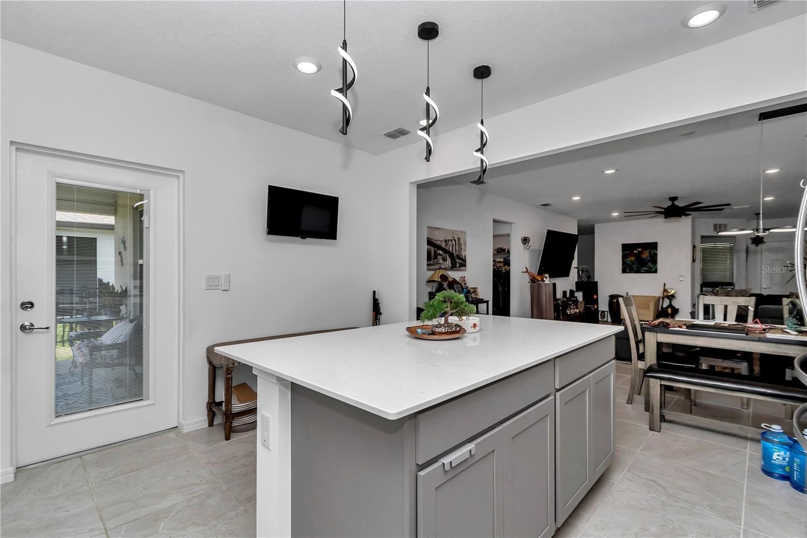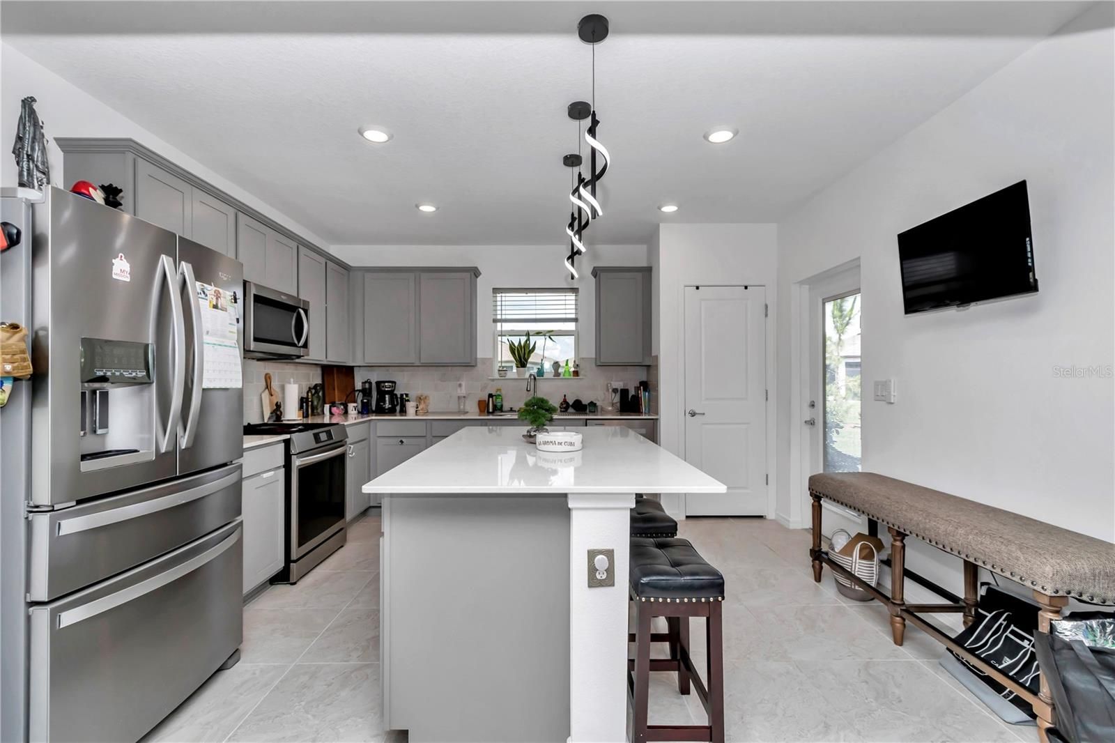Seller motivated in this Candlewood model by Del Webb in Stone Creek a sought after 55+ community with guarded, gated entrance. This golf course and golf cart community features the best of the best amenities! This 2023 Candlewood has the perfect curb appeal with over four grand spent in raised stone gardens featuring a Royal Palm and lighting leading to the covered front porch. The current owner upgraded the the floor when building the home to tile with carpet in the bedrooms. This phenomenal plan features two bedrooms and two bathrooms plus a flex room that could be used for an extra den, hobby room or office. This open floor plan is very inviting with modern finishes. The focal point of the home is the spacious living room, dining and modern kitchen. The kitchen features spacious island with quartz countertops, stainless steel appliances and backsplash. Just off of the living room is the primary bedroom featuring double vanity, countertops and upgraded seamless glass door shower. The second bedroom is across the home and has basically its own bathroom with modern conveniences. There’s a two car garage with tier level storage allowing you to park your car underneath. Step back through the main Living and through the kitchen out to the cupboard lanai into your peaceful backyard. This home has irrigation with wifi, rain gutters, and an additional in upgrades in the home with modern lighting, new fans, wi-Fi thermostat, induction stove. 2025 water softener.The current owner is leaving the 2 TVs in the kitchen and in the spare bedroom. Low HOA and incredible amenities surround you in this one of a kind Candlewood. Golf cart available with an approved offer.