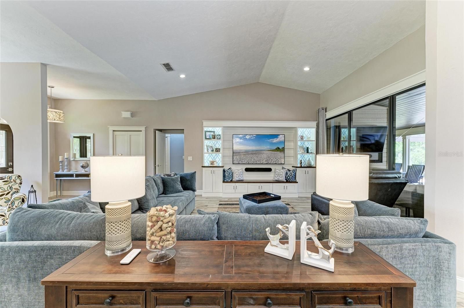 - Built-in Features, Cathedral Ceiling(s), Ceiling Fan(s), Crown Molding, Eat-in Kitchen, High Ceilings, Open Floorplan, Main Level Primary, Solid Surface Counters, Solid-Wood Cabinets, Vaulted Ceiling(s), Walk-In Closet(s), Window Treatments