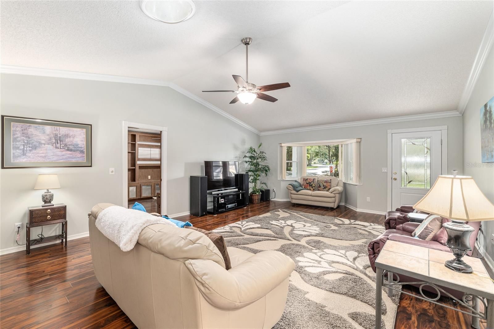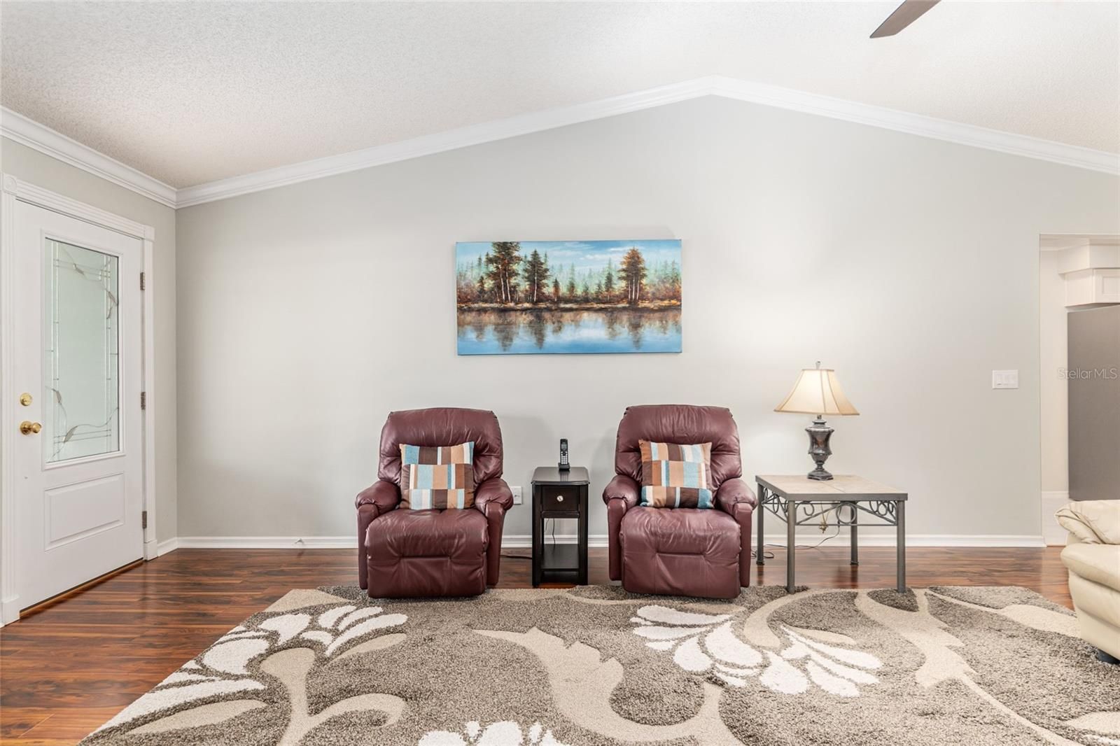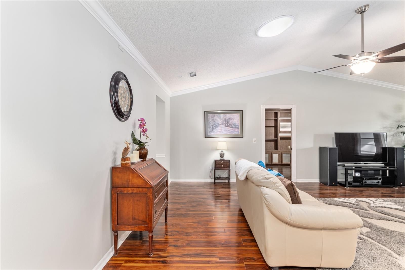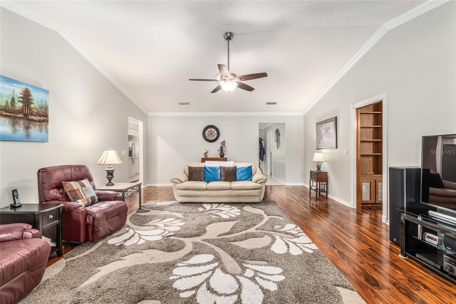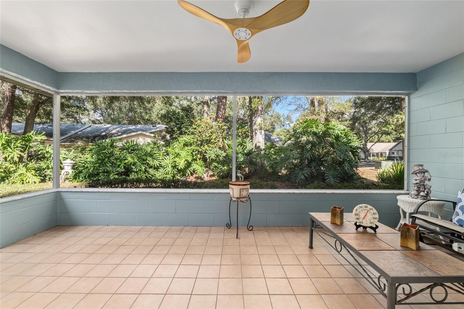 END UNIT with park-like setting! This spacious Augusta end-unit is tucked away on a quiet street in On Top of the World's Friendship Colony. The home features 2 bedrooms, 2 bathrooms, a 2-car garage, and a separate office/den with built-in shelving - one of the few floor plans offering a true third room. Vaulted ceilings, added can lights, and a full glass front door enhance the open, bright feel throughout. The kitchen has been upgraded with new cabinetry, granite countertops, soft-close features, tile backsplash, stainless steel appliances, and a large pantry. The king-sized primary bedroom offers his-and-hers closets, while the primary bath features a step-in shower and updated countertop. This split-bedroom floor plan provides privacy, with a spacious second bedroom offering a walk-in closet and an adjacent bath with a tub/shower combination. Additional highlights include no front neighbors, a private landscaped backyard, updated double-pane windows, a newer roof (2021), a screened lanai, vinyl wood-like flooring and a well-maintained interior. No pets and non-smoking home. Located in the much sought-after 55+ neighborhood of On Top of the World!
