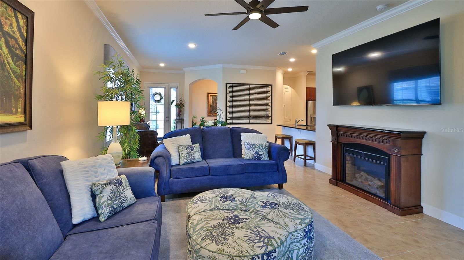 - Ceiling Fan(s), Crown Molding, Eat-in Kitchen, Kitchen/Family Room Combo, Living/Dining Room, Main Level Primary, Solid Surface Counters, Solid-Wood Cabinets, Split Bedrooms, Stone Counters, Thermostat, Vaulted Ceiling(s), Walk-In Closet(s), Window Treatments