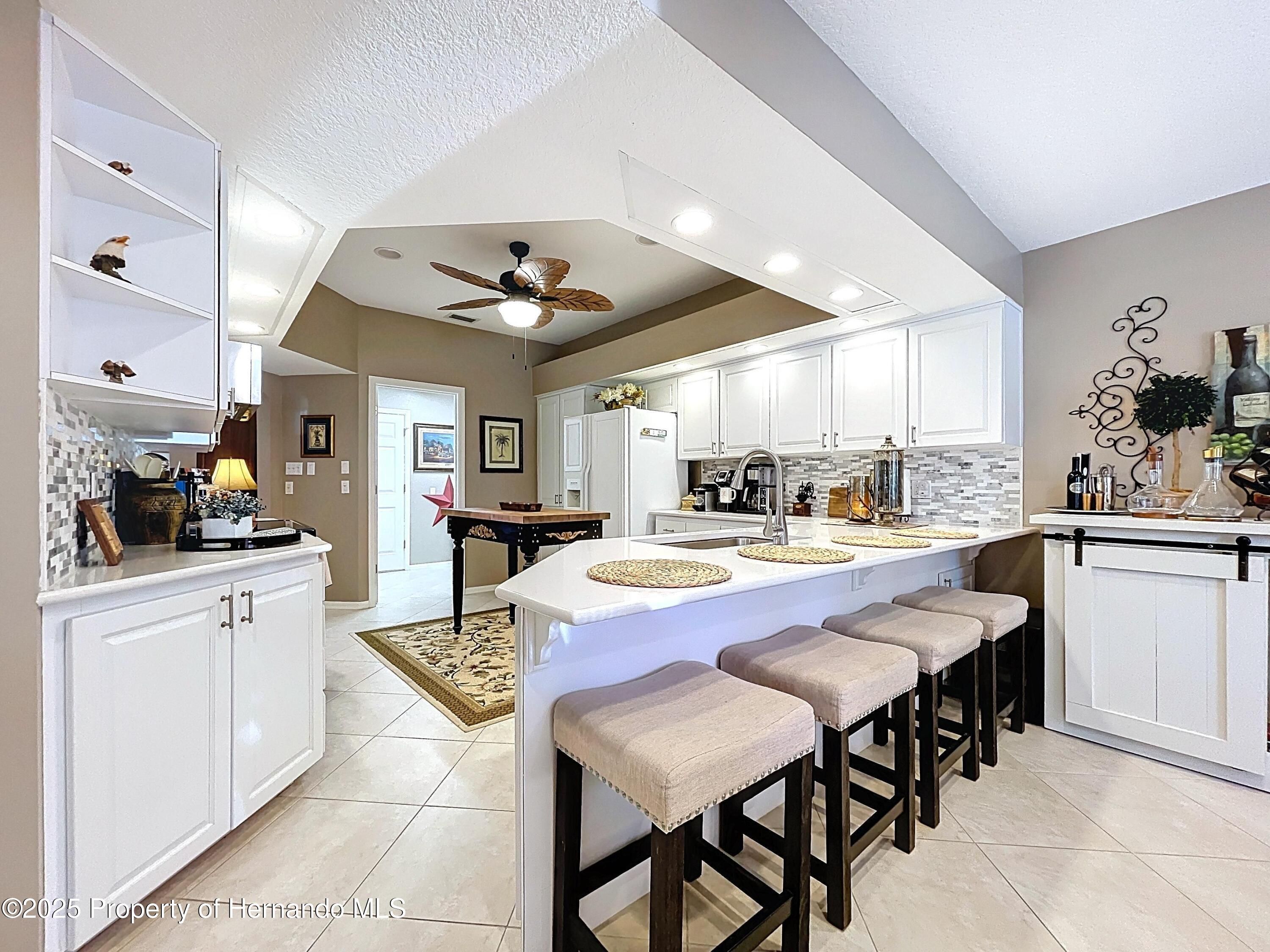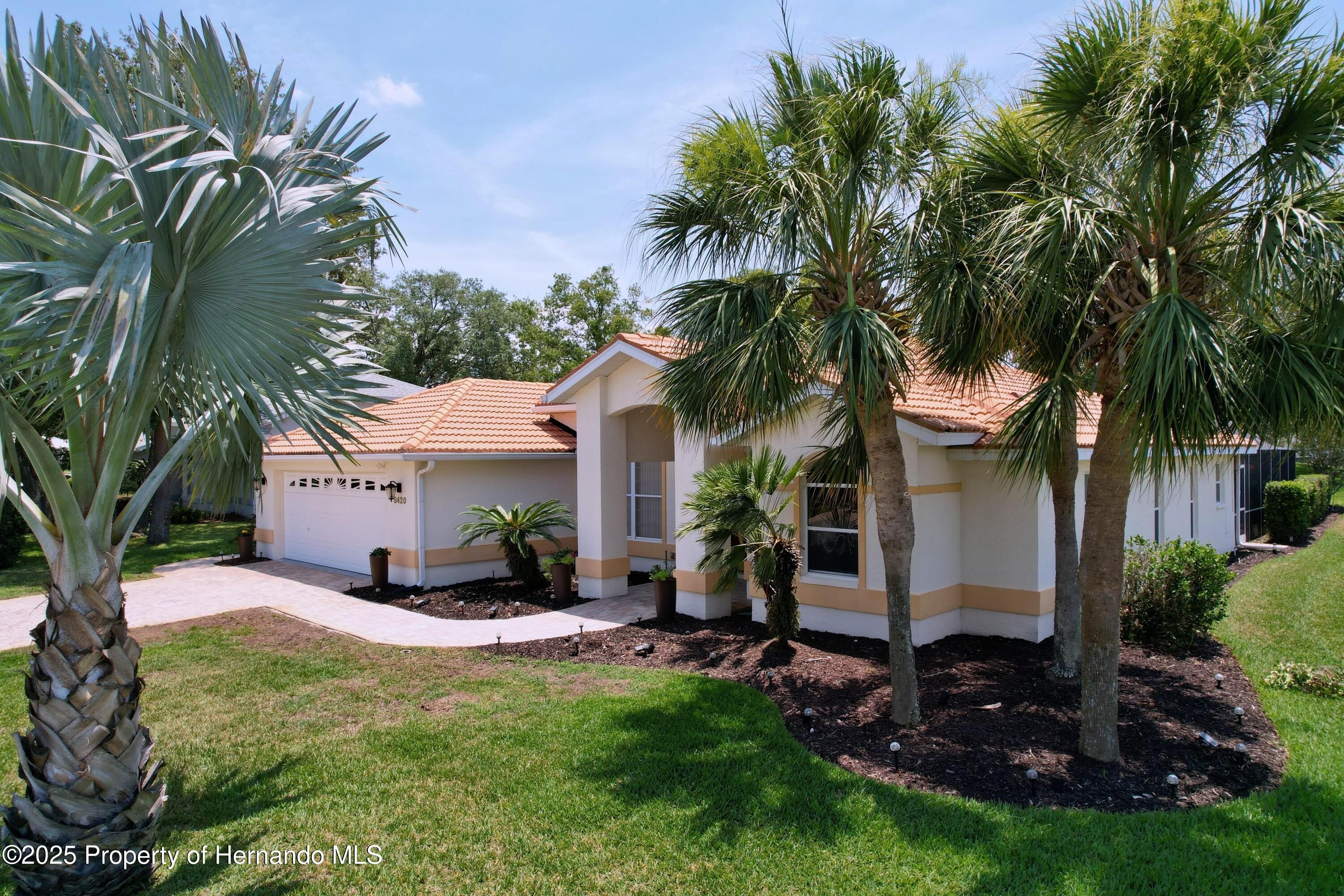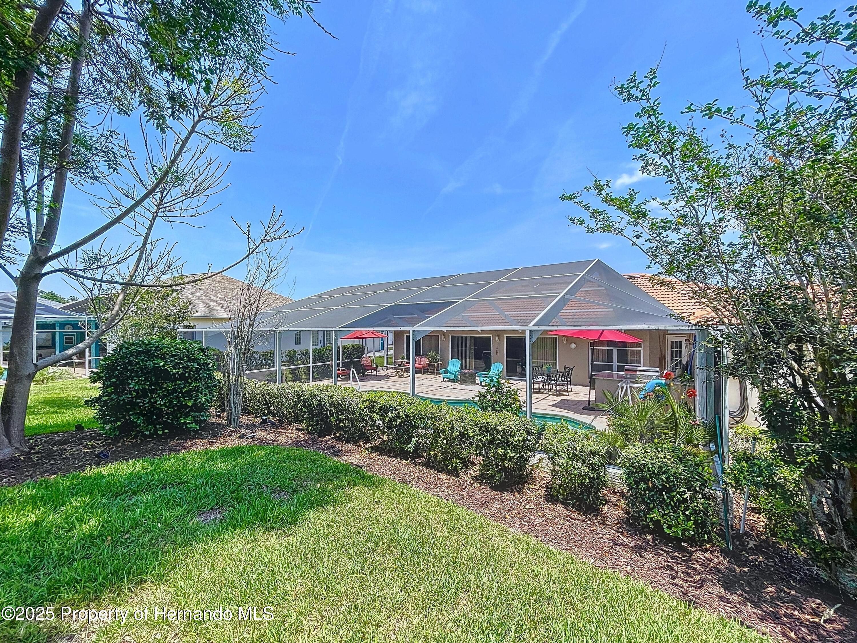 Paradise found in gated Glen Lakes golf course community! This beautiful 3/2/2+golf cart garage pool home with tile roof has everything you've been waiting for. Well-maintained, updated Lindhorst Harmony model has high 10 ft ceilings, crown molding, tile roof, paver driveway and walkways, and beautiful landscaping with outdoor lighting, and irrigation well. New grass plugs coming soon! Step through the double front doors into an open, airy great room with arched entryways, slide-out entertainment shelving, and recessed lighting. Newer paint, light fixtures, fans and flooring throughout. Formal dining room and spacious living area both overlook the screened lanai and pool. Kitchen is bright and open with tray ceiling, center island, newer quartz countertops, marble and quartz backsplash, breakfast bar, pantry cabinet and a sunny breakfast nook! Glass top stove has air fryer feature in oven. Most kitchen appliances just 3 years old. Updated cabinetry and hardware. Oversized master suite features a tray ceiling, two walk-in closets, and sitting area with slider to lanai. Great ''man cave'', workout area, nursery or study. The en-suite bathroom includes dual vanities, garden tub topped with stained glass window, walk-in tiled shower, and separate commode. Split bedroom plan offers privacy. Indoor laundry room includes a pantry closet, cabinets and washer/dryer stay. Huge 10x31 Florida room under A/C gives you flex space for a den, office, or hobby area. Sliders have custom made cornices. Self-cleaning heated pool with waterfall feature in rocky garden area, plus Diamond Brite finish. Polaris pool sweep stays. Pool heater and gear box new in '24, new pool pump '25. Soak up the sun in the sandy beach area with fire pit surrounded by a paver topped lanai. All this plus a gorgeous complete outdoor kitchen, built with granite and stacked stone, for outdoor entertaining. Oversized garage has side door for golf cart storage. Sellers willing to negotiate much of the furniture separately with the buyers. This home has been fully remediated for settlement, is fully insurable, all docs on file. Quarterly fees include cable and internet. Social membership grants access to the clubhouse, Olympic-size heated pool/spa, fitness center, tennis, pickleball, restaurant, bar, and social clubs. Golf memberships are also available. Best part? Club membership is not mandatory for this home! Don't miss your chance to own a slice of Glen Lakes luxury! Buyers can click the chair icon on the Matterport tour to imagine the home unfurnished!