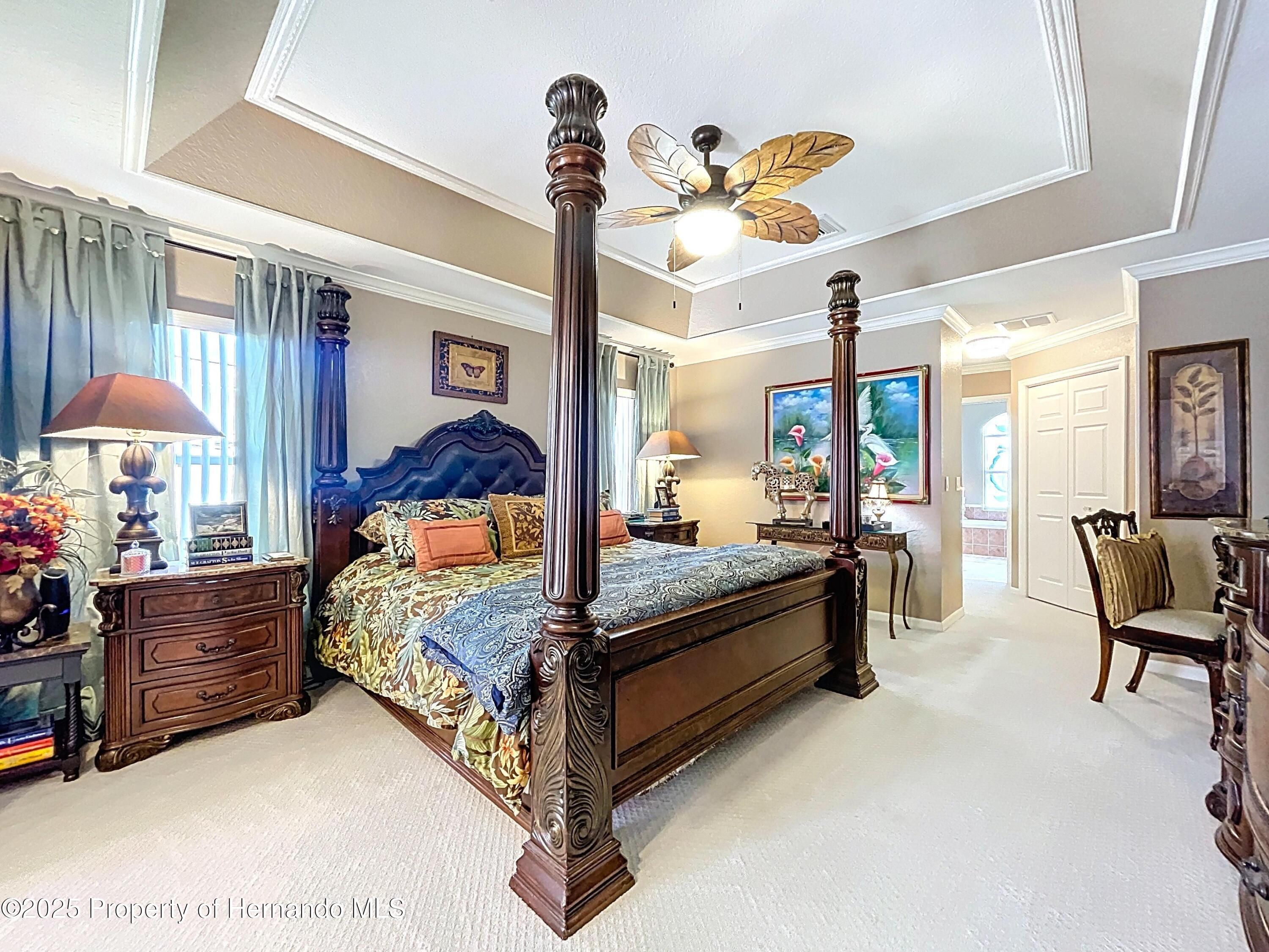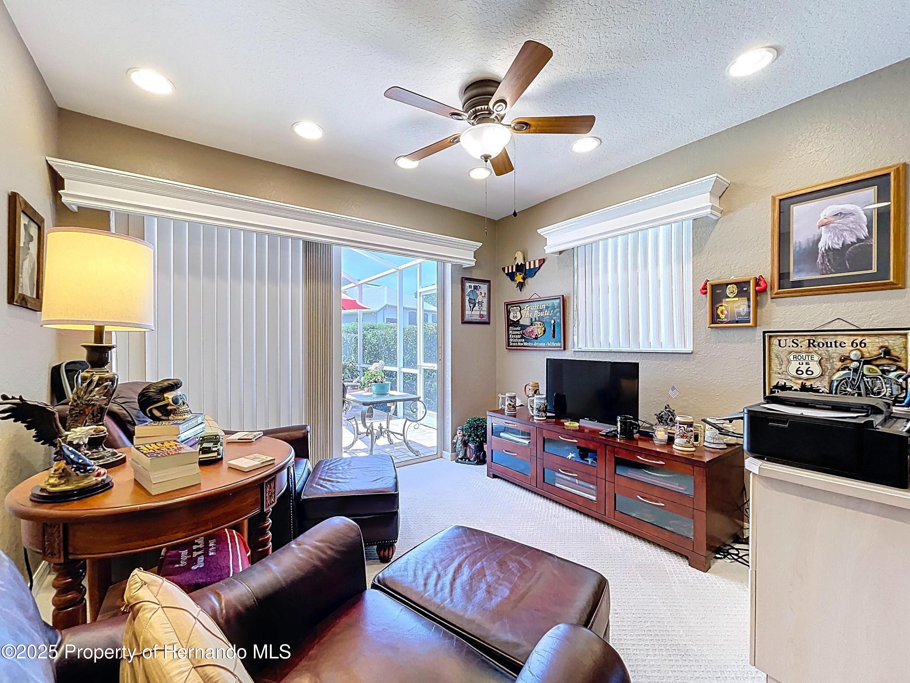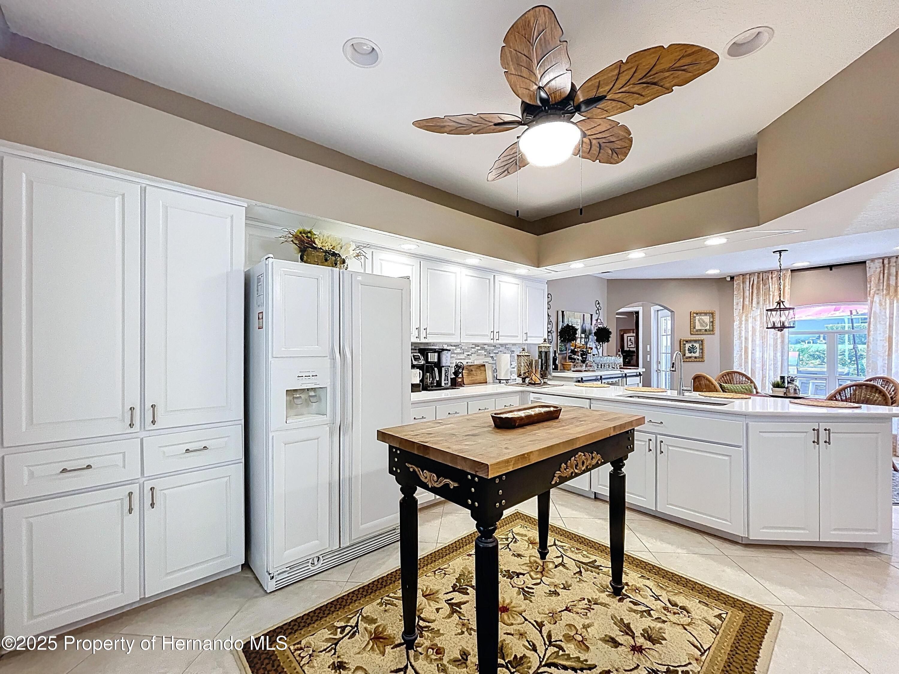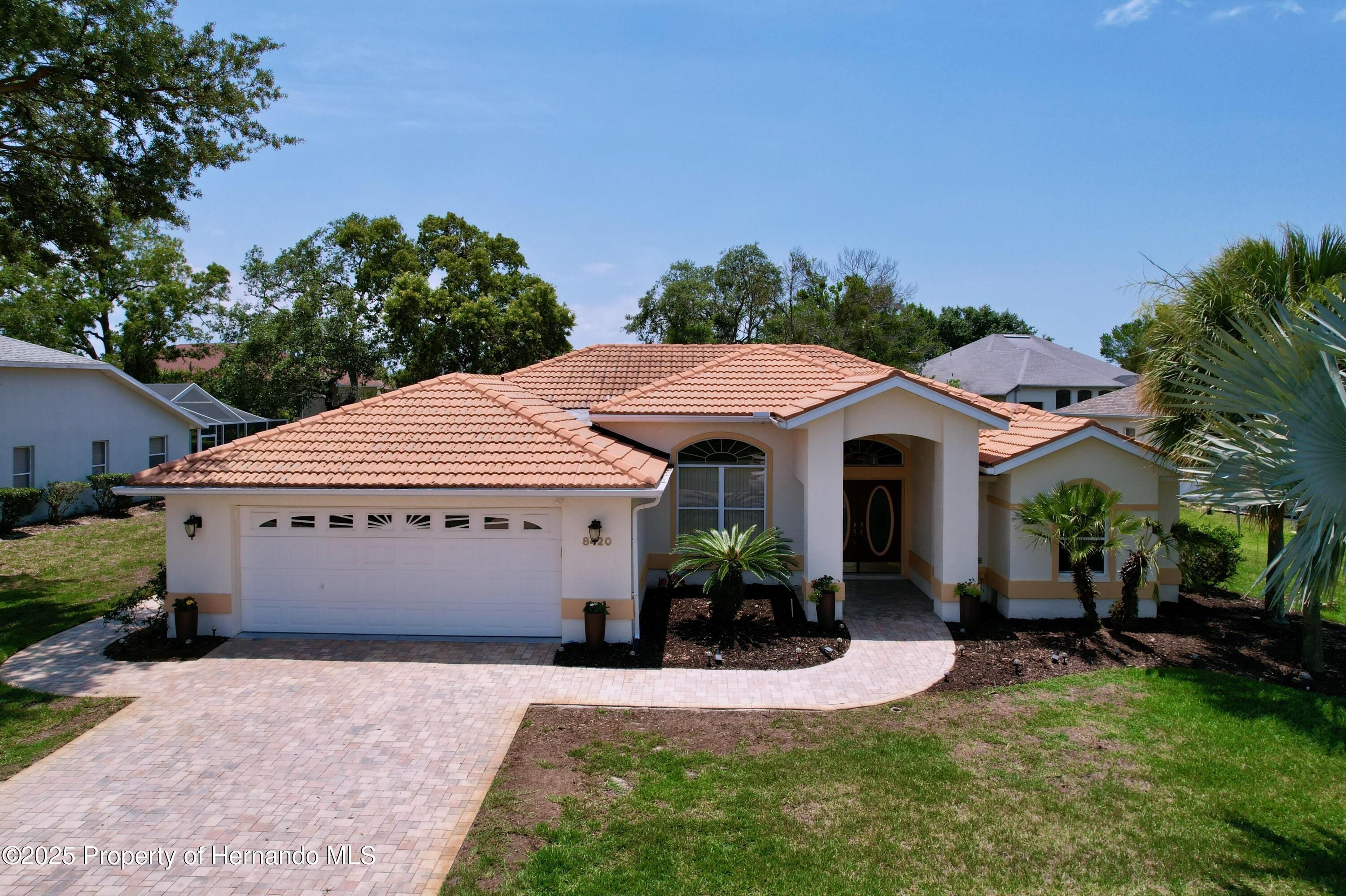 Paradise found in gated Glen Lakes golf course community! This beautiful 3/2/2+golf cart garage pool home with tile roof has everything you've been waiting for. Well-maintained, updated Lindhorst Harmony model has high 10 ft ceilings, crown molding, tile roof, paver driveway and walkways, and beautiful landscaping with outdoor lighting, and irrigation well. New grass plugs coming soon! Step through the double front doors into an open, airy great room with arched entryways, slide-out entertainment shelving, and recessed lighting. Newer paint, light fixtures, fans and flooring throughout. Formal dining room and spacious living area both overlook the screened lanai and pool. Kitchen is bright and open with tray ceiling, center island, newer quartz countertops, marble and quartz backsplash, breakfast bar, pantry cabinet and a sunny breakfast nook! Glass top stove has air fryer feature in oven. Most kitchen appliances just 3 years old. Updated cabinetry and hardware. Oversized master suite features a tray ceiling, two walk-in closets, and sitting area with slider to lanai. Great ''man cave'', workout area, nursery or study. The en-suite bathroom includes dual vanities, garden tub topped with stained glass window, walk-in tiled shower, and separate commode. Split bedroom plan offers privacy. Indoor laundry room includes a pantry closet, cabinets and washer/dryer stay. Huge 10x31 Florida room under A/C gives you flex space for a den, office, or hobby area. Sliders have custom made cornices. Self-cleaning heated pool with waterfall feature in rocky garden area, plus Diamond Brite finish. Polaris pool sweep stays. Pool heater and gear box new in '24, new pool pump '25. Soak up the sun in the sandy beach area with fire pit surrounded by a paver topped lanai. All this plus a gorgeous complete outdoor kitchen, built with granite and stacked stone, for outdoor entertaining. Oversized garage has side door for golf cart storage. Sellers willing to negotiate much of the furniture separately with the buyers. This home has been fully remediated for settlement, is fully insurable, all docs on file. Quarterly fees include cable and internet. Social membership grants access to the clubhouse, Olympic-size heated pool/spa, fitness center, tennis, pickleball, restaurant, bar, and social clubs. Golf memberships are also available. Best part? Club membership is not mandatory for this home! Don't miss your chance to own a slice of Glen Lakes luxury! Buyers can click the chair icon on the Matterport tour to imagine the home unfurnished!