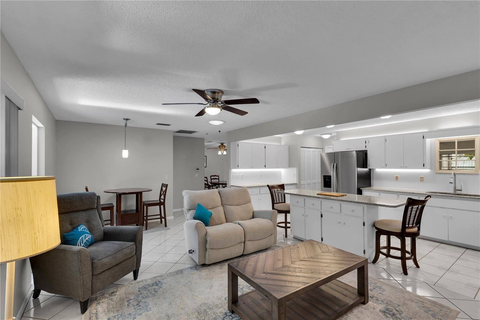 Welcome home to this well-maintained 2 bedroom, 2 bathroom, 2-car garage end-unit patio home located in the established On Top Of The World community. The end-unit location provides added privacy and natural light, and the enclosed Florida Room offers a comfortable space to relax year-round. Inside the home you will find thoughtful updates that blend comfort and functionality. The kitchen features granite countertops and commercial-grade under & above-cabinet lighting, while five solar tubes throughout the home bring in abundant natural light and help keep electric bills lower. Updated decorative ceiling fans add a modern touch, and newer bedroom carpeting enhances comfort. Both bathrooms have received recent updates with new toilets and bath faucets, as well as the HWH being replaced for peace of mind. The roof was replaced in 2020 and the interior was painted in 2021, creating a fresh, neutral feel ready for your personal style. Residents of On Top Of The World enjoy an impressive array of amenities, including multiple clubhouses, indoor and outdoor pools, fitness centers, golf courses, walking and biking trails, hobby studios, pickleball and tennis courts, and a wide variety of clubs and activities designed to support an active, social lifestyle. Convenient access to shopping, dining, and medical facilities makes day-to-day living easy and enjoyable. This move-in ready patio home offers low-maintenance living with modern updates in a community known for its amenities and lifestyle.