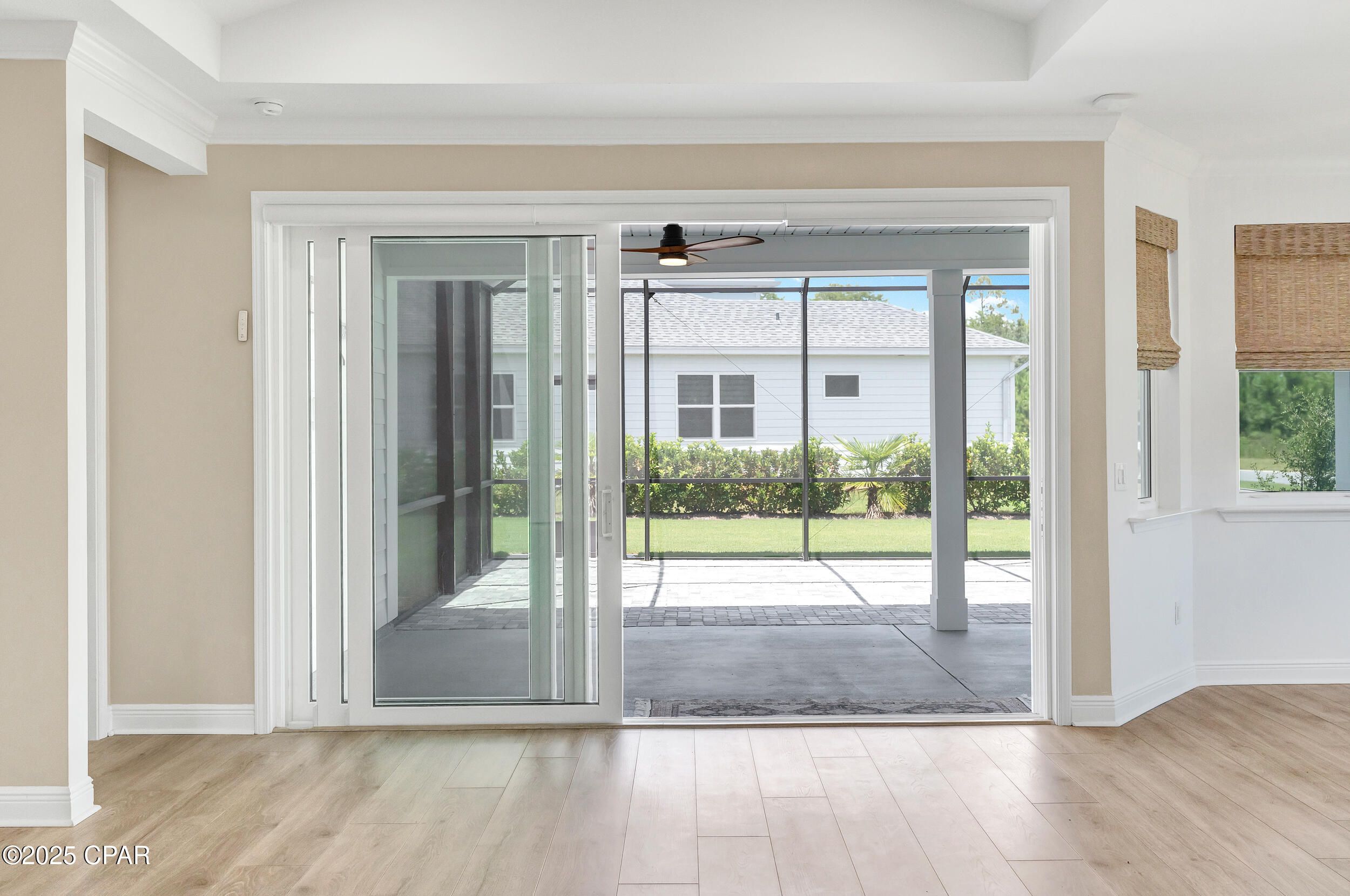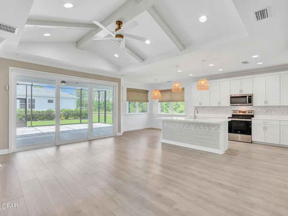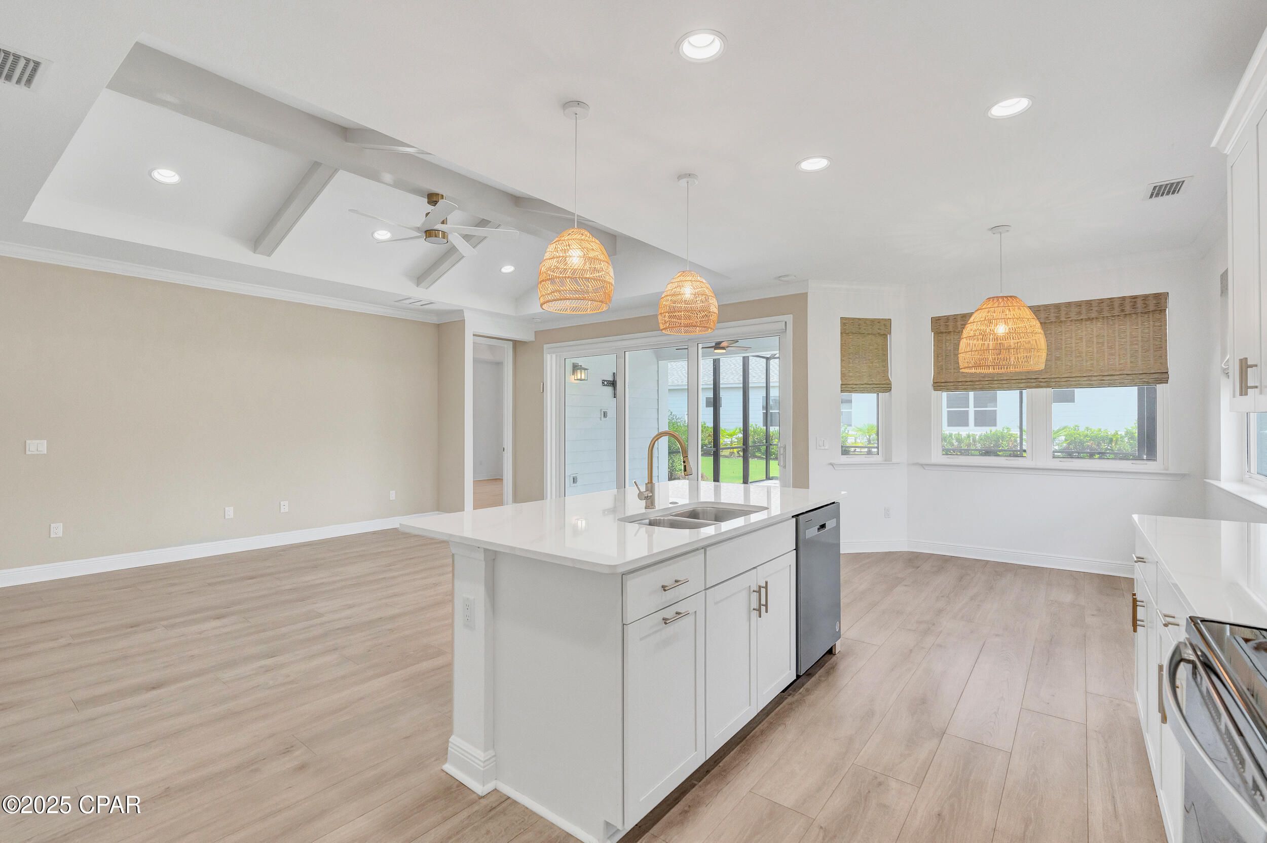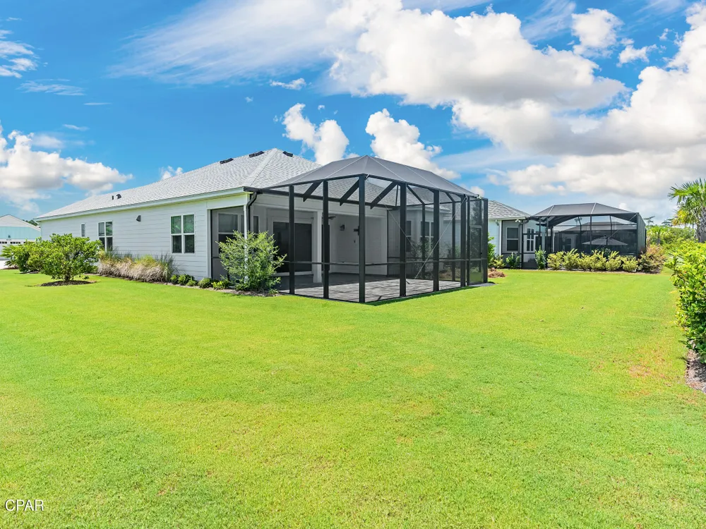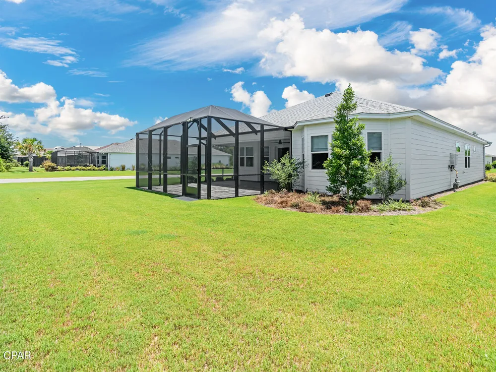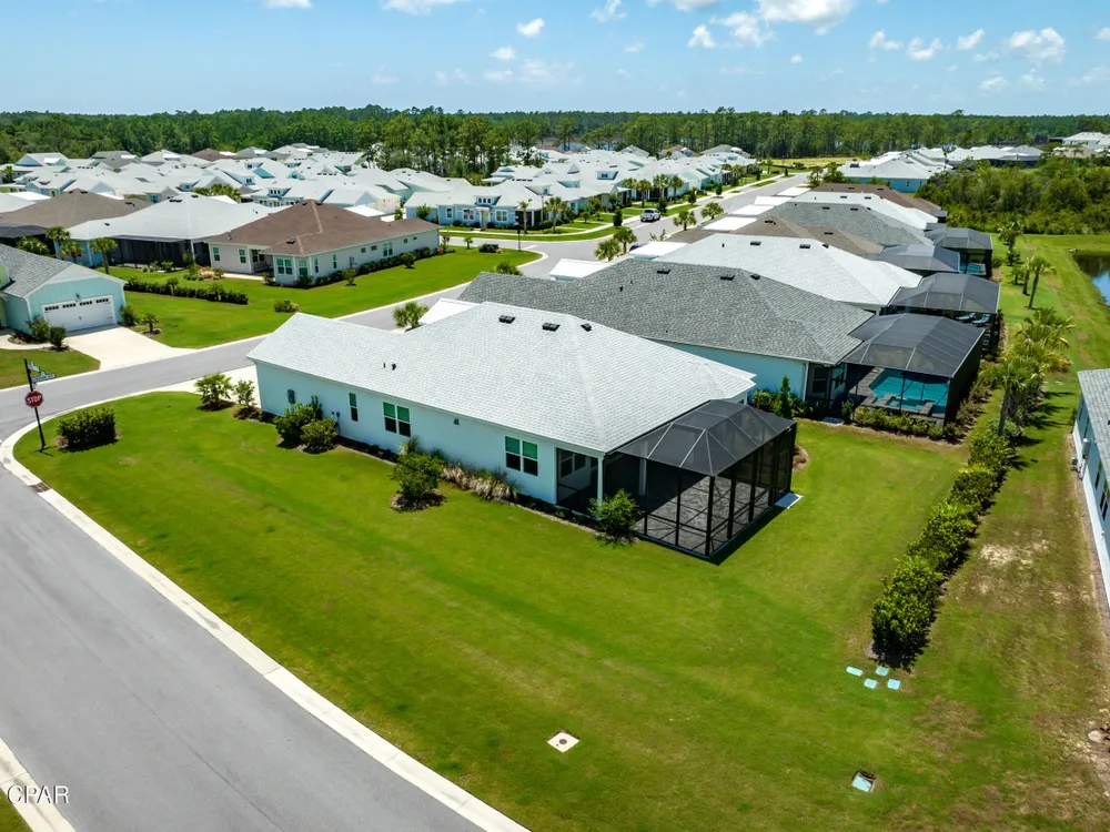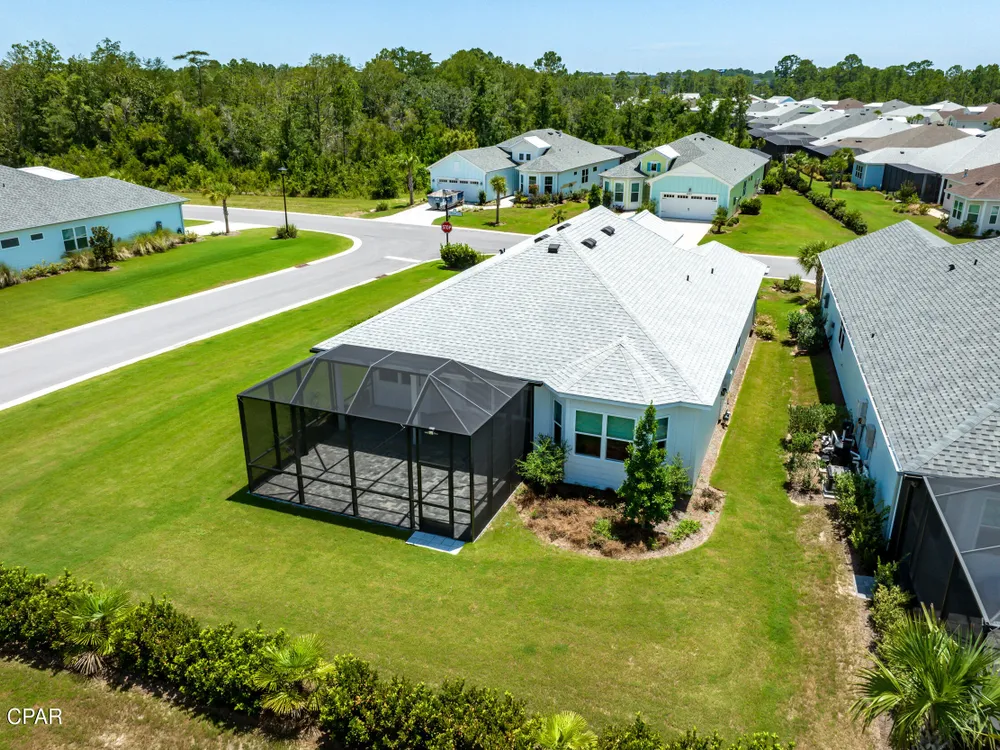 MOVE IN READY HOME AT LATITUDE AT WATERSOUND! OWNER FINANCING OPTIONS AVAILABLE. Why settle for new construction that is further away from the Town Square amenities? This beautifully maintained home is ideally situated on a spacious corner lot with a large side yard abutting a non-through street—offering privacy, quiet, and minimal traffic. Just five minutes from the world-class amenities of Latitude at Watersound, this home delivers the perfect blend of comfort, style, and convenience. From the moment you arrive, the curb appeal stands out, thanks to the generous lot size and carefully considered upgrades. Step inside to soaring cathedral ceilings and an airy, open layout. To your right, a hallway leads to a spacious two-car garage with pull-down stairs for easy attic access and abundant storage The nearby laundry room is outfitted with custom shelving and cabinetry to keep everything organized and tucked away. Two guest bedrooms and a full shared bath are located just off the foyer, while a formal dining room with double-door access adds versatility and elegance. The main living space is truly the heart of the home which include thoughtful upgrades that make all the difference. You are sure to appreciate the striking beamed ceilings, automatic blinds, and seamless access to the extended screened-in patio perfect for relaxing or entertaining outdoors. The patio includes pavers, full screening, a TV mount. There is room to add a pool if desired. The kitchen is both stylish and functional with quartz countertops, stainless steel appliances, a center island with breakfast bar, and a credit toward a new refrigerator offered at closing. Tucked away for privacy, the primary suite offers a tranquil retreat with a tray ceiling, double walk-in closets, and a lovely bay window. The ensuite bath features a large walk-in shower with floor-to-ceiling tile and a bench, a wraparound double vanity, and a linen closet for added storage. As a resident of Latitude at Watersound, you'll enjoy access to a vibrant 55+ community with top-tier amenities including a resort-style pool, state-of-the-art fitness center, on-site restaurants and bars, walking trails, pickleball and tennis courts, live entertainment, and more offering the ultimate Florida lifestyle just minutes from the beach.
