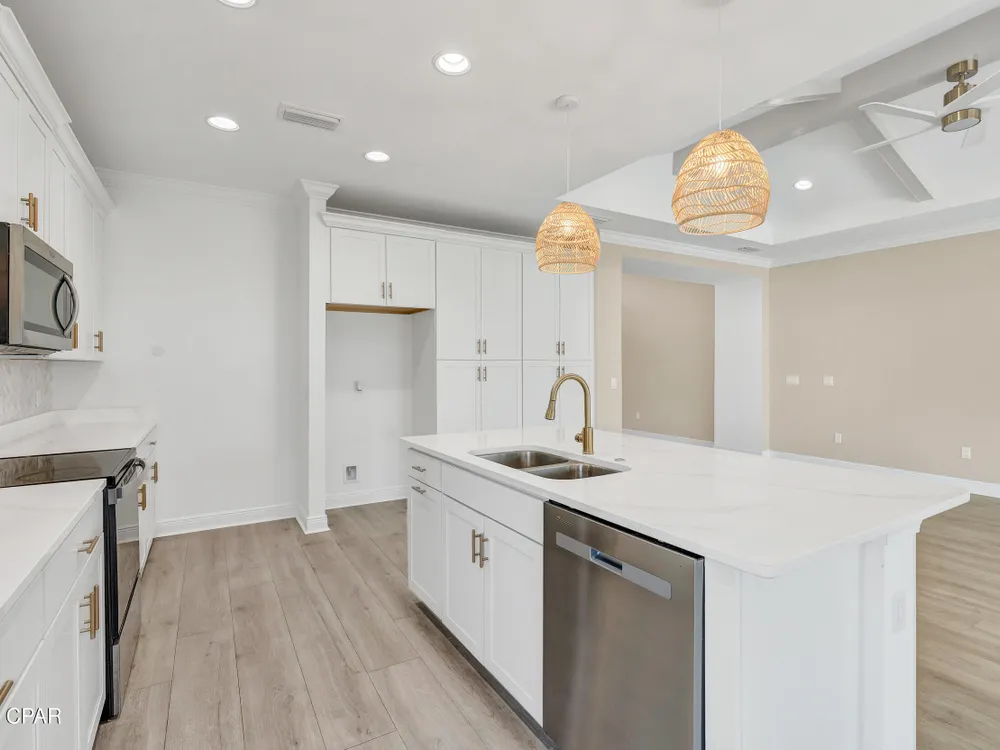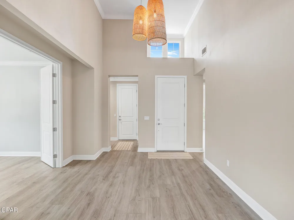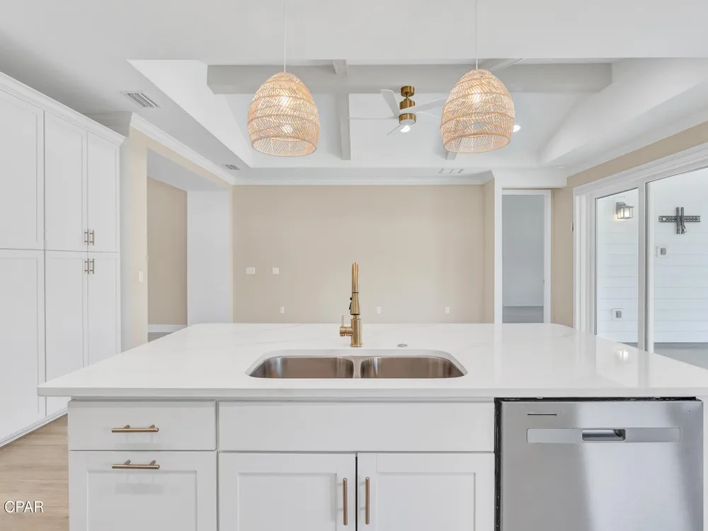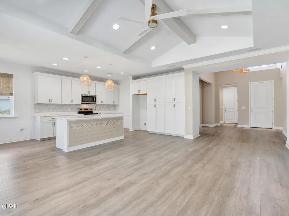 - Attic Access, Beamed Ceilings, Crown Molding, Cathedral Ceiling(s), Kitchen Island, Pull Down Attic Stairs, Split Bedrooms, Window Treatments