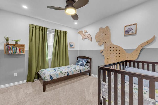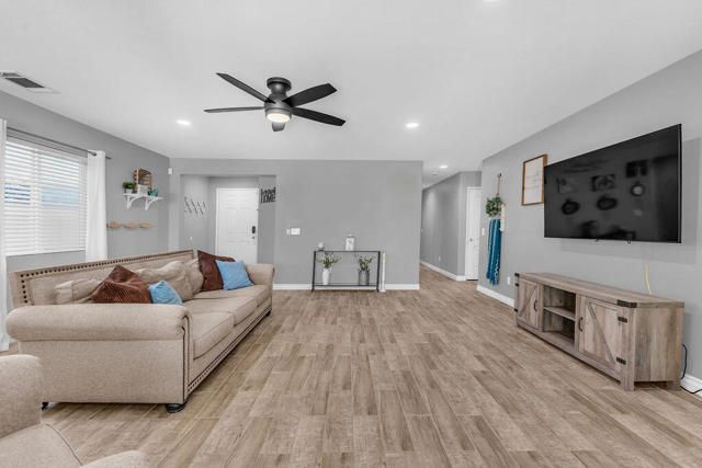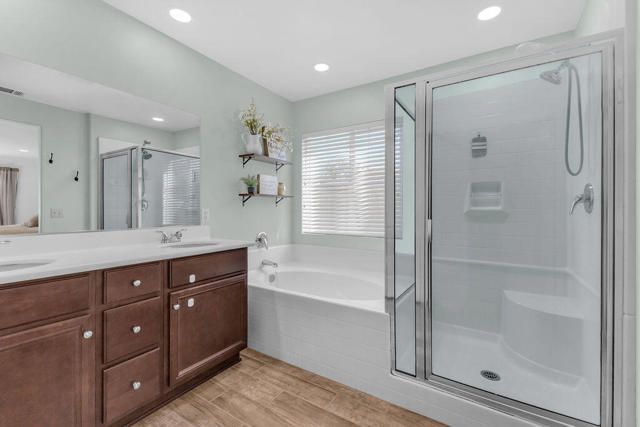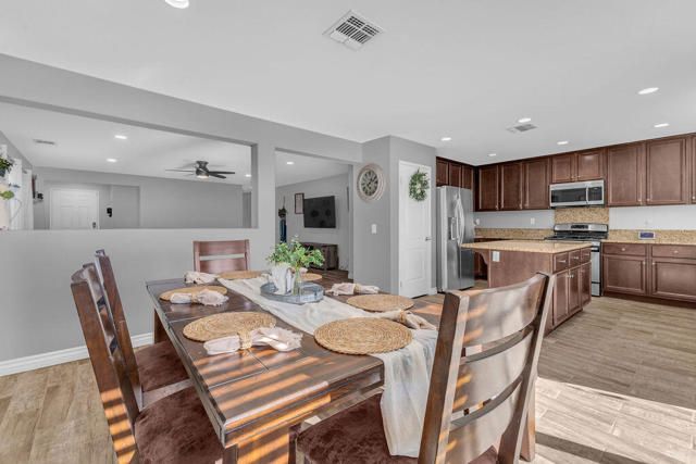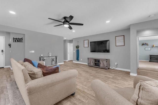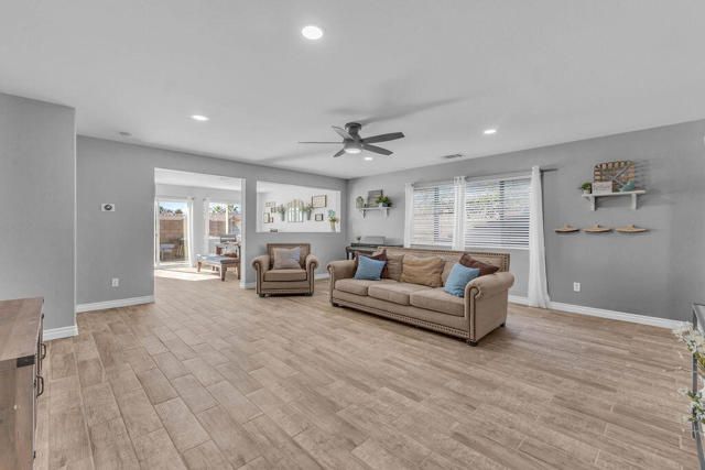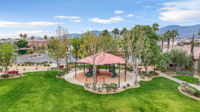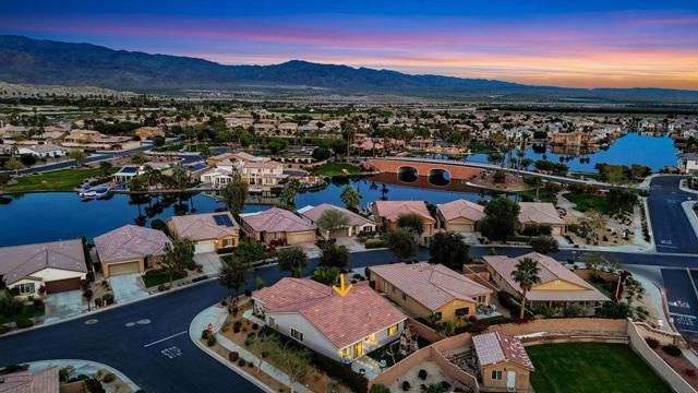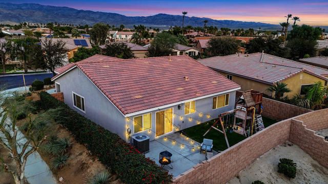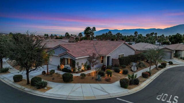 Beautifully updated home on a premium corner lot featuring new, stylish, low-maintenance front landscaping with accent lighting. The exterior of the house was repainted in an updated color scheme. The interior features tile flooring in all but the bedrooms and energy-efficient LED lighting throughout. This smart home offers integrated lighting, TV, audio controls, and a smart front door lock for modern convenience. Move-in ready, this home features 4 bedrooms, 2 bathrooms, and a spacious great room. The kitchen is designed for both functionality and entertaining, offering granite countertops, a gas range, a spacious pantry and center island, and a formal dining area just off the kitchen. The expansive primary suite is a true retreat, complete with a dual-sink vanity, separate soaking tub and shower, and an oversized walk-in closet. Three additional bedrooms are thoughtfully positioned away from the primary suite for added privacy, with a hallway bath ideal for guests. The garage is equipped with a mini-split system and a Tesla charger. Located in the guard-gated, picturesque community of Terra Lago, residents enjoy access to a 22-acre recreational lake, scenic walking paths, and a clubhouse featuring a large fitness center, pool, spa, playground, and catch-and-release fishing, with approved boating on the lake. Community parks add to the resort-style lifestyle. Terra Lago allows short-term rentals and offers a prime location near hiking, shopping, dining, and entertainment, including Acrisure Arena and Fantasy Springs Casino, with easy freeway access to surrounding desert cities. Golf enthusiasts will appreciate the adjacent Terra Lago Golf Club. HOA dues include basic cable FIOS TV and Wi-Fi internet. Come see this exceptional home, you won't be disappointed!