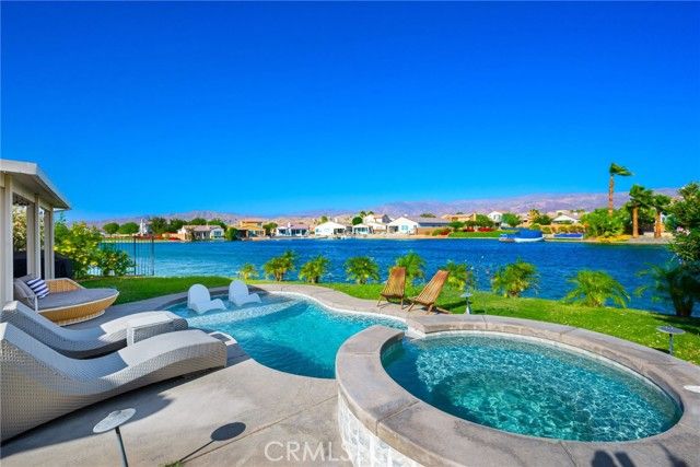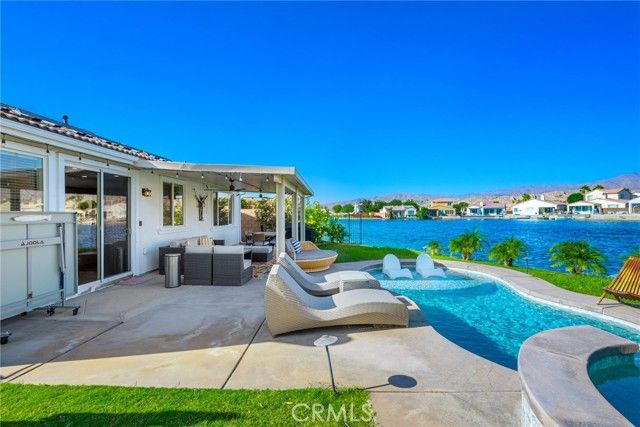 WOW... Lowest Priced Lake Front Home!Terra Lago Lake One Story Detached Pool/Spa Home by Woodside, Former Model. Featuring 4 bedroom, 3 beautifully updated baths with East Facing Leisure view of Lake, Mountains and Terra Lago's Signature bridge. Updated Chef's Kitchen with center island, quartz counter tops, Newer Stainless Steel appliances, Fridge Included. Spacious Great room, dining area. The primary bedroom offers Lake, Mountain view! Walk in closet, the large ensuite primary bath offers updated vanity with dual sink, separate tub and shower. 3 Guest Bedrooms all with walk in closets. Built in speakers. Sep outside to the private large entertainers back yard with grass area, salt water pool & spa, Recent upgrades include newer laminated flooring and paint throughout, Solar, tankless water heater, newer AC System! Aluma wood patio cover with misters. Great Location, walk to Clubhouse, easy access to Avenue 43 gate for shopping, dining, entertainment, nearby New Acrisure Arena for awesome concert events, Ice Hockey and more! Terra Lago allows Short Term Rentals. Resort Style Living At Its BEST!!!