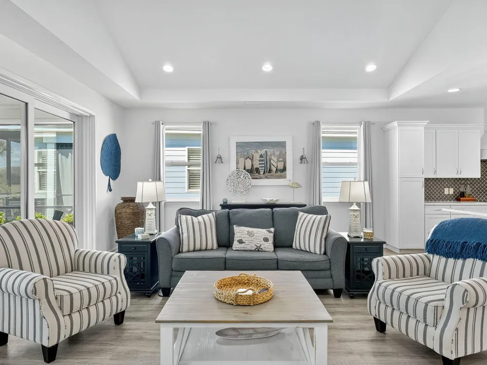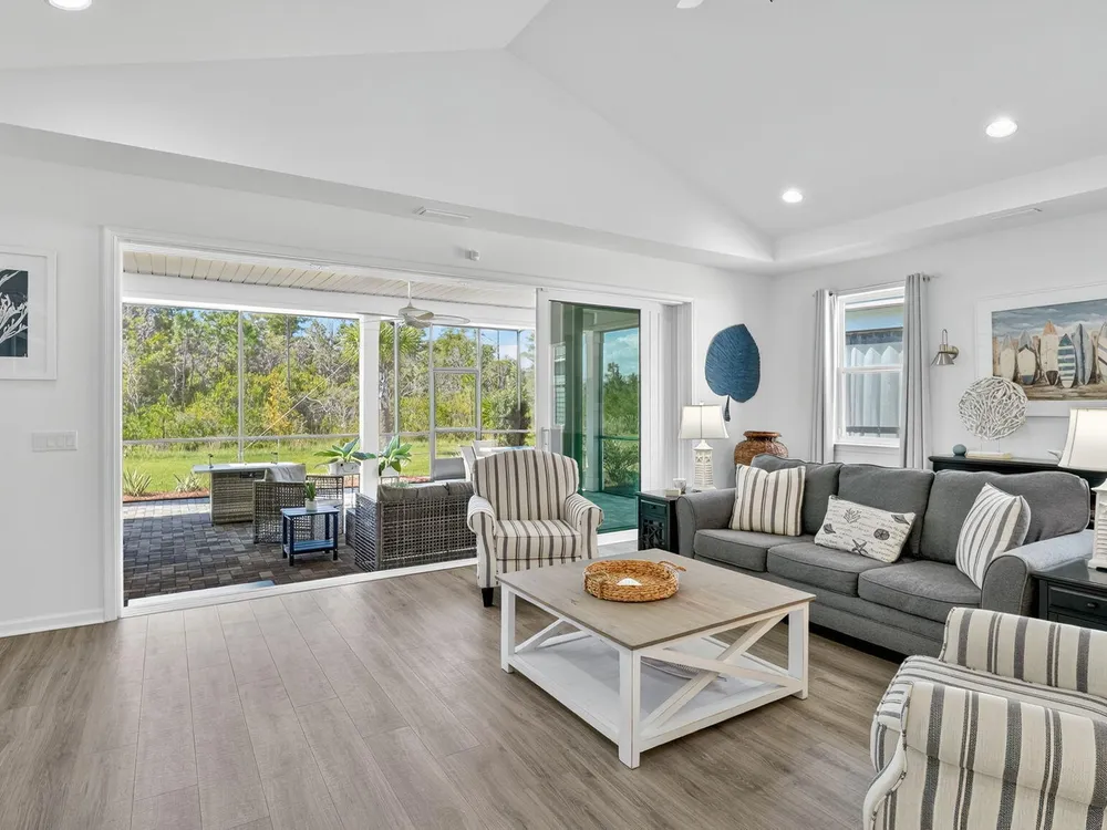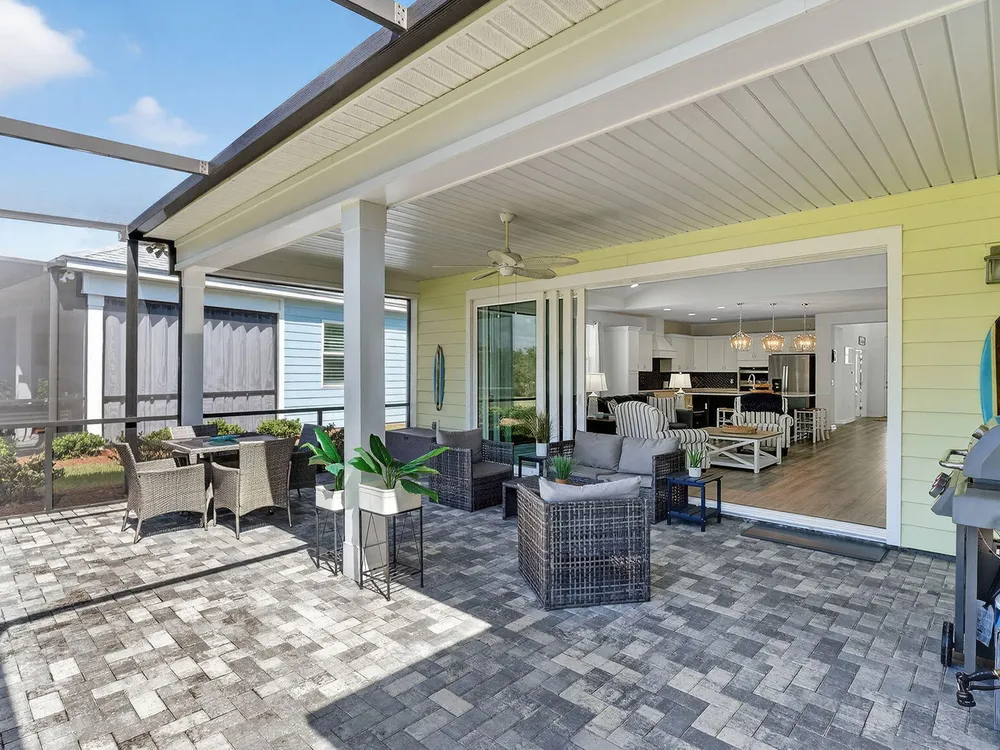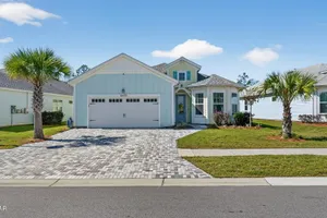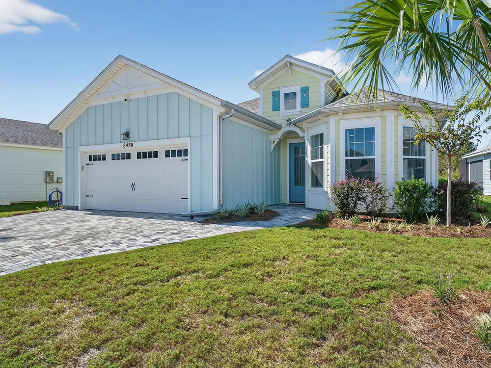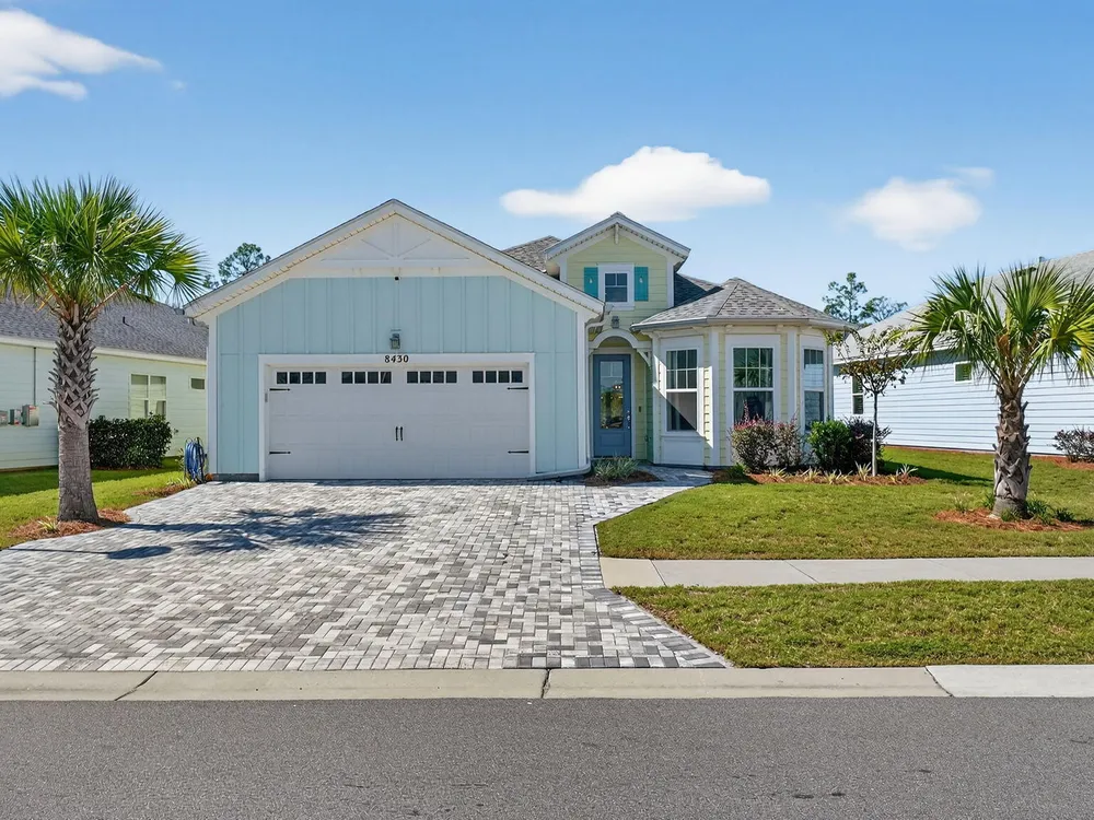 Why wait to build when you can have this incredible Breeze Bay Beach Collection home NOW! Seller's were part time so it's basically a new home! In Phase 3 so it's close to the wonderful amenities at Latitude Margaritaville. Pavers in driveway which was widened for room for a golf cart! Nice size entry has a custom keydrop area. The den has custom cabinets and glass French doors! 42'' cabinets in kitchen with beautiful large Cambria countertops for entertaining. Navy tile backsplash adds style to the kitchen! The Living room is huge! Plenty of room for all types of furniture with brass outlet in the floor. The dining niche has custom board and batton on the wall for added decorative flair! The master is large with a trey ceiling and two large closets . The bathroom has dual sink areas with the tiled shower having a custom sitting area in the corner, seamless glass around the shower. Both full baths have extended wall tile to ceiling. The laundry room has a sink and upper cabinets. The screened lanai is extended and has a wooded preserve behind it for a nice relaxing environment! The garage floor is finished with epoxy. Motion sensor lights on corners of home, as well as gutters on all four sides The golf cart is for sale as well as all furnture, too! Latitude at Watersound has incredible amenties from the Last Mango Theater to a state-of-the-art fitness center, to a resort styled pool, two areas for the restaurant on the intercoastal waterway. 9 pickleball courts, tennis courts, boche ball area, outdoor pool and ping bong area with a cornhole area! The fun never ends! Band/DJ on weekends, live music at the pool every day from 12:00-3:00 or if it's rainy or cold they are inside! Come see this incredible home!