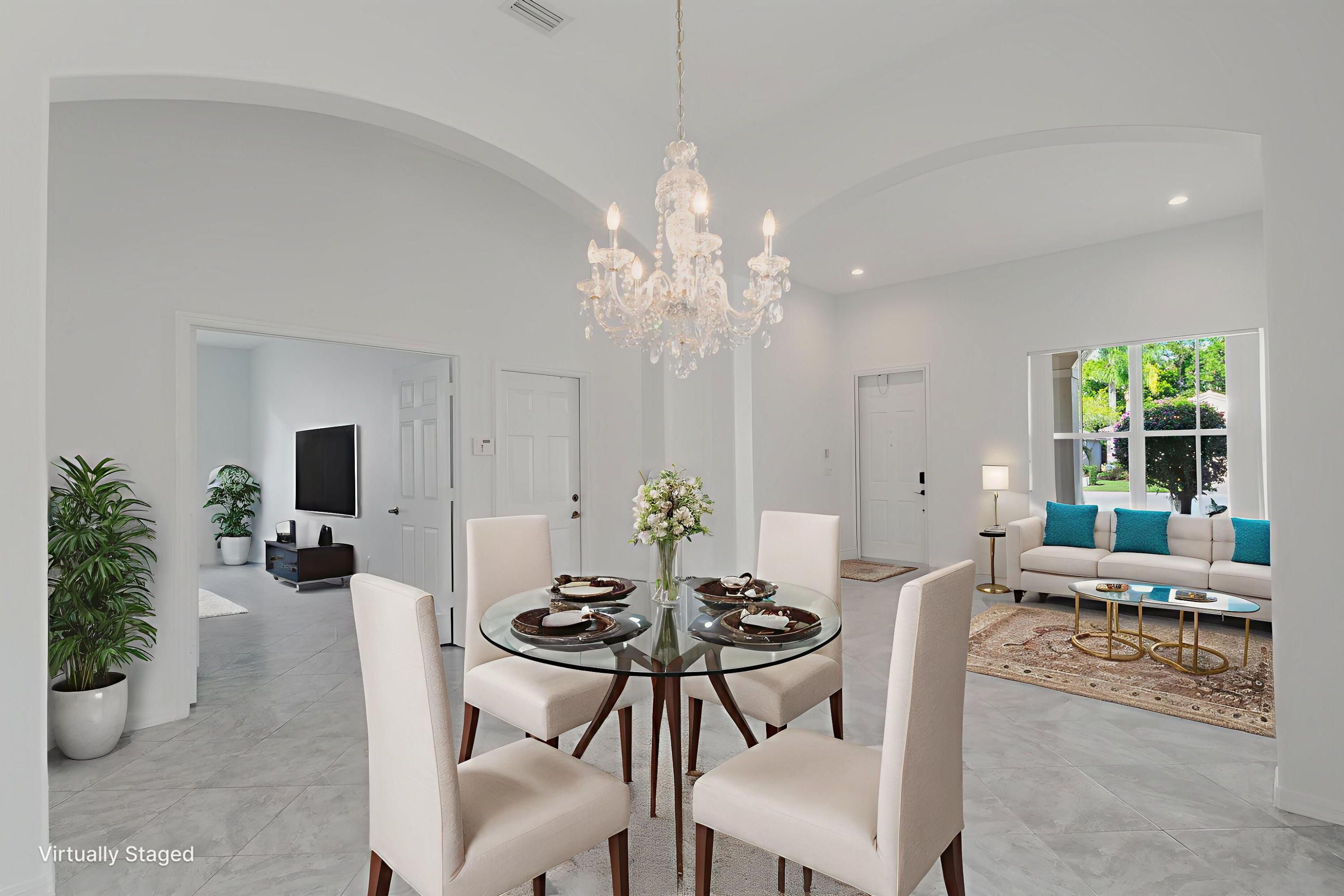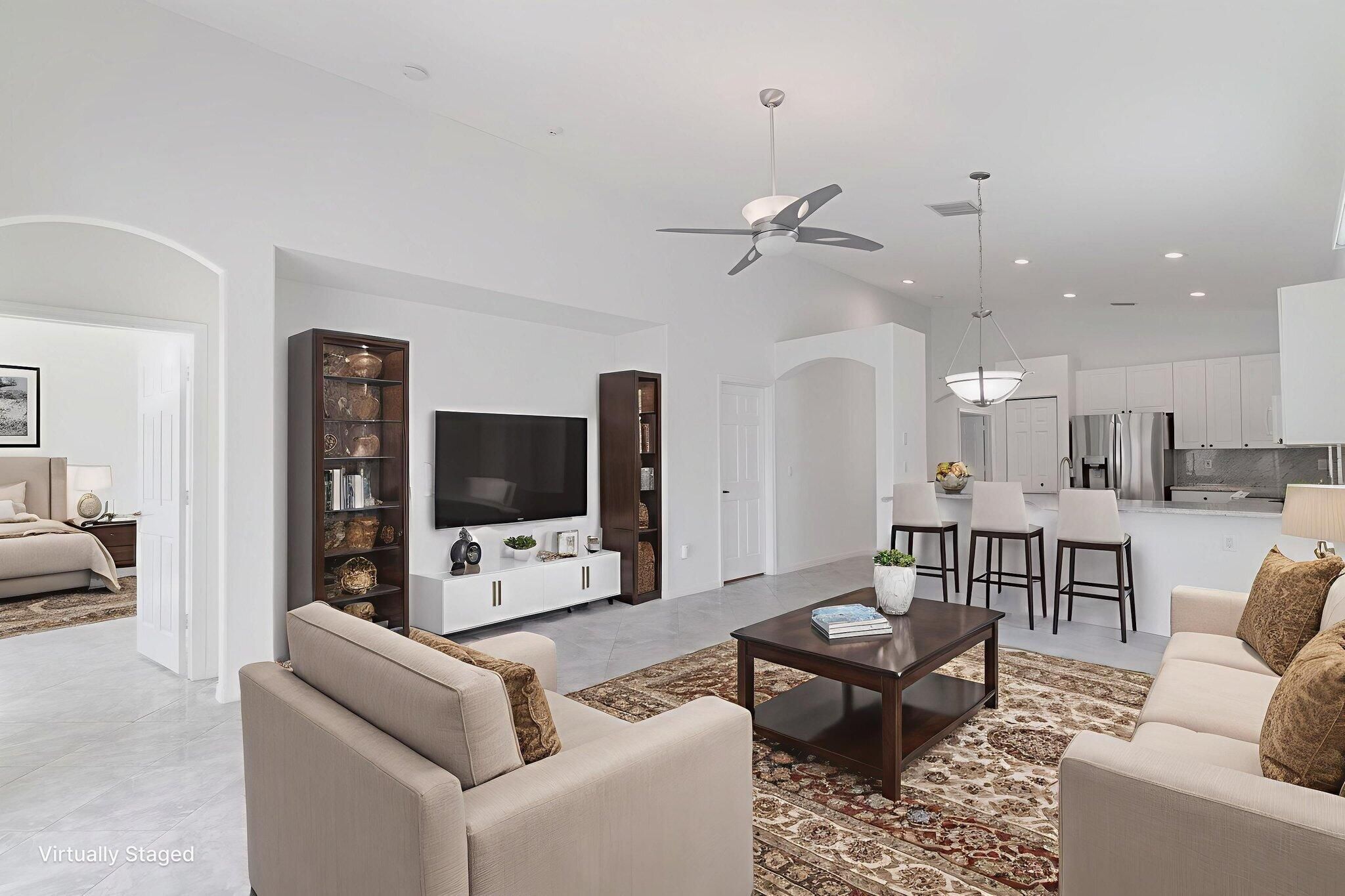 Immaculate, light-filled 3-bedroom, 2-bath single-family home located in the luxurious gated 55+ Venetian Isles community. Freshly painted with graciously sized rooms. Covered entry porch and an enclosed back porch overlooking pavers and a peaceful backyard. The primary suite offers two large closets and an updated bath with stall shower and separate tub. Tastefully updated 2nd bathroom. A/C 1 year old. New hot water heater. Venetian Isles is a beautiful 55+ Mediterranean-style community featuring a spectacular 26,000 sq ft clubhouse with state-of-the-art fitness center, aerobics studio, sauna, library with computers, billiards, theater, card rooms, arts & crafts studio, & ballroom. Outdoor amenities include tennis, bocce, shuffleboard, a lap pool, resistance pool, and a lagoon-style po Newer air conditioner and water heater.