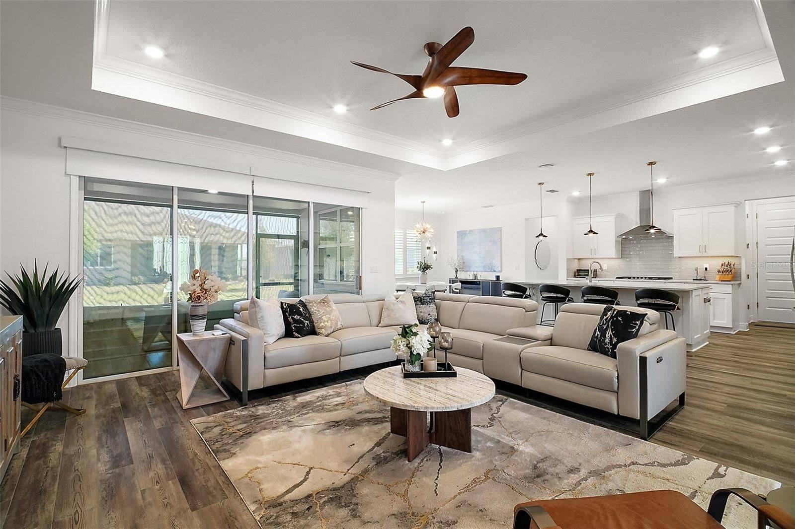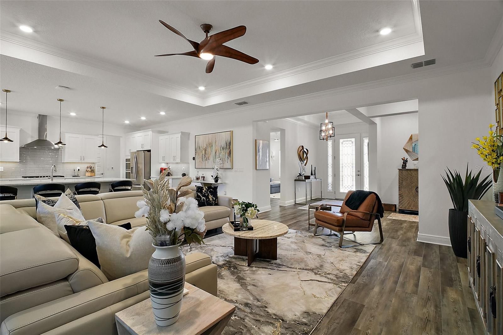 - Ceiling Fan(s), Crown Molding, High Ceilings, Open Floorplan, Main Level Primary, Solid Surface Counters, Split Bedrooms, Tray Ceiling(s), Walk-In Closet(s)