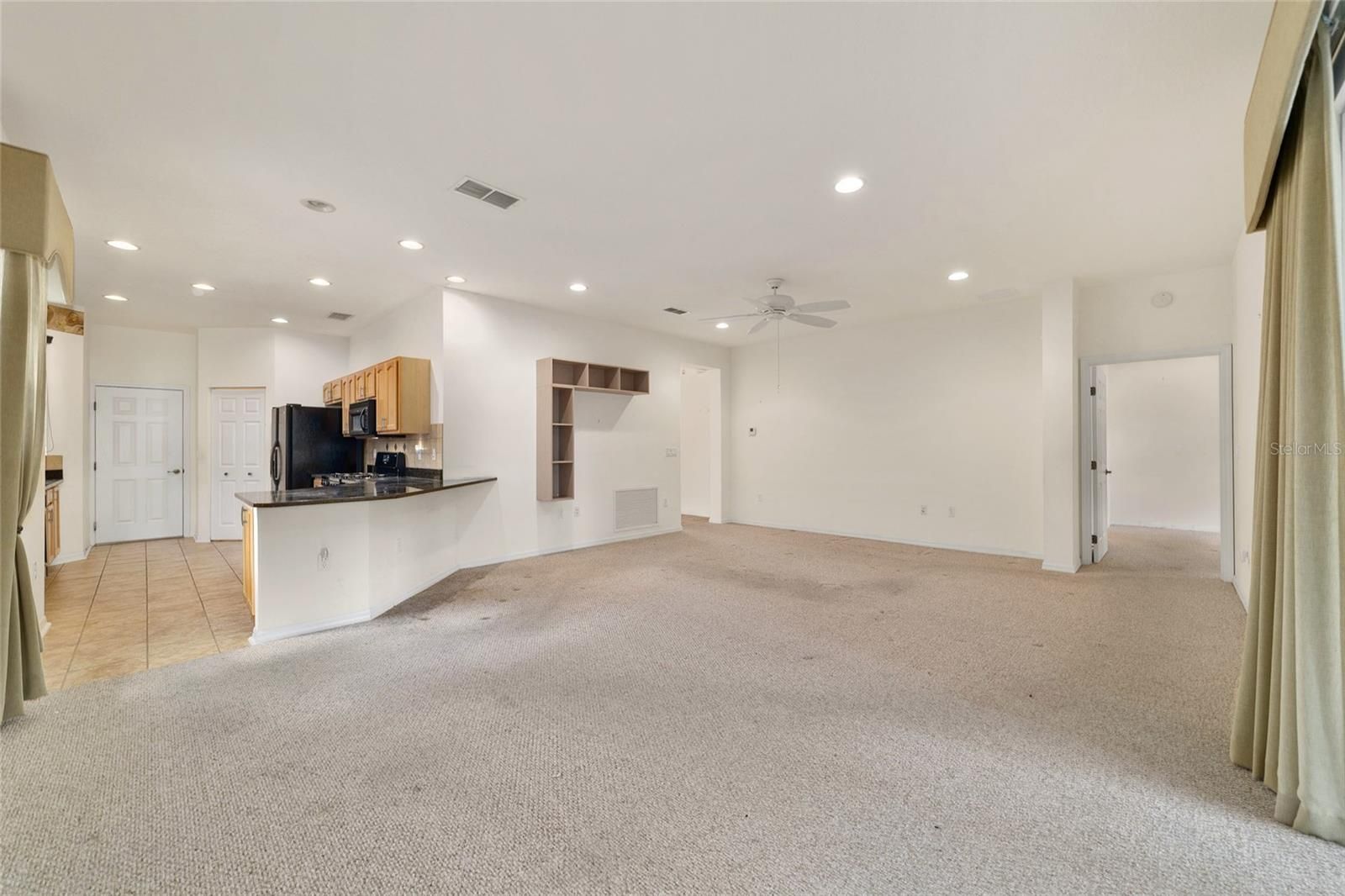- Built-in Features, Ceiling Fan(s), High Ceilings, Open Floorplan, Main Level Primary, Solid-Wood Cabinets, Stone Counters, Walk-In Closet(s)