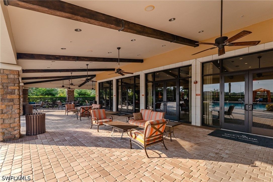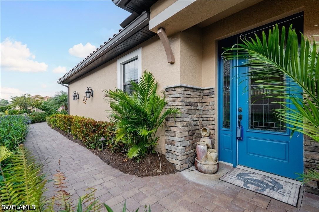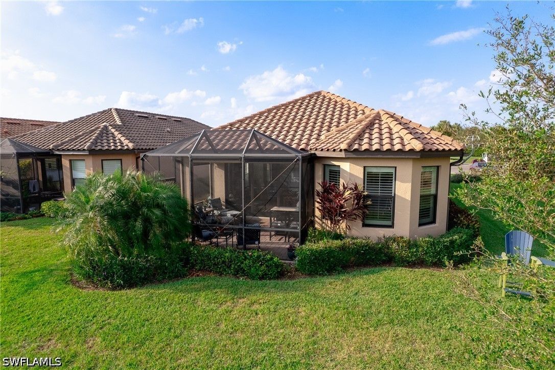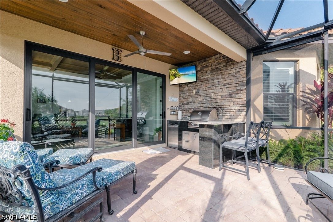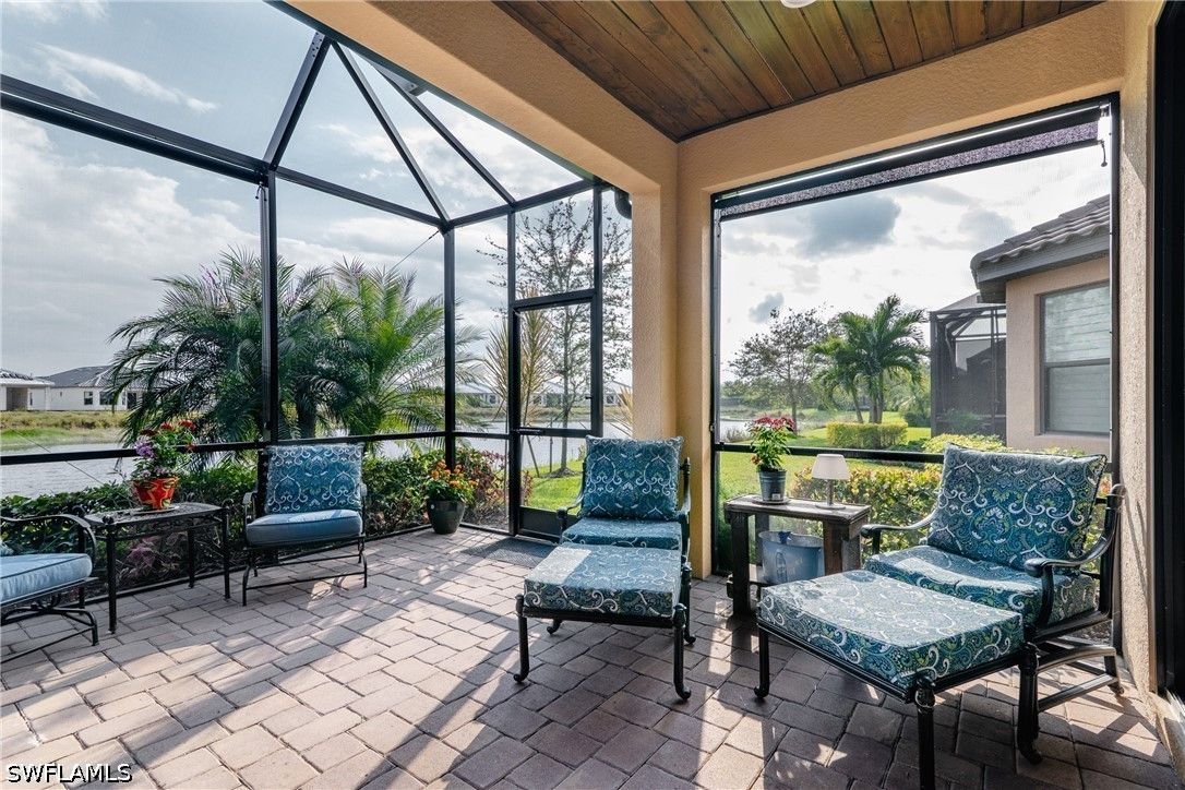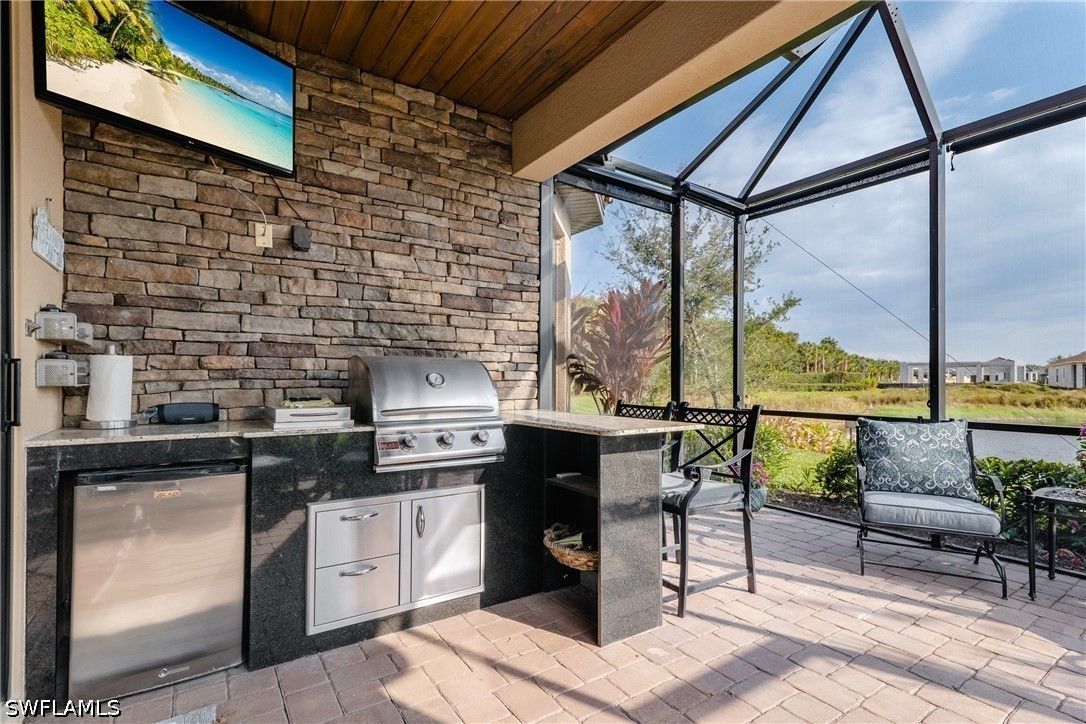 Thoughtfully upgraded and comfortably furnished, this move-in ready, turnkey 2-bedroom + den, 2-bath residence offers a refined take on effortless Naples living in the resort-style community of Esplanade at Hacienda Lakes. Set at the end of a quiet cul-de-sac and built for both beauty and peace of mind, the home is fully outfitted with hurricane impact glass windows and doors—eliminating the need for manual shutters while providing year-round protection. From the moment you step inside, the home sets itself apart with architectural detail that draws the eye upward—custom wood coffered and tray ceilings that create warmth, depth, and visual interest throughout. Plantation shutters and plank-style flooring further enhance the home’s clean, timeless aesthetic. The open-concept design is anchored by a spacious gathering room, where a striking coffered ceiling adds both character and scale. The kitchen is equally well-appointed, featuring GE Café series appliances, a built-in wine fridge, quartz countertops, and abundant cabinetry—suited for both everyday living and entertaining. The den offers flexibility as a home office or additional guest space. The owner’s suite serves as a private retreat, complete with a bay window sitting area, wood tray ceiling, and a well-appointed ensuite bath. Outdoor living takes center stage on the screened lanai, where a summer kitchen invites effortless entertaining against a backdrop of tranquil lake and sunset views. The extended two-car garage—offering an additional 76 square feet—provides valuable additional storage. Residents of Esplanade at Hacienda Lakes enjoy a vibrant, amenity-rich lifestyle with a resort-style pool, fitness center, tennis, pickleball, and a full calendar of social activities—all just a short drive from Naples’ beaches, dining, and shopping. Where architectural detail, tranquil views, and effortless living come together—creating a move-in ready home that feels as good as it looks.