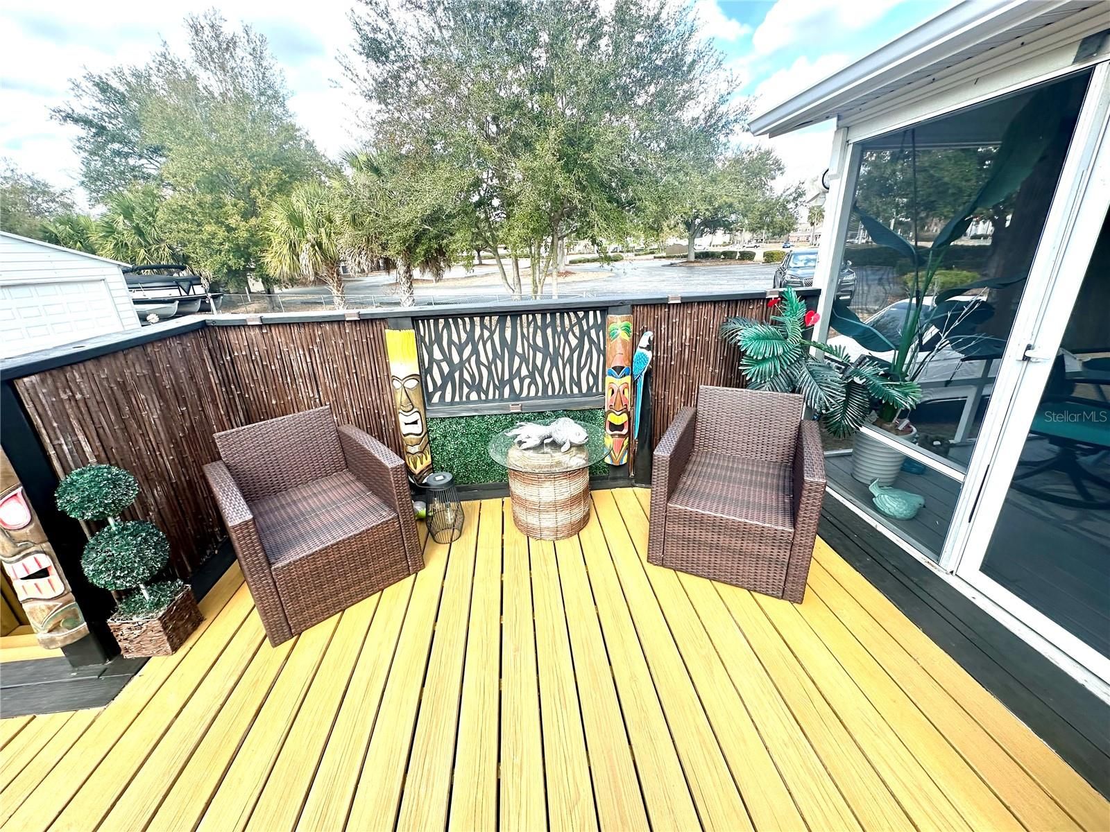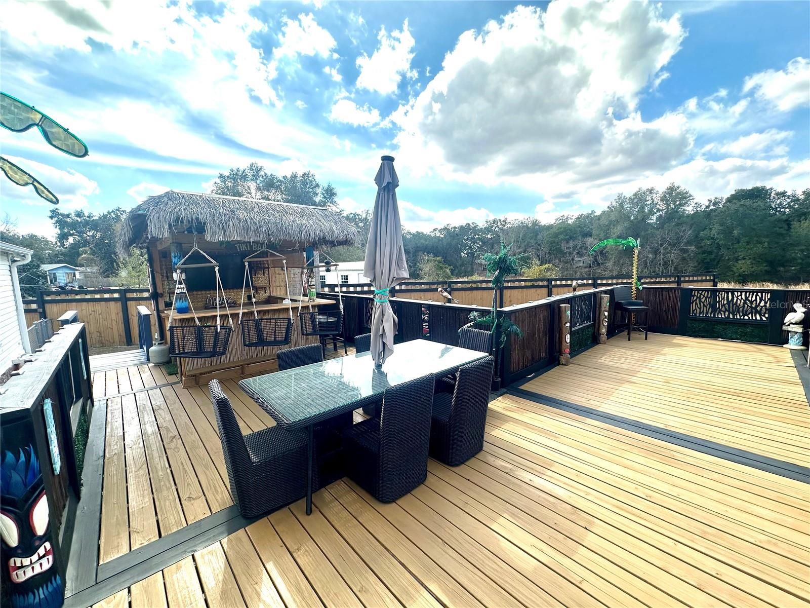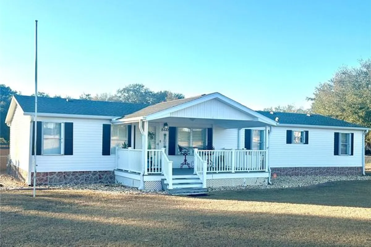 Step into your very own tropical oasis! This backyard is designed for entertaining and unforgettable social gatherings. Enjoy evenings at the custom tiki-bar, and unwind after a long day in the hot tub with swim spa. Inside you will find a spacious layout with seamless flow between the living and entertaining areas. This spacious and well maintained 3-bedroom, 2-bath manufactured home perfectly blends comfort, style, and functionality — all just minutes from everything you need! Situated on a large, level lot, this property immediately welcomes you with a charming covered front porch — the perfect place to enjoy your morning coffee or relax in the evenings. Step inside and you’ll be impressed by the expansive open floorplan featuring two separate living areas, giving you incredible flexibility for entertaining, and additional family space. The heart of the home is the stunning island kitchen, designed with both beauty and practicality in mind. You’ll love the solid surface countertops, abundant cabinetry, and spacious layout that flows seamlessly into the main living area — ideal for hosting gatherings or everyday living. The neutral color palette throughout creates a bright, modern feel, while no carpeting means easy maintenance and a clean, cohesive look. Elegant plantation shutters throughout add charm, privacy, and a timeless touch to every room. The split bedroom layout provides added privacy. The primary suite offers a generous space and natural light leading in to a custom designed ensuite bathroom that will absolutely impress! The iOUTDOOR entertaining space features a Tiki bar that’s ready for weekend cookouts, game-day parties, or evening get-togethers. After entertaining, unwind in the beautiful swim spa and enjoy your own private oasis. This outdoor area truly sets this property apart. For the hobbyist or anyone needing serious storage space, this property is a handyman’s or car collectors dream come true! With a two car garage and additional oversized storage building with fenced yard and ample room to park all your toys — boats, RVs, golf carts, or recreational vehicles — there’s space for it all without restrictions of a HOA. Conveniently located just 2 minutes from The Villages and Stonecrest, Spruce Creek South golf courses, you’ll enjoy easy access to golf, shopping, dining, entertainment, and medical facilities while still having the freedom of your own spacious property. Homes with this combination of location, space, upgrades, and entertaining features are hard to find. Don’t pass this one by — schedule your private showing today!