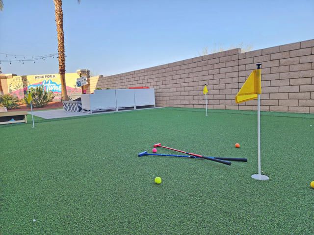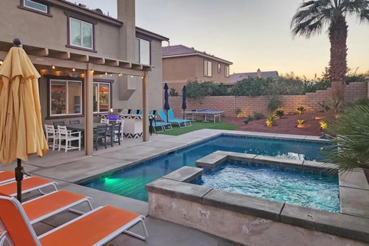 This stunning short-term rental property in Indio's desirable Terra Lago community is a prime investment opportunity. Boasting 4 spacious bedrooms and a versatile den currently utilized as a 5th bedroom, this home is being sold fully furnished and turnkey, making it ideal for use as a second home or a revenue-generating vacation rental. The first floor features newer laminate plank flooring, while the kitchen is equipped with quartz countertops and a custom backsplash, offering both style and functionality. The 3-car garage has been transformed into a climate-controlled game room with polished floors, adding an extra layer of entertainment and value. Additional highlights include an electronic vehicle charging station and leased solar panels for energy efficiency. The backyard is an entertainer's dream, complete with an alumna wood patio cover, an outdoor kitchen featuring a gas BBQ, and a large island to gather around with seating for four. You'll enjoy a spacious yard that easily accommodates 8 sun loungers, a gas firepit, a putting green, This stunning short-term rental property in Indio's desirable Terra Lago community is a prime investment opportunity. Boasting 4 spacious bedrooms and a versatile den currently utilized as a 5th bedroom, this home is being sold fully furnished and turnkey, making it ideal for use as a second home or a revenue-generating vacation rental. The first floor features newer laminate plank flooring, while the kitchen is equipped with quartz countertops and a custom backsplash, offering both style and functionality. The 3-car garage has been transformed into a polished, climate-controlled game room, adding an extra layer of entertainment and value. Additional highlights include an electronic vehicle charging station and leased solar panels for energy efficiency. The backyard is an entertainer's dream, complete with an alumna wood patio cover, an outdoor kitchen featuring a gas BBQ, and an island with seating for four. Guests and residents can enjoy the outdoor shower, a spacious yard that accommodates up to 8 sun loungers, a gas firepit, a putting green, outdoor shower, and a ping pong table. Situated on a corner lot, this property also offers enhanced privacy for its occupants.