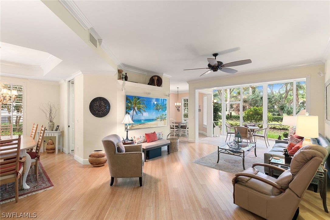 In Pelican Bay, the lifestyle is the headline. Behind the gates of Crescent, it becomes even more special. And within Covington Row, this bright first-floor coach home offers the rare combination of lock-and-leave ease and the everyday comfort of a true home. With an attached 2-car garage, this residence lives more like a private house than a typical condo. Wood and tile flooring run throughout, creating a warm, polished feel, while abundant natural light and a beautiful golf course view bring a sense of calm to the main living spaces. The first-floor setting adds convenience and easy livability for those who want comfort, privacy, and effortless daily life. Ceilings in Covington Row are 9-feet creating an even more spacious feeling. Covington Row is one of the more intimate sections of Crescent, offering a quieter coach home setting within this gated Pelican Bay neighborhood. Residents enjoy Crescent's pool, spa, clubhouse, and fitness amenities, while Pelican Bay ownership opens the door to one of Naples' most coveted lifestyles, including private beach access with chair and umbrella service, beachfront dining, tennis, pickleball, a state-of-the-art fitness center, and miles of walking and nature paths. Just minutes from Waterside Shops, Artis-Naples, and the Gulf, this home is ideal for buyers who want sunshine, security, beauty, and the full Naples coastal experience in one of the town's most celebrated communities.