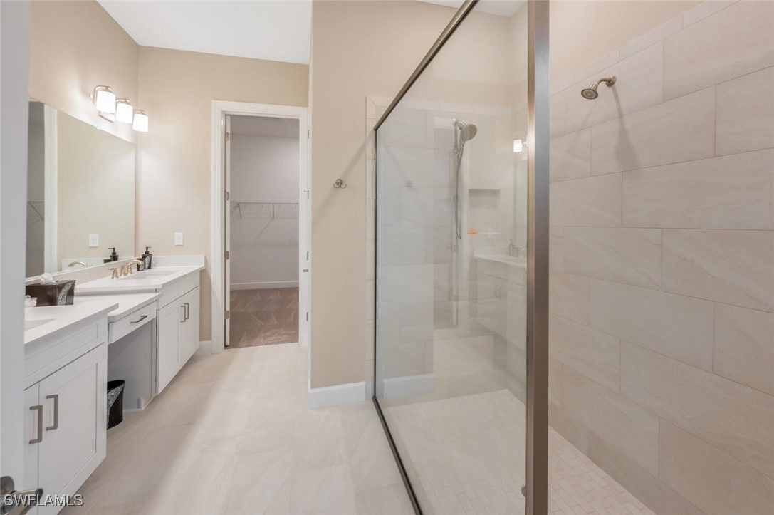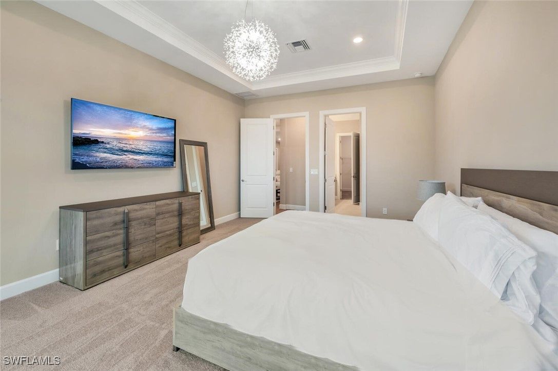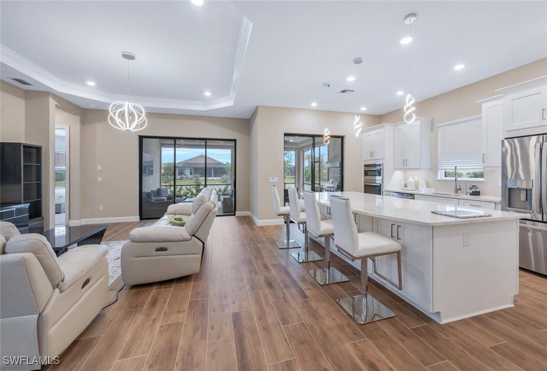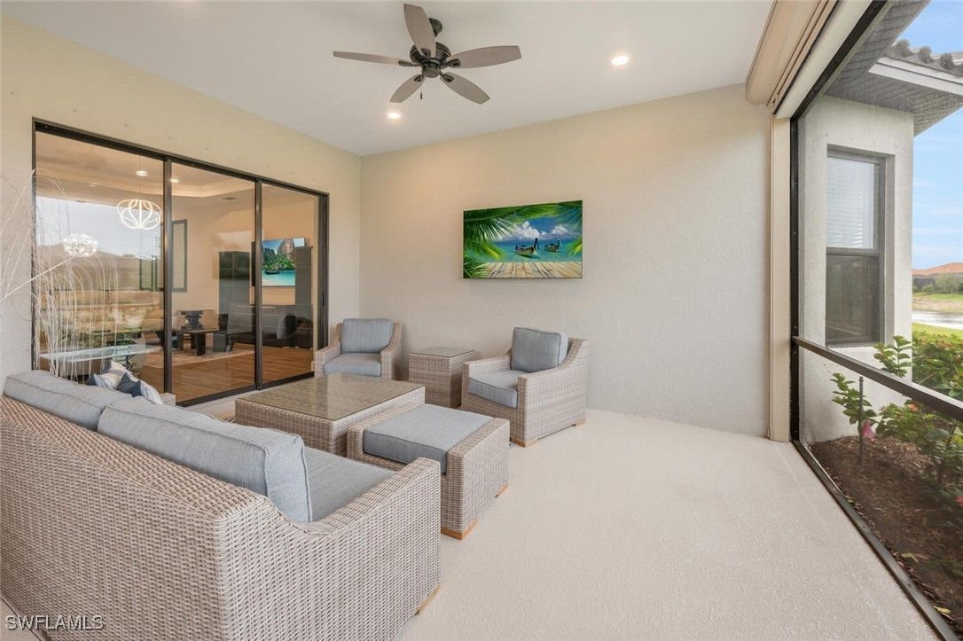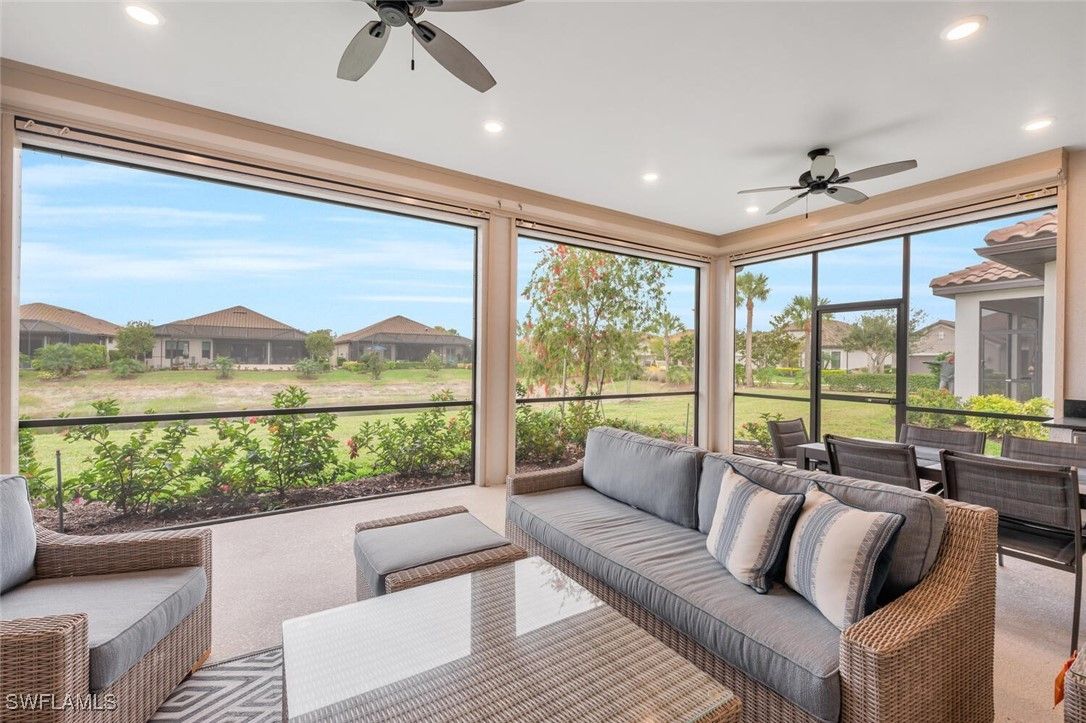Furnished 2023 like sparkling new one story residence awaits the buyer who wants hassle free life style and a quiet screened-in outside lania space to relax. Room for a pool/spa. Award winning open floor plan with 3 bedroom suites, plus office and powder bath, spacious laundry room with utility sink plus 2- car AC Garage. 10 foot high trace ceilings, wide plank, Wood style tile, flooring and spacious open concept flow between living room, dining and kitchen, that seamlessly blends, indoor and outdoor living. Triple and double sliding doors to open to the screened in lanai parentheses already plumbed for outdoor summer gas kitchen parentheses with desirablewater views the chef’s gourmet kitchen offers appliances with gas cooktop, and there is more tankless hot water heater, reverse osmosis, water, filtration in kitchen. Enjoy Esplanade resort lifestyle with Clubhouse, social and card room, billiards room, 24/7 full fitness gym, huge lap pool plus circular resistance, pool, hot tub, pickle ball courts, tennis, and bocce ball courts dog park and playground. All of this located at the crossroads of Naples and Marco Island minutes from pristine Naples and Marco beaches and famous fifth Avenue for fun and dining shopping physicians, regional Hospital just minutes away.