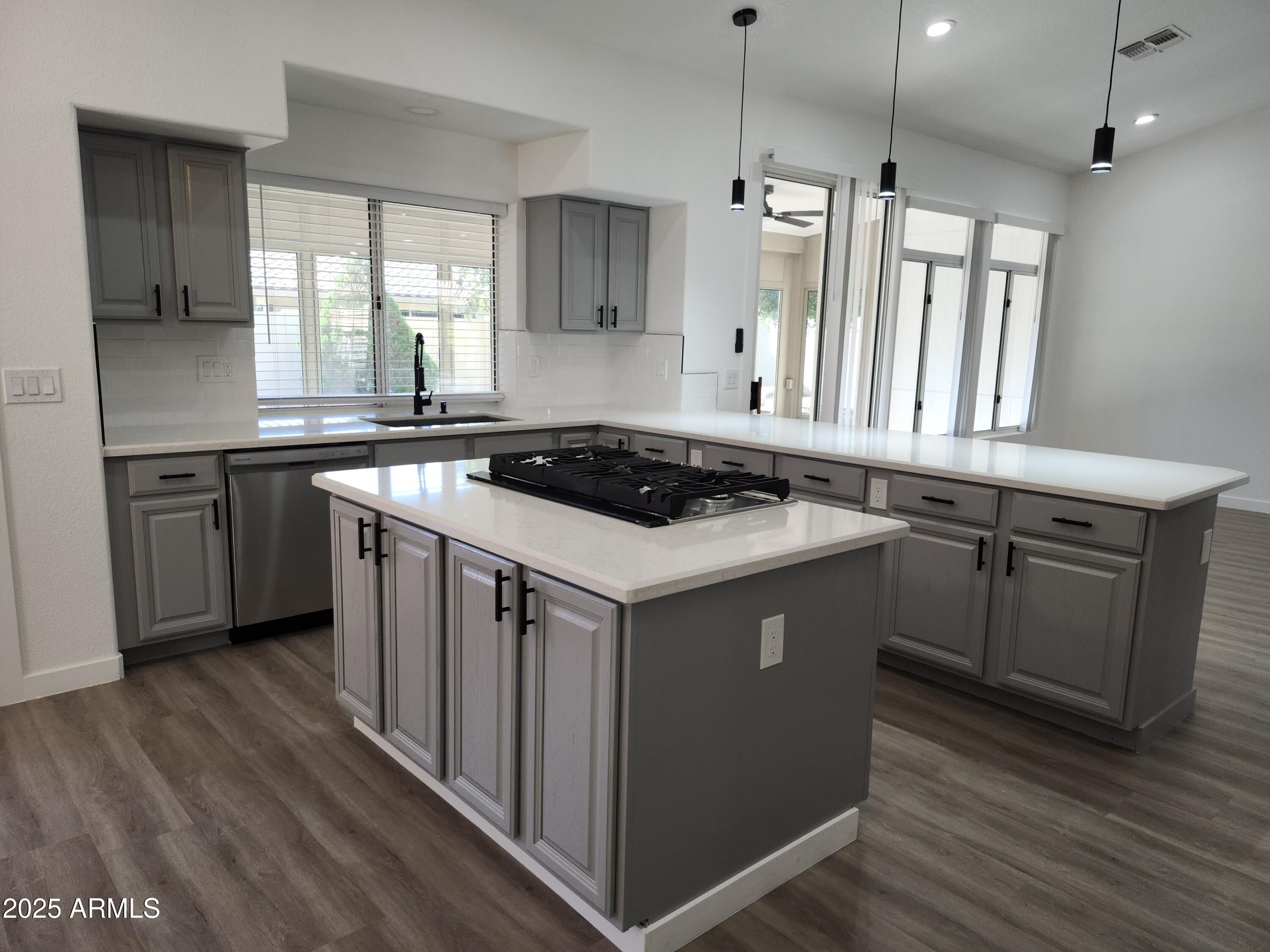 ABSOLUTELY STUNNING!! SOARING VLTD CEILINGS W/RECESSED LIGHTING GREET YOU AS YOU ENTER THIS FULLY REMODELED HOME!! LUXURY HARDWOOD-LIKE VINYL FLOORING T/O + FRESHLY PAINTED INTERIOR, BRAND NEW TOILETS, SHOWERS, MIRRORS, LIGHTING, HARDWARE & MODERN FIXTURES - BEAUTIFUL KITCHEN W/ BRAND NEW QUARTZ CNTRTOPS, FRIGIDARE SS APPLIANCES, TILED BACKSPLASH, PIN LIGHTING & INDIVIDUAL GAS STOVE ON KITCHEN ISLAND + EIK W/SEPARATE EXIT DOOR TO BCKYRD - HUGE LNDRY RM W/EXTRA CABINETRY COULD ALSO BE A SHARED CRAFT RM/OFFICE - LRG PRIMARY SUITE + MSTR BATH W/MASSIVE WALK-IN TILED SHOWER W/GLASS BLOCK & DUAL SHOWERHEADS - WALK-IN CLOSET W/BARNYARD DOOR - LRG AZ ROOM - 2CG W/CABINETRY/WORK AREA & SINK - PAVERS & DESERT LANDSCAPING IN FRONT & REAR YARDS IDEAL FOR LOCK & LEAVE LIVING! A MUST SEE!