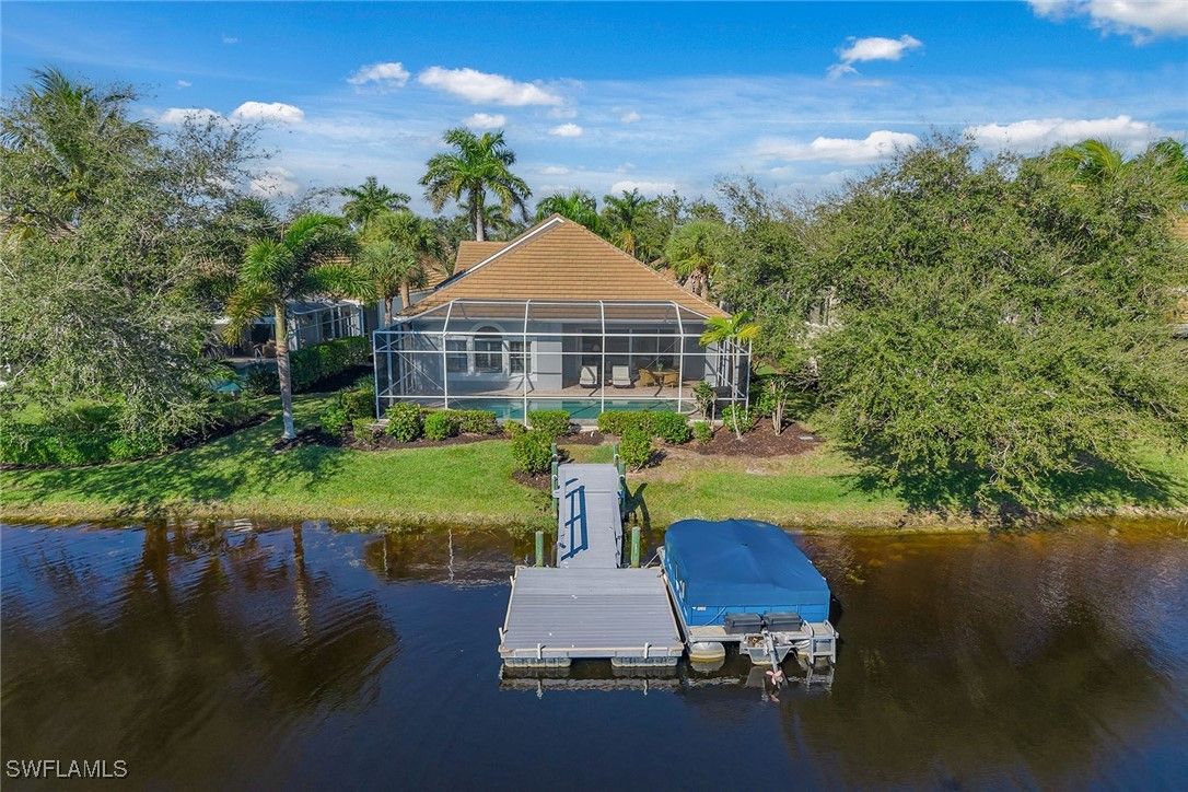 On the Creek with Dock! Enjoy spectacular southern exposure, tranquil water and nature views, and the rare luxury of your own private dock on the Creek—complete with a 14' Bentley pontoon boat included—from this beautifully furnished and spacious three-bedroom, three-full bath residence in highly desirable Mallard’s Landing of Fiddler’s Creek. Designed for relaxed waterfront living, the home offers a heated infinity-edge pool, a screened enclosure, paved driveway, tile roof, CBS construction, a security system, and a newer AC system installed in 2022. Its peaceful Creek-side setting enhances every moment—whether lounging by the pool, heading out on the water for a sunset cruise, fishing off of the dock, or simply enjoying the surrounding natural beauty. Inside, refined finishes include engineered hardwood flooring, custom wainscoting, recessed LED lighting, and crown molding. A gracious foyer with natural stone inlay, French entry doors, and a recessed ceiling sets an elegant tone. The kitchen features 18" diagonal tile flooring, granite countertops, a full backsplash, under-cabinet and in-cabinet lighting, a porcelain apron-front sink, and Samsung stainless appliances. Glass-front upper cabinets, a peninsula with bar seating, and a pantry complete the space.The great room captures beautiful pool and Creek views and offers a built-in entertainment center, crown molding, ceiling fan, and sliders to the lanai. A separate living room or den adds versatility with a gas fireplace, arched window with recessed window seat, custom wall treatment, and detailed ceiling. The dining room includes crown molding, wainscoting, recessed ceiling detail, built-in corner cabinetry, and a pocket door to the kitchen.The primary suite is a serene retreat with French doors to the lanai, plantation shutters, two walk-in closets, and peaceful water views. Its en-suite bath includes dual sinks with a make-up counter, a separate bathtub, a walk-in shower with glass enclosure, and elegant lighting. Two guest bedrooms each offer an en-suite bath—one with a tub–shower combination, the other with a walk-in shower that also provides convenient hallway access. A dedicated laundry room with a laundry tub, cabinetry, and washer and dryer adds convenience, while the two-car garage features brand-new epoxy flooring and a bay window that fills the space with natural light. Residents of Fiddler’s Creek enjoy an award-winning, gated community with newly completed 2025 amenity enhancements, including an updated resort-style pool with waterfalls and slides, an upgraded Gator Grille restaurant, and 10 new pickleball courts. The Club & Spa features Caxambas restaurant, world-class fitness center, six Har-Tru tennis courts, and a hot tub, sauna, and steam room. Optional memberships—with no golf waiting list—offer access to the renovated championship course, new golf clubhouse, marina, and private beach club. CDD balance paid in full.