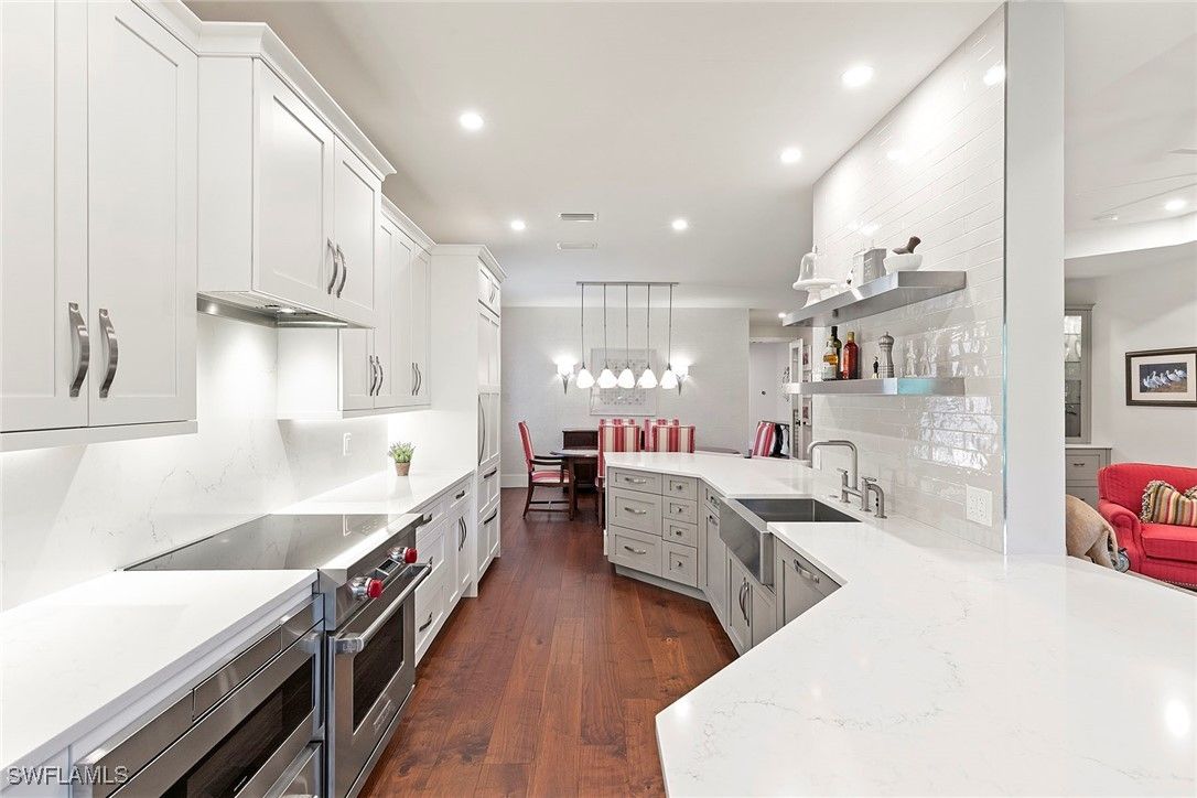Perched on the second floor in Covington Row at Crescent, this completely renovated Pelican Bay coach home is the kind of place that makes you exhale the moment you walk in, with peaceful golf course views across the 5th hole of the Bay course and a light, elevated feel that instantly says "you're home." The residence lives beautifully with 3 bedrooms and a generous loft (perfect as a second lounge or office) and 2.5 baths, along with the rare luxury of a private elevator and 2-car attached garage. Thoughtful finishes include wood flooring, custom tile in the baths and laundry, plantation shutters, electric blinds over the sliders, and a built-in living room bar that makes entertaining feel effortless. The kitchen remodel is designed for people who actually love to cook and host, featuring custom wood cabinetry, quartz countertops, a custom backsplash, and a premium lineup of Wolf and Sub-Zero appliances. All bathrooms were also fully renovated with custom tile, frameless showers, and designer vanities. Crescent is a gated community, ideally located near the Pelican Bay Wellness Center, close to daily conveniences like Publix at Pavilion and Whole Foods at Mercato, with a short bike ride to the beach tram. From there, it's pure Pelican Bay: beach clubs, dining, tennis, pickleball, theater and the easy rhythm of life by the Gulf.