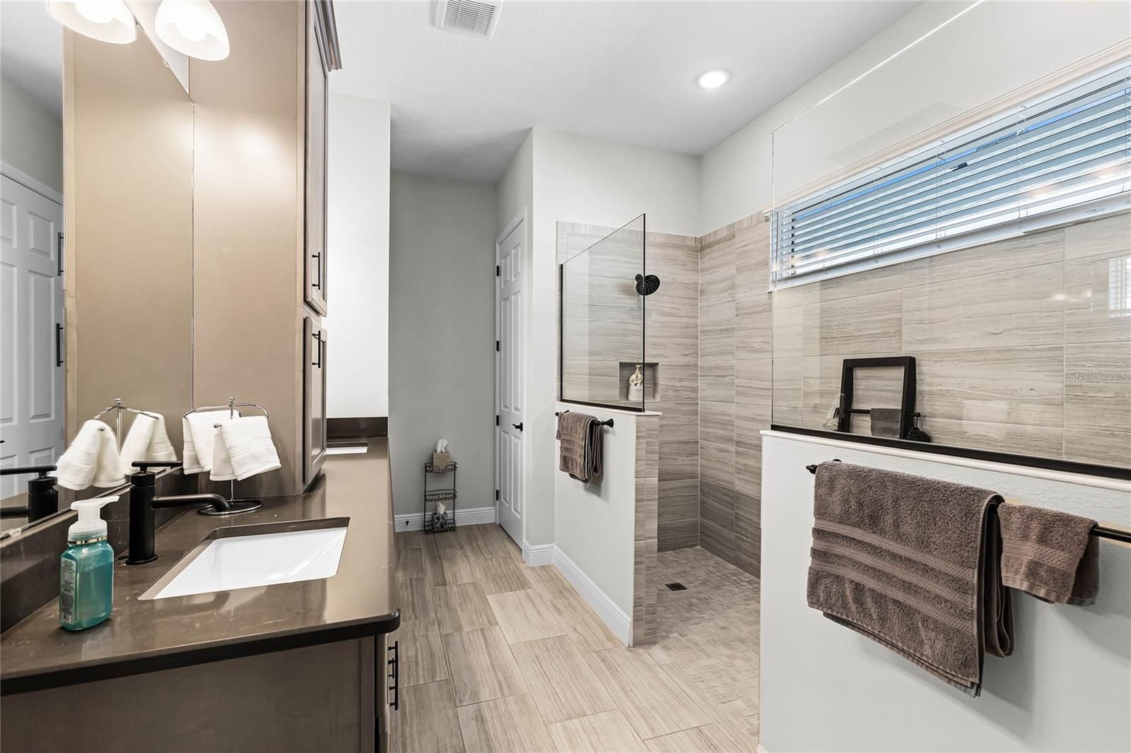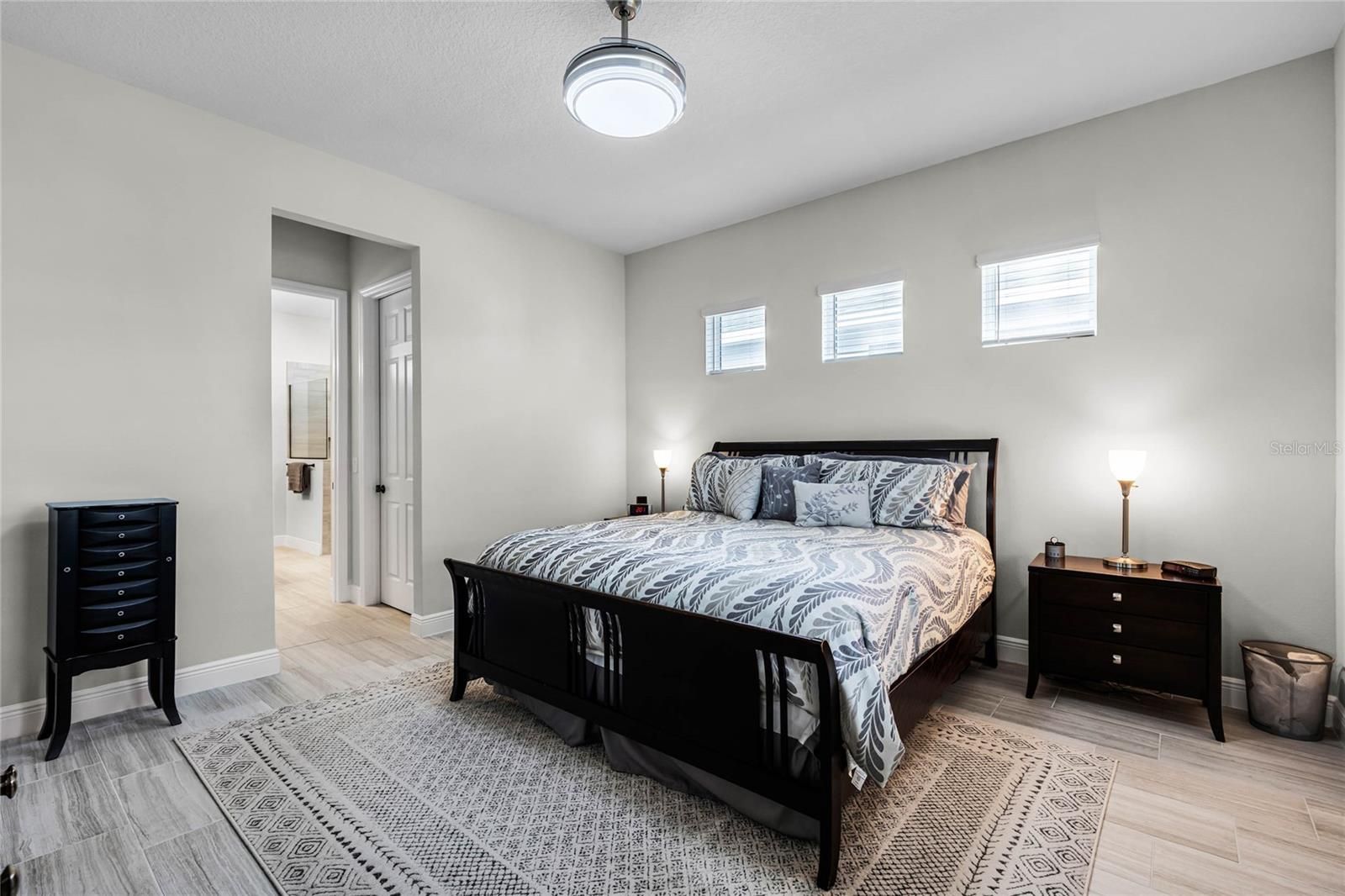 - Ceiling Fan(s), Eat-in Kitchen, High Ceilings, In-Wall Pest Control, Living/Dining Room, Open Floorplan, Main Level Primary, Solid Surface Counters, Solid-Wood Cabinets, Split Bedrooms, Stone Counters, Thermostat, Tray Ceiling(s), Walk-In Closet(s), Window Treatments