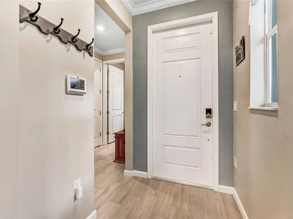 - Ceiling Fan(s), Crown Molding, Eat-in Kitchen, Kitchen/Family Room Combo, Living/Dining Room, Open Floorplan, Main Level Primary, Solid Surface Counters, Split Bedrooms, Thermostat, Tray Ceiling(s), Walk-In Closet(s), Window Treatments