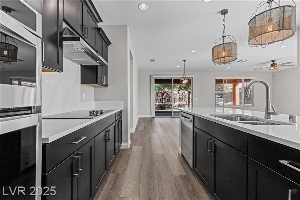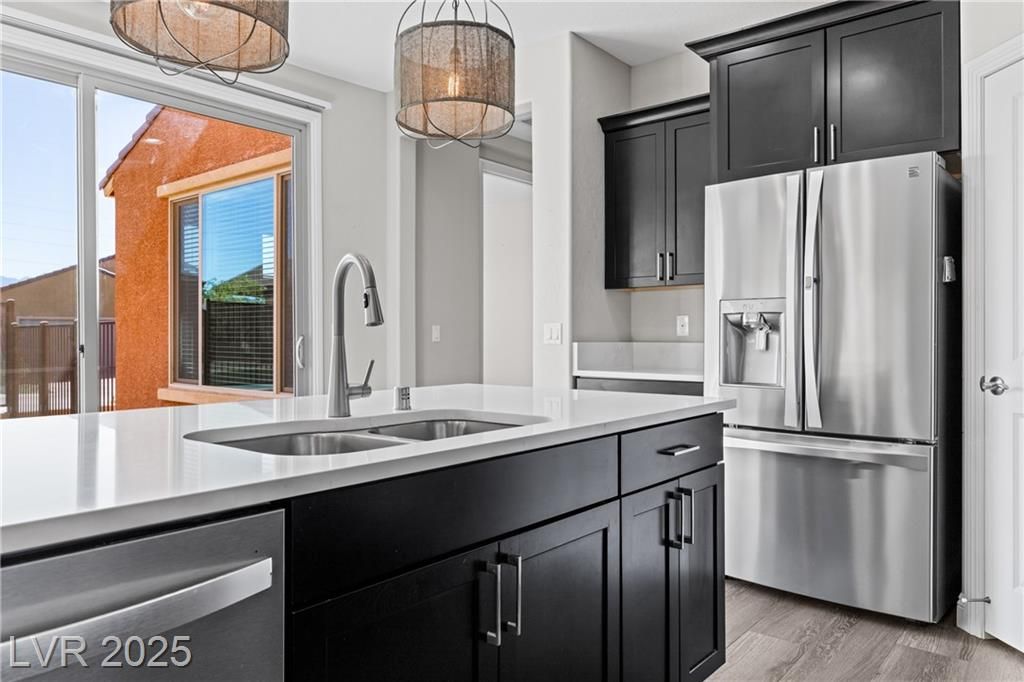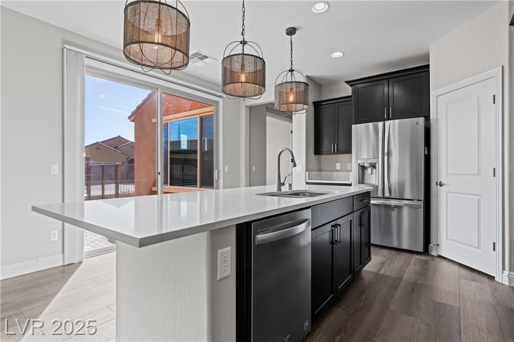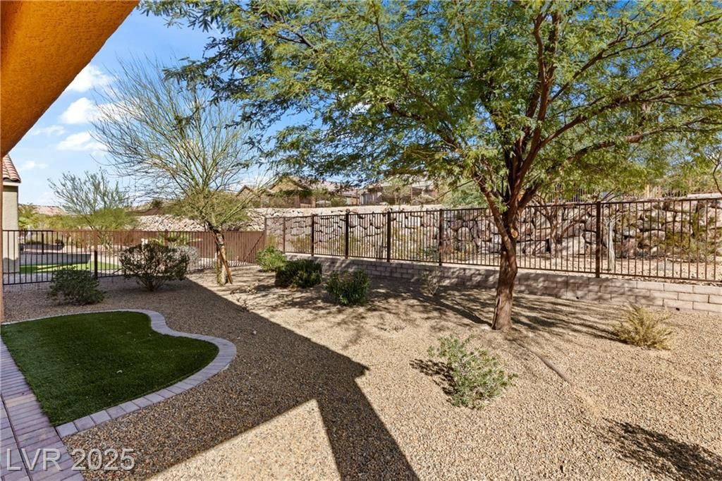 A beautifully maintained Sun City Mesquite retreat offering modern finishes, exceptional outdoor living, and a prime corner-lot location. Built in 2019, this 1,864 SF single-story home sits on a .17-acre corner lot & features 2 bedrooms, 2 bathrooms, & a versatile den perfect for a home office, hobby room, or additional guest space.Step inside to find luxury vinyl plank flooring throughout the main living areas paired with brand-new carpet in the bedrooms, creating the ideal blend of style and comfort. The heart of the home is the stunning kitchen-complete with quartz countertops, stainless steel appliances, staggered cabinetry with hardware, a gorgeous island with pendant lighting, and plenty of storage for everyday convenience and entertaining. The fully fenced backyard is a true highlight, offering a large covered patio, full landscaping, synthetic grass, and mature shade trees-perfect for relaxing, gathering, and enjoying the peaceful desert atmosphere year-round.
