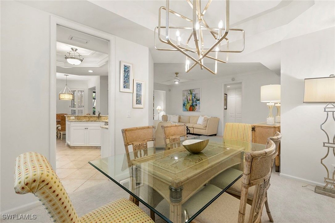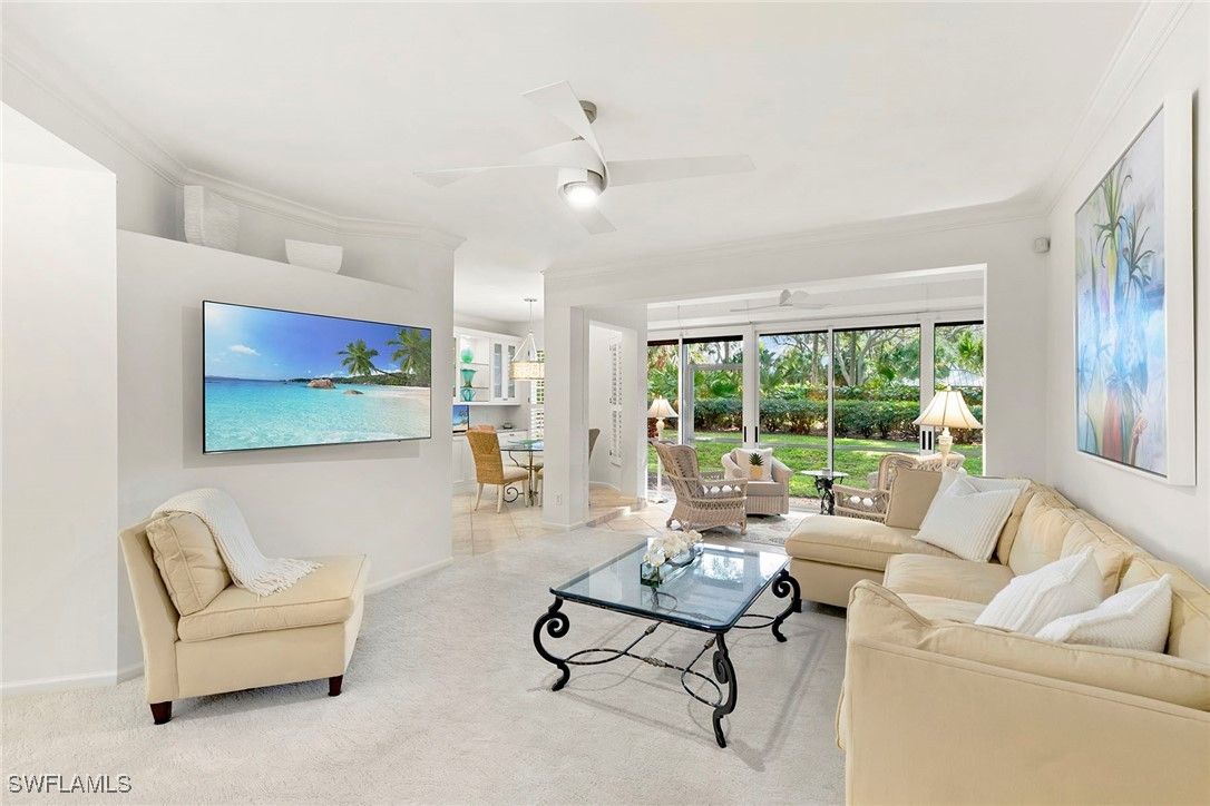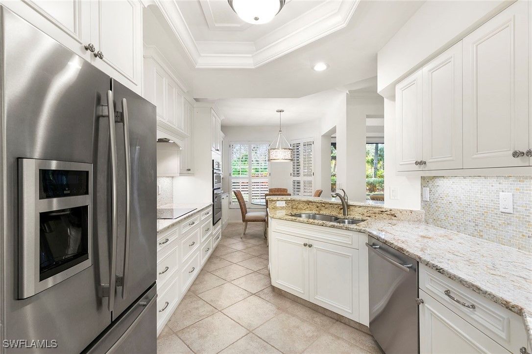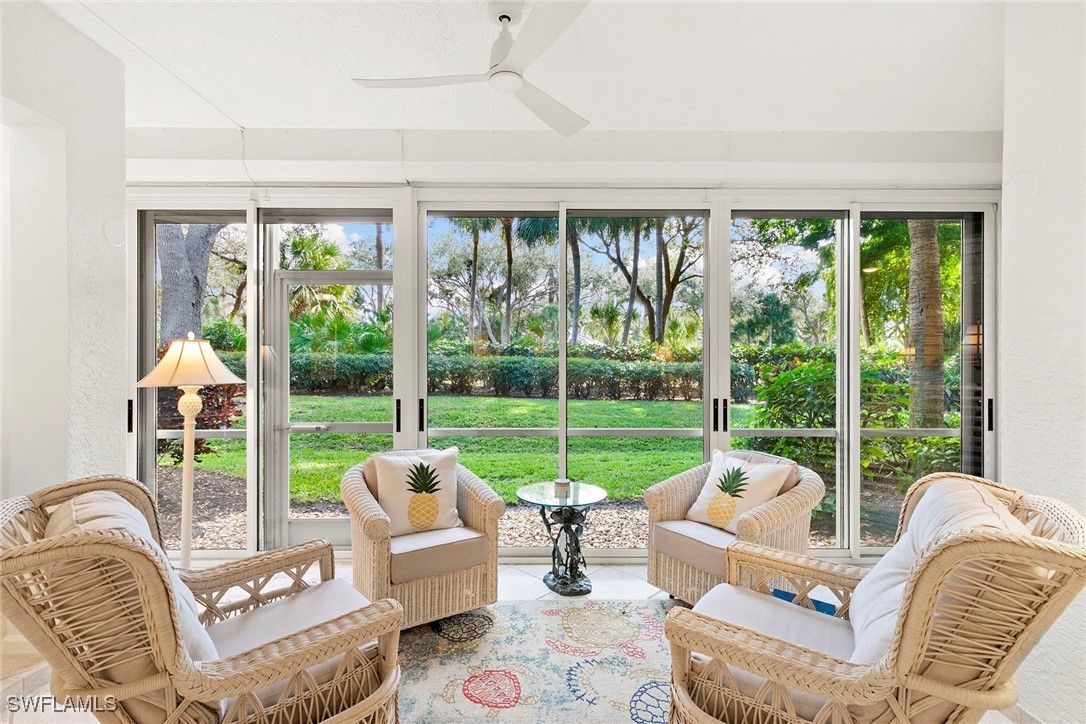 Discover your dream home in the sought-after dog-friendly neighborhood of Covington Row in the Crescent. This stunning first-floor condominium offers a harmonious blend of modern living and serene surroundings ideal for relaxation and entertainment. Key features include spacious living including three bedrooms and 2 1/2 baths, providing ample space for family and guests. Each room is designed to maximize light and flow. The screened and glassed lanai overlooks a private rear yard with mature trees, landscaping and the golf course beyond, A spot for a cup of coffee and the morning sunrise. Being offered turnkey furnished, making it ideal for those looking for a hassle-free transition to Naples and Pelican Bay. The updated kitchen features granite countertops and modern stainless appliances. Enjoy a bright, light and open floor plan. Enter your home through the two-car attached garage, a real plus. Covington Row and the Crescent offer a large attractive swimming pool and spa, and a fitness room. Enter your home through the two-car attached garage, also a real plus. Pelican Bay offers three miles of pristine, private beach access with two restaurants with bars. two tennis centers; a world-class fitness center; pickleball courts, canoes, Sunfish and recreational paths.