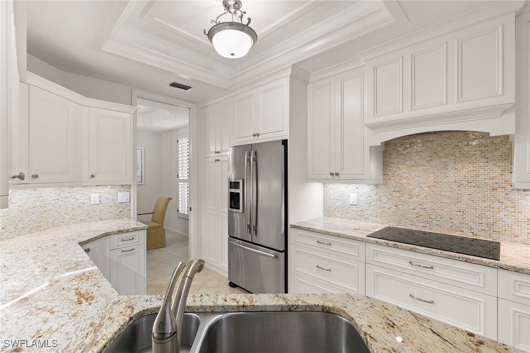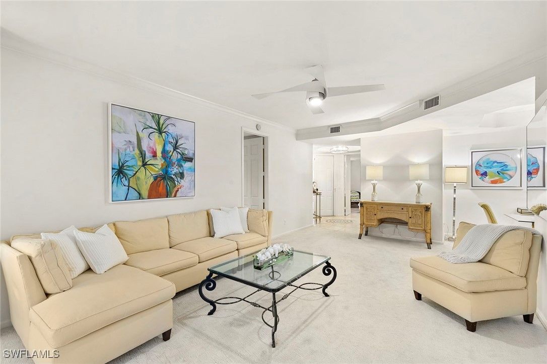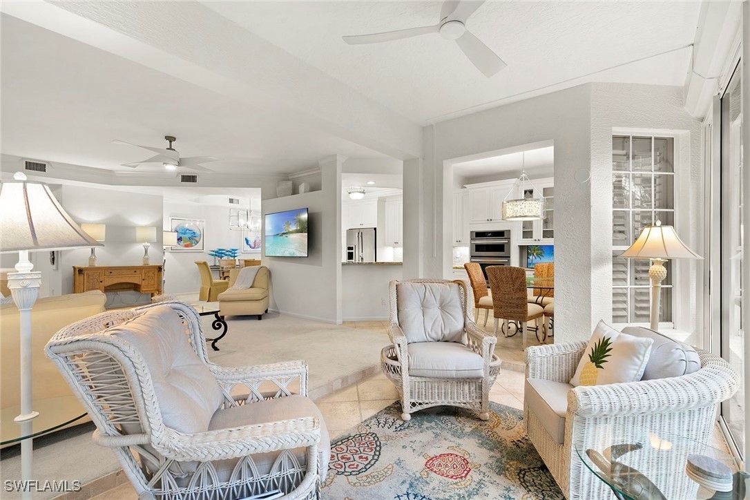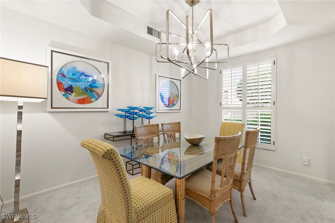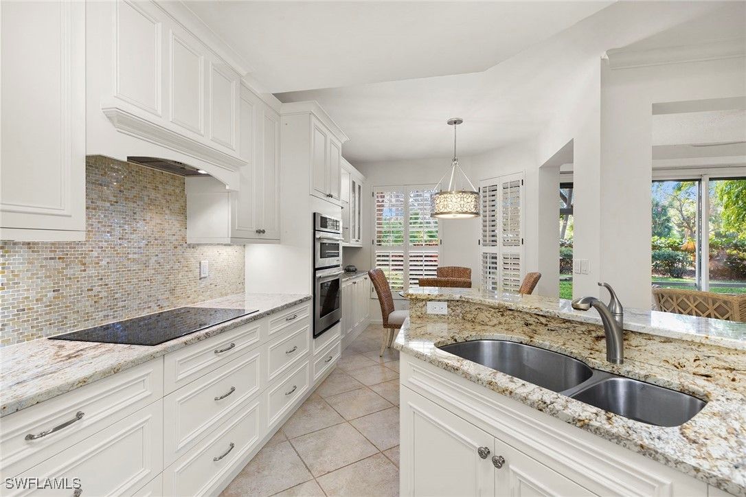 Discover your dream home in the sought-after dog-friendly neighborhood of Covington Row in the Crescent. This stunning first-floor condominium offers a harmonious blend of modern living and serene surroundings ideal for relaxation and entertainment. Key features include spacious living including three bedrooms and 2 1/2 baths, providing ample space for family and guests. Each room is designed to maximize light and flow. The screened and glassed lanai overlooks a private rear yard with mature trees, landscaping and the golf course beyond, A spot for a cup of coffee and the morning sunrise. Being offered turnkey furnished, making it ideal for those looking for a hassle-free transition to Naples and Pelican Bay. The updated kitchen features granite countertops and modern stainless appliances. Enjoy a bright, light and open floor plan. Enter your home through the two-car attached garage, a real plus. Covington Row and the Crescent offer a large attractive swimming pool and spa, and a fitness room. Enter your home through the two-car attached garage, also a real plus. Pelican Bay offers three miles of pristine, private beach access with two restaurants with bars. two tennis centers; a world-class fitness center; pickleball courts, canoes, Sunfish and recreational paths.