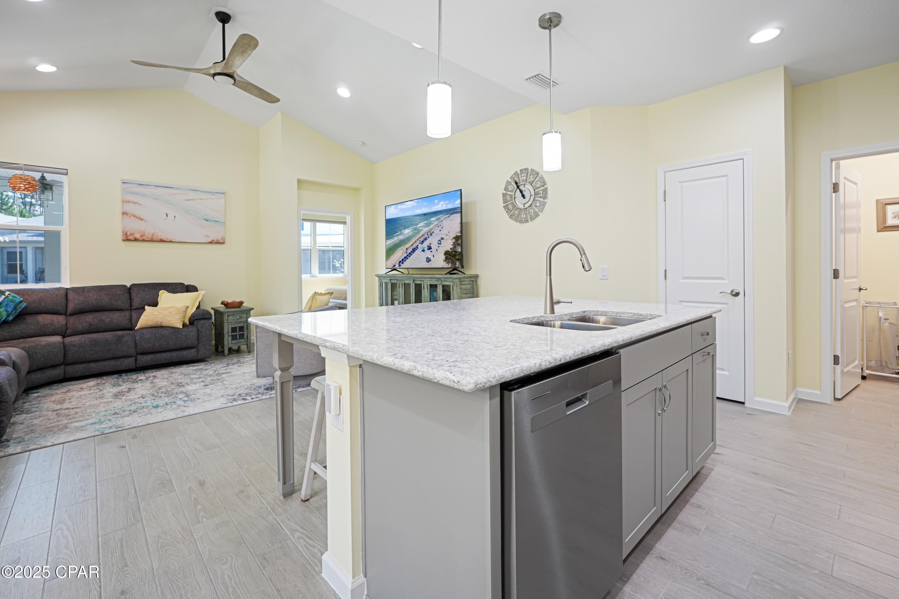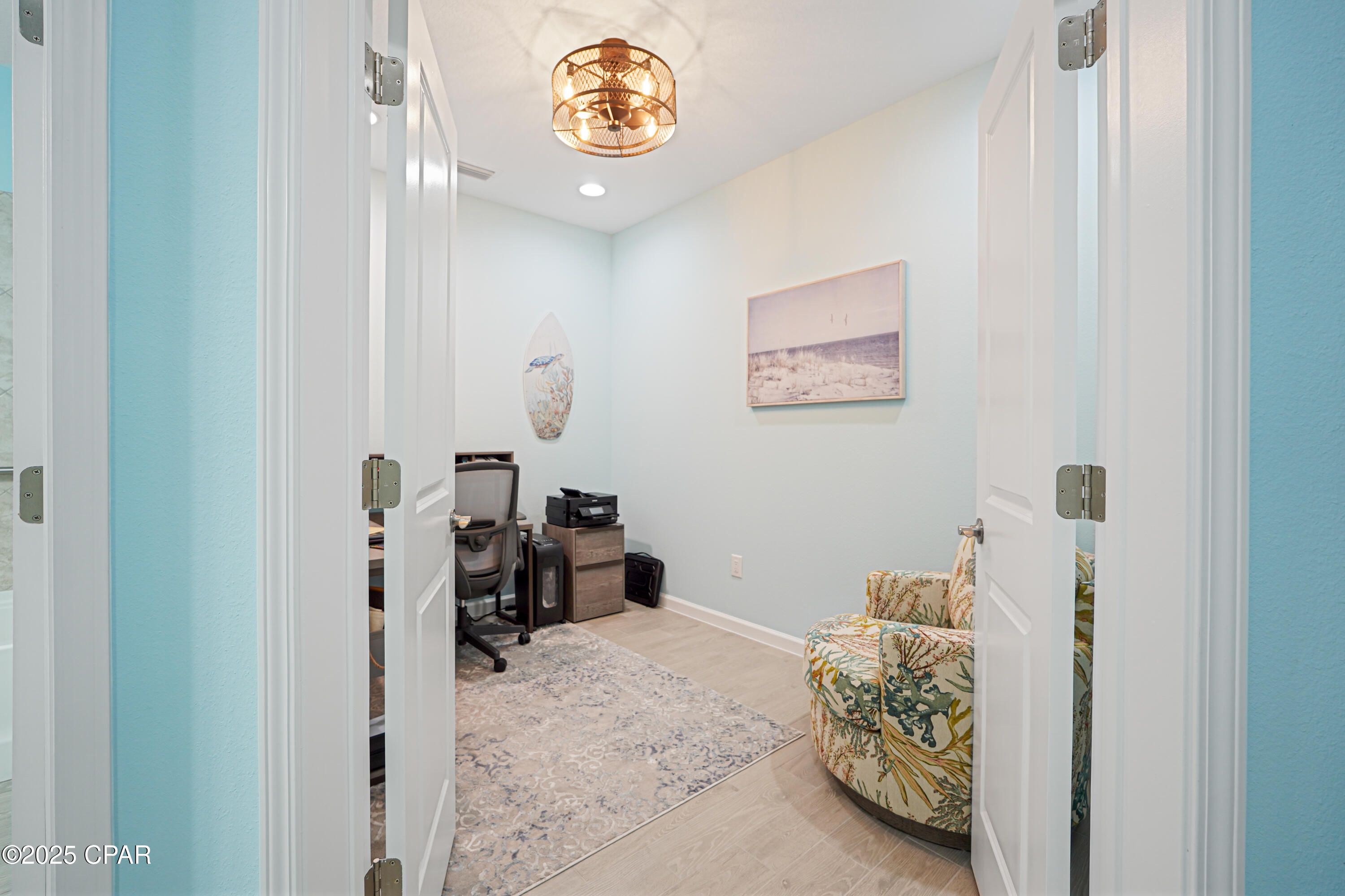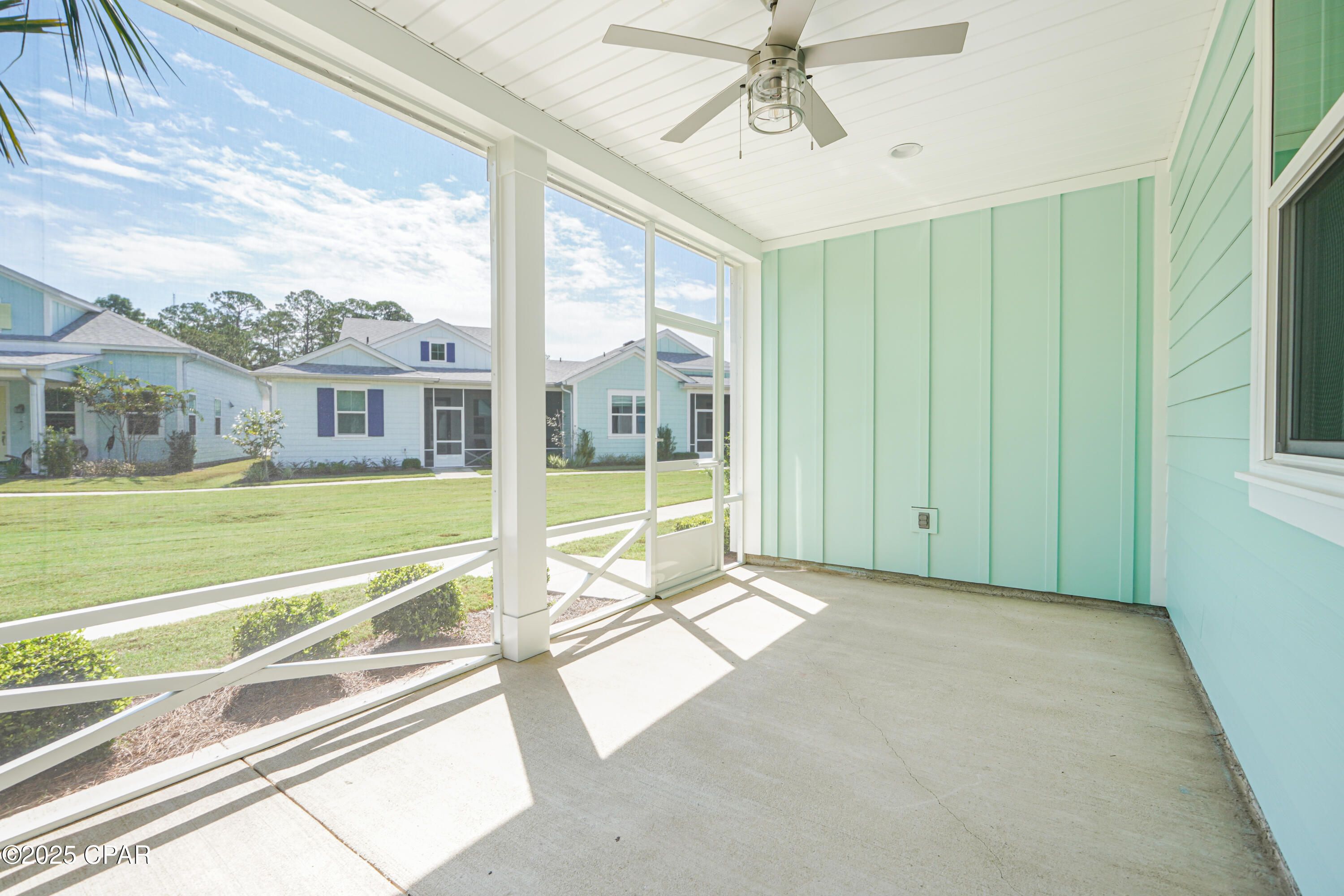 Welcome to Latitude Margaritaville at Watersound just 7 miles from the sugar white sands of Panama City Beach. This charming ''Dreamsicle'' model cottage is located in Phase 5 just a short golf-cart ride from Town Center amenities via a private golf-cart bridge under West Bay Parkway. This model is the most one of the largest and most popular floorplans. It offers 2 bedrooms and 2 full baths and a den/flex room perfect for an office or creative space with Solid wood doors for privacy. Inside, enjoy upgraded level 3 tile flooring throughout, an open concept design, 42'' custom cabinets, extended Island with quartz perfect for entertaining. The stone-gray cabinetry offers pull-out drawers for all of your pots/pans and a separate pantry; the laundry room offers top cabinets for additional storage over your washer/dryer. In this open floorplan the family room has a vaulted ceiling with a ceiling fan and open to the dining area and kitchen with lots of natural light and upgraded can lights in all rooms. The upgraded electronic Shades are on all Windows. The primary suite includes a tile shower, quartz-top vanity, private water closet and a custom-built closet. The guest suite is private and adjacent to a full bath. Looking out to a Premium private preserve lot the screened in lanai is perfect for relaxing and the best feature is all lawn care is covered by the HOA. This cottage is equipped with upgraded Hurricane windows, security ring door-bell, garage and attic antenna that will remain for your security needs. Come take a look and drive to the end unit into your insulated garage that features a 20amp dedicated plug for your golf-cart. This cottage comes with a designated outdoor parking for guest to utilize. The lawn care is maintained by HOA, exterior paint and roof replacement are on a maintenance schedule by HOA as well. Enjoy the community amenities with a state-of-the-art Fitness center, indoor pool, fitness classes, outdoor resort pool , pickleball courts, kayak launch and our 2 story Restaurant for residents only. The Band shell is fun for dancing and listening to live music! The newest amenity is the ''work-play-center that offers a theater, pet grooming, wood-working workshop and a clay studio. The future marina and commercial area are planned with a grocery store, shopping and dining. Come find your Address in Paradise!!