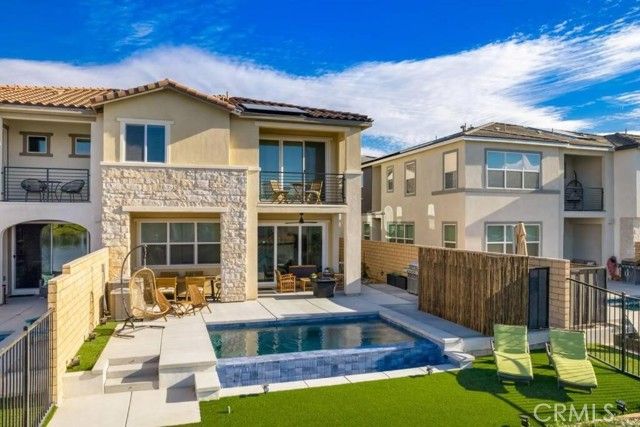 Experience luxury lakefront living in this beautifully updated and fully furnished 2-story Indio home in the sought-after, Terra Lago community. Featuring 4 bedrooms, 4 bathrooms, and an additional upstairs bonus room that can function as a 5th bedroom. This bright, modern residence offers an open-concept layout with upgraded tile flooring, fresh designer paint, and large windows showcasing stunning water views. The updated gourmet kitchen features quartz countertops, stainless-steel appliances, custom cabinetry, and elegant pendant lighting that flows into the spacious dining and living areas. The remodeled primary suite includes a private balcony with panoramic lake and mountain views. Outside, enjoy a resort-style backyard with modern concrete hardscape, artificial turf, updated pool tile, multiple seating areas, and a sparkling pool overlooking the serene lake. Energy-efficient solan panels provide added savings and value. Turnkey, beautifully upgraded, and set on rare waterfront: this home offers the ideal blend of comfort and luxury living. Whether you’re ready to buy your first home or looking for the perfect investment opportunity with this short-term–rental-approved property… you can’t go wrong with this one.
