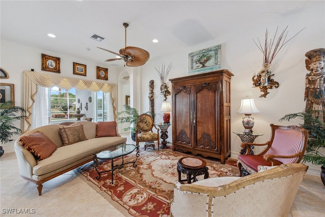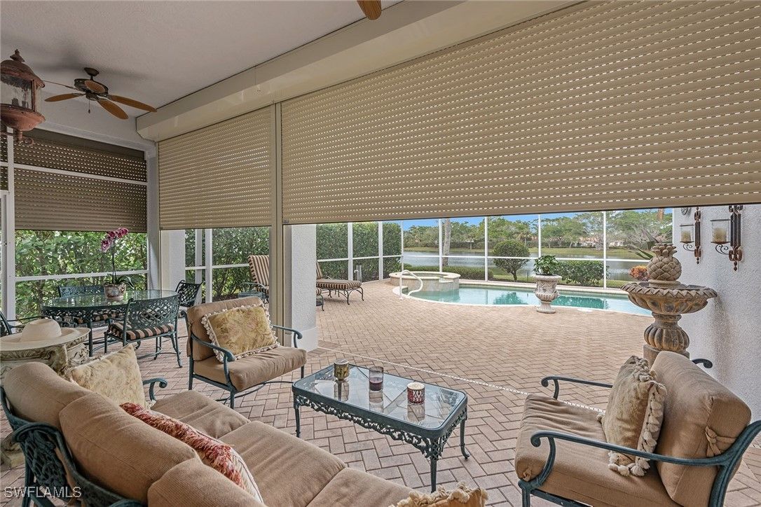 Experience refined living in the sought-after Mallard’s Landing neighborhood of Fiddler’s Creek in this exquisite three-bedroom, two-bath residence built by Gulf Bay. Featured in Naples Home & Design magazine, this home exemplifies timeless design, elegance and craftsmanship. This Cape Cod-style provides a seamless move-in opportunity and an exceptional blend of comfort and style. Set against a tranquil backdrop of breathtaking lake views, this residence offers outstanding privacy and serenity. From the spacious screened lanai, enjoy unobstructed vistas of the water, vibrant birdlife and glowing sunsets. The thoughtfully designed Bayview split-bedroom floor plan ensures comfort and privacy, while large windows and multiple glass sliders flood the home with natural light and create effortless indoor-outdoor living. The living room opens to the lanai overlooking the heated pool and spa with waterfall feature, surrounded by spacious covered outdoor areas ideal for entertaining or relaxing year-round. The pool features automation and new LED color lighting (2024), enhancing the ambiance for evening enjoyment. The kitchen combines style and functionality with premium cabinetry, stainless steel appliances, including a new range, microwave and dishwasher, and a charming eat-in breakfast area framed by windows with scenic views. A formal dining room, illuminated by an elegant chandelier, offers direct access to the lanai for convenient indoor-outdoor dining. The owner’s suite is a peaceful retreat with an arched window, lanai access and two walk-in closets. The spa-like bath features dual vanities with a full-width mirror, a makeup counter, a soaking tub and a glass-enclosed walk-in shower. Two well-appointed guest bedrooms are near a full bath with a shower-tub combination, providing comfort and privacy for family and visitors alike. Additional highlights include a laundry room with cabinetry, utility sink, and new LG washer and dryer, a two-car garage with new epoxy flooring, natural light, a workbench and shelving, plus numerous upgrades including new water heater (2021), new roof (2019), impact glass windows, electric storm shutters, custom window treatments, recessed lighting and a security system with fire detection. Residents of Fiddler’s Creek enjoy world-class resort amenities with a recently renovated clubhouse, including tropical pools, spa services, fitness center with classes and trainers, fine and casual dining, active tennis and pickleball programs, bocce, sauna, steam room and a vibrant social calendar. Optional memberships are available for golf, beach and marina privileges, further enhancing the luxury lifestyle. In a gated community with miles of sidewalks for walking, running or cycling, this home offers easy access to downtown Naples, Marco Island, shopping, dining and pristine beaches. Low transferable flood insurance provides added peace of mind. CDD bond paid in full.