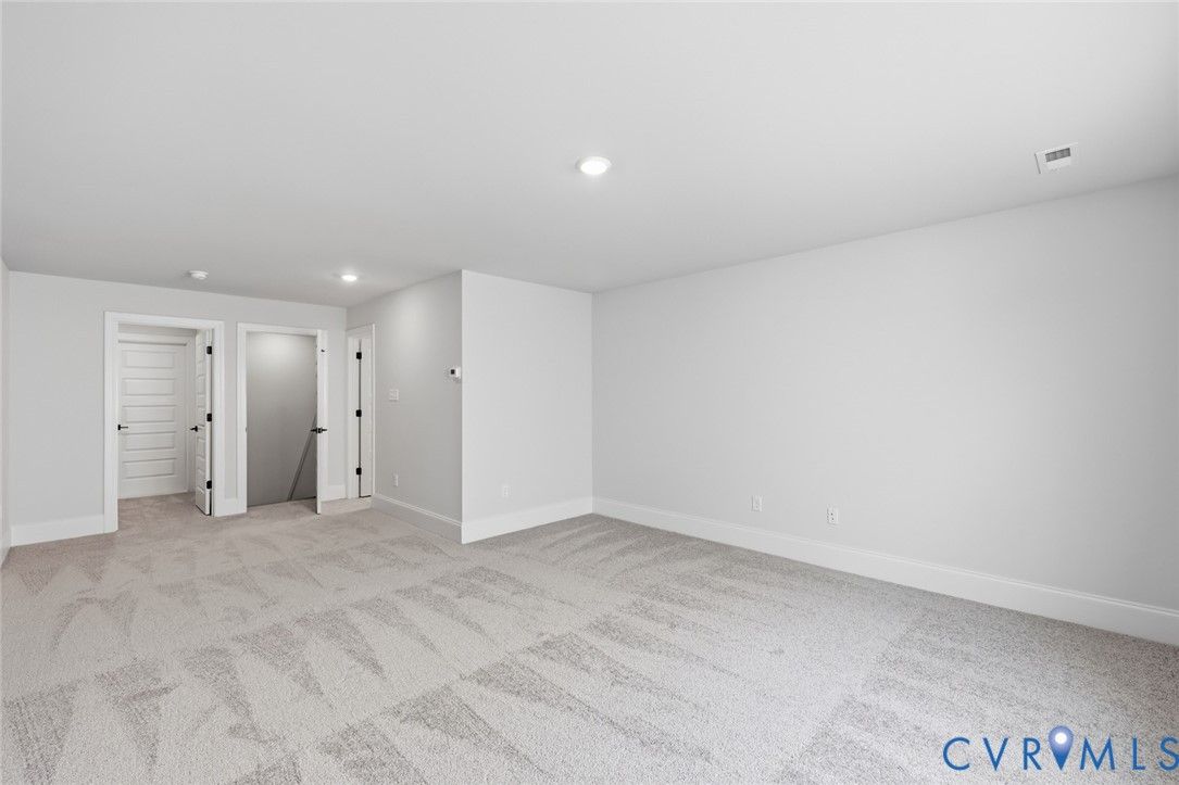 THIS HOME IS MOVE-IN READY! Stags Trail is a 55+ community offering low-maintenance homes. This move-in-ready home offers over 3,600 square feet of living space across three finished levels, including a basement with nine-foot ceilings that features a large great room, bedroom, full bath, and ample storage. Exterior features include blue Hardie® siding and brick accents. The main level is designed for gathering with an open layout, light-toned flooring, and abundant natural light. A gourmet kitchen with light cabinetry, a bold navy island, quartz countertops, stainless steel appliances, and a tile backsplash flows seamlessly into the great room and sunroom, where a fireplace creates a cozy focal point. The first-floor guest suite adds flexibility for visitors or a private office, while the primary suite provides a dramatic retreat with a walk-in closet and spa-like bath featuring a double vanity and walk-in shower. Upstairs, a versatile loft bedroom with a walk-in closet and access to unfinished storage enhances livability. Outdoor living is just as inviting with a spacious deck and patio overlooking the backyard and gorgeous views of the pond.