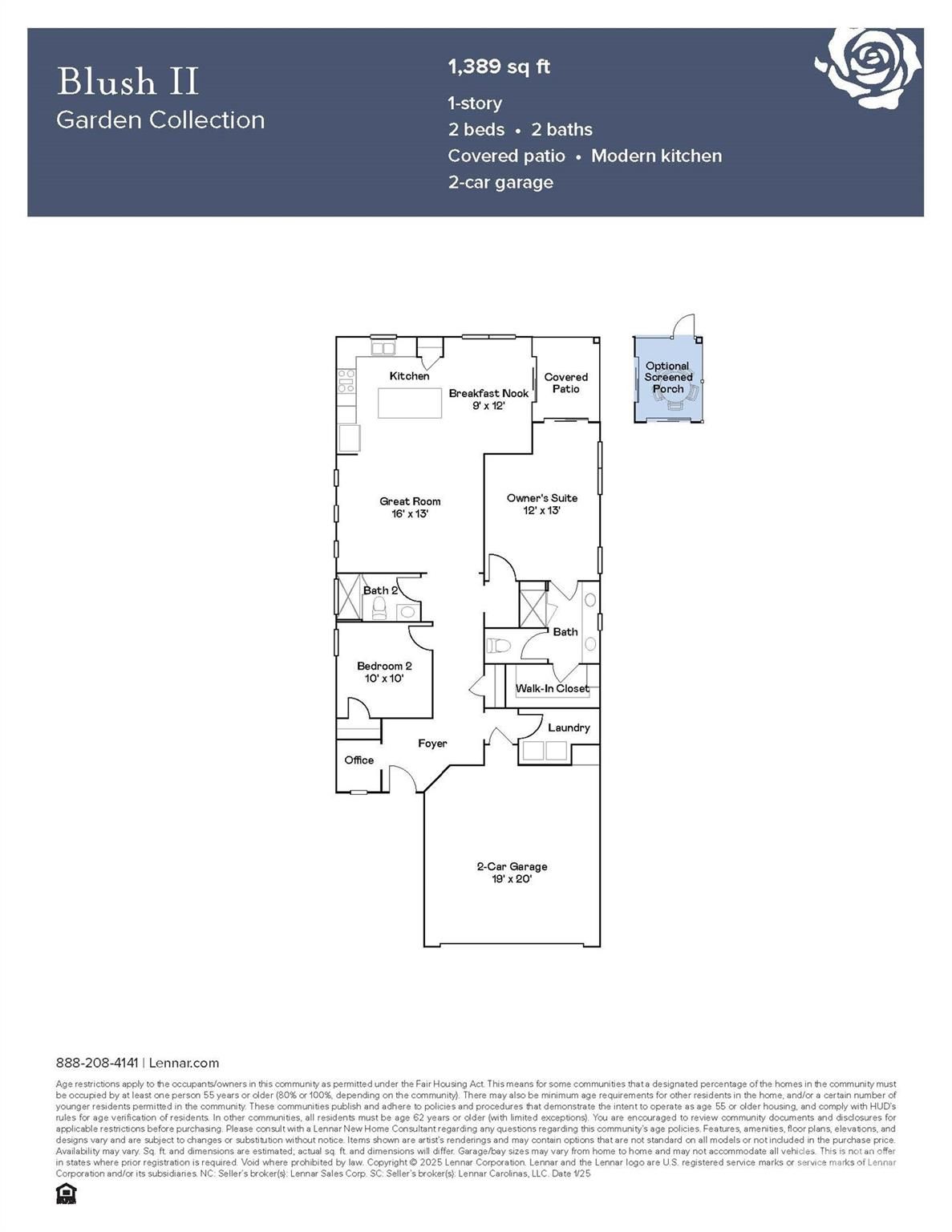 This new single-story Blush floorplan features a cohesive layout situated among the open-concept Great Room, well-equipped kitchen and breakfast room to promote seamless transitions between spaces. Through sliding glass doors is a covered porch for outdoor living, while off the foyer is a convenient office. In addition to the owner’s suite with an en-suite bathroom and porch access, there is a secondary bedroom well-suited for hosting guests. A two-car garage completes the home. Plus, our signature Everything's Included program means you will get a gourmet kitchen with double ovens and cooktop, quartz or granite kitchen countertops, subway tile backsplash, ceramic tile, luxury vinyl plank flooring throughout the home, and a gas fireplace (per plan). Roselyn is a master-planned community offering exclusive ranch homes designed for active adults.