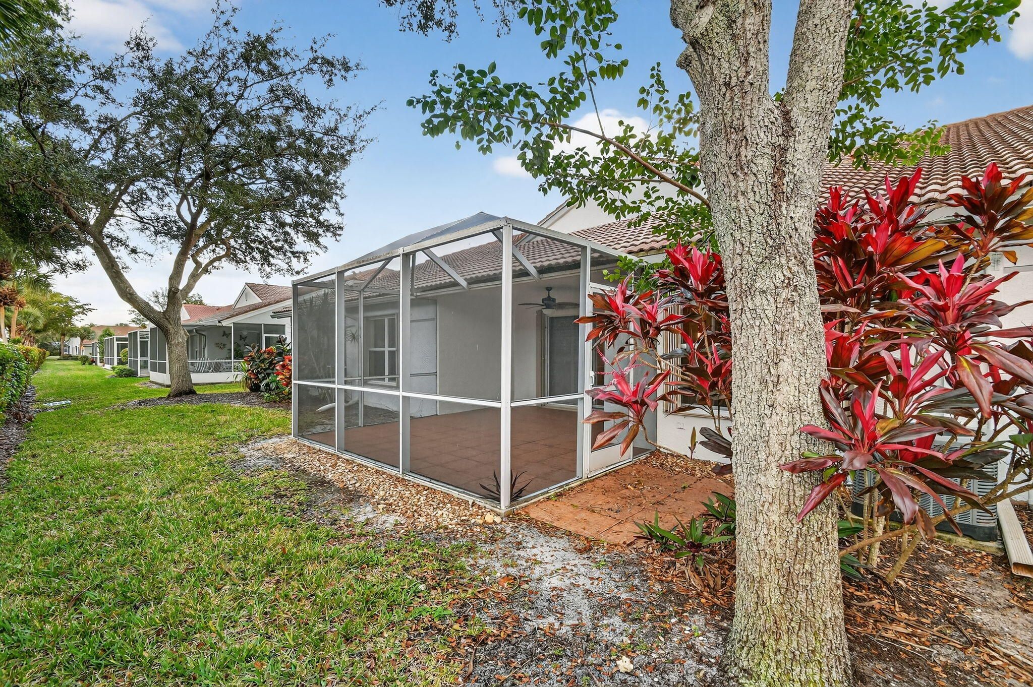 This immaculate light bright desirable La Tesora model with eat in kitchen is located on a great private north facing lot complete with extended screen patio with accordion shutters throughout. This spacious floor plan is move in ready complete with large neutral tile & wood planked flooring, 3 skylights, custom Plantation shutters on living room slider, cabinets in 3rd bedroom/den/office, custom built in closet in large primary closet, newer stainless appliances, 2 year old water heater, large one car garage with finished flooring & cabinets, upgraded washer & dryer with pedestals, cabinets & custom shade along with lot of closets. Enjoy the fabulous new clubhouse & fitness center complete with cafe & active 55+ lifestyle. Vacant & available for a quick closing!