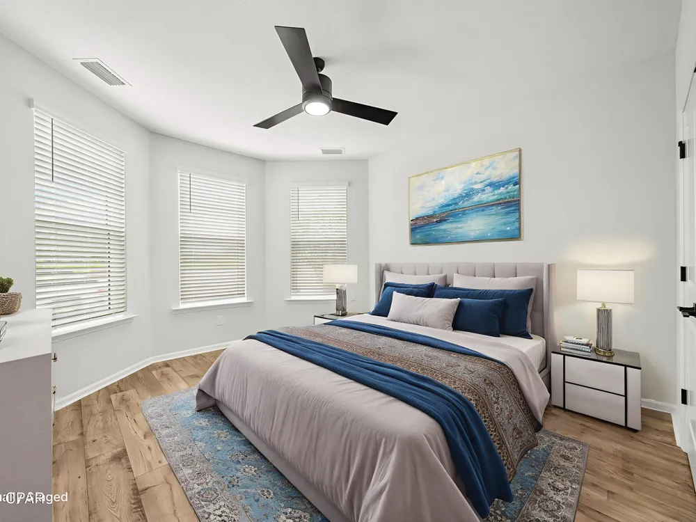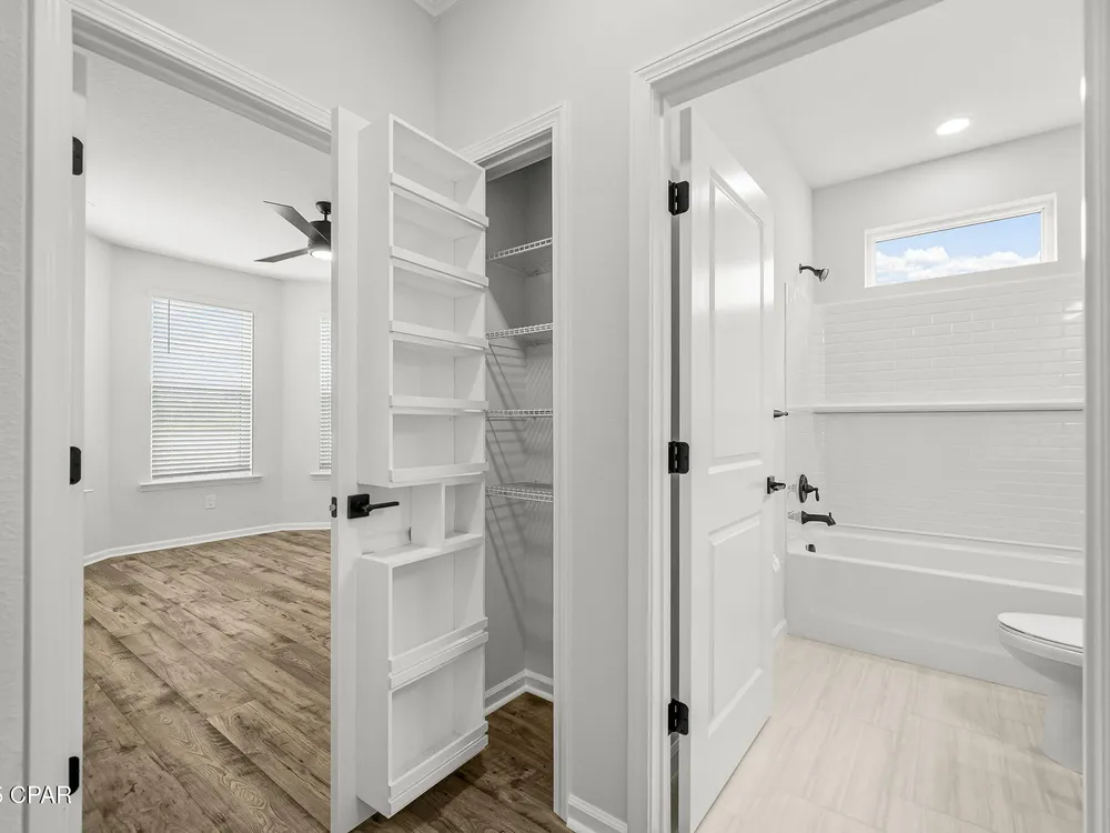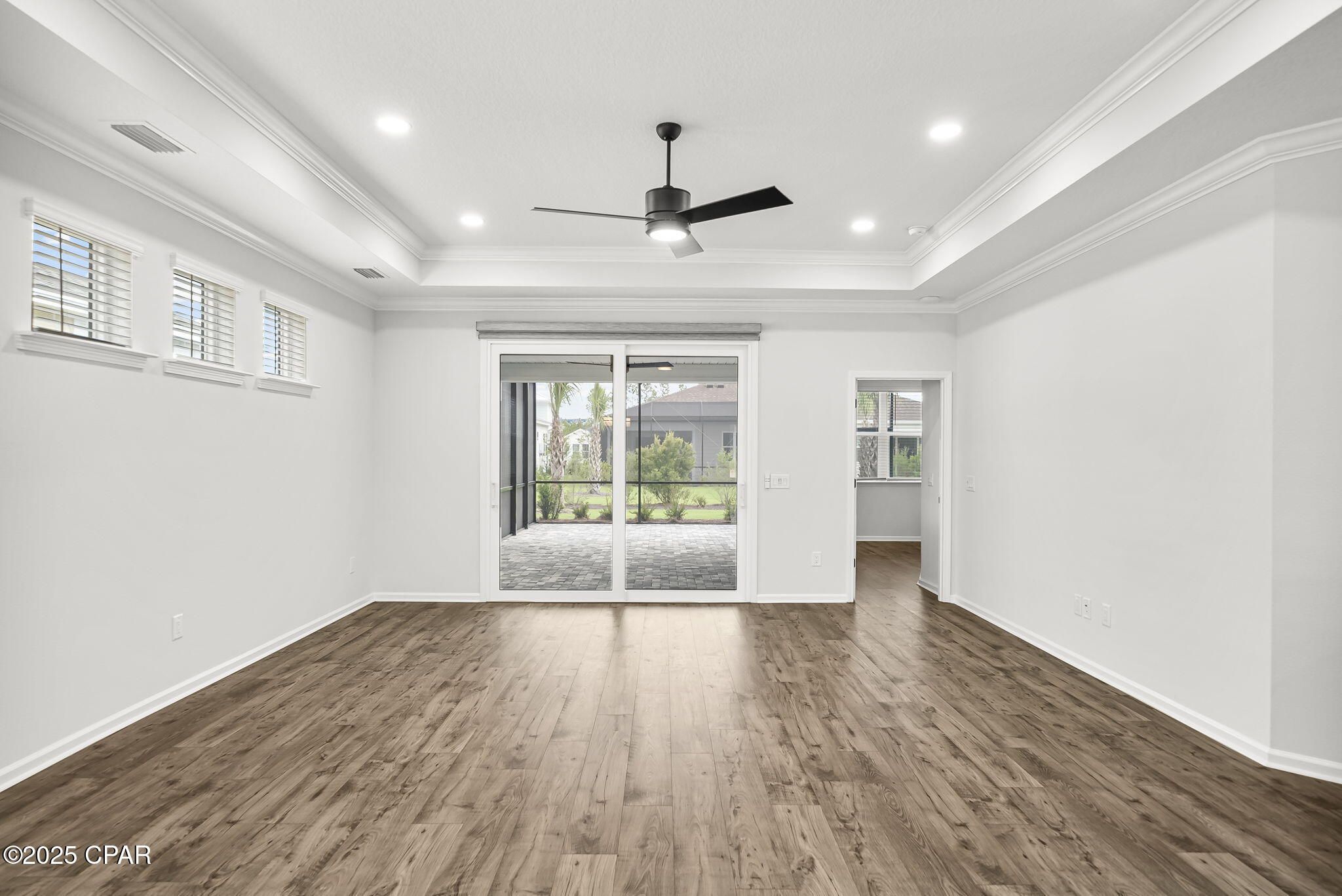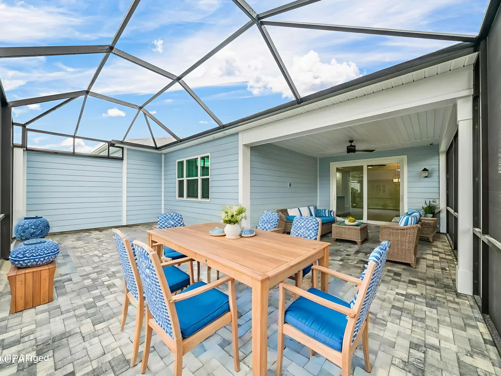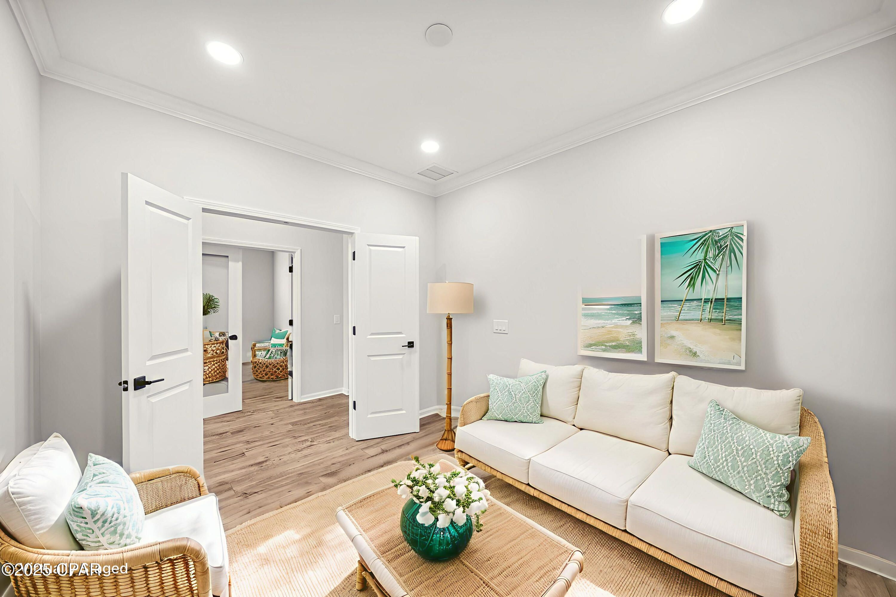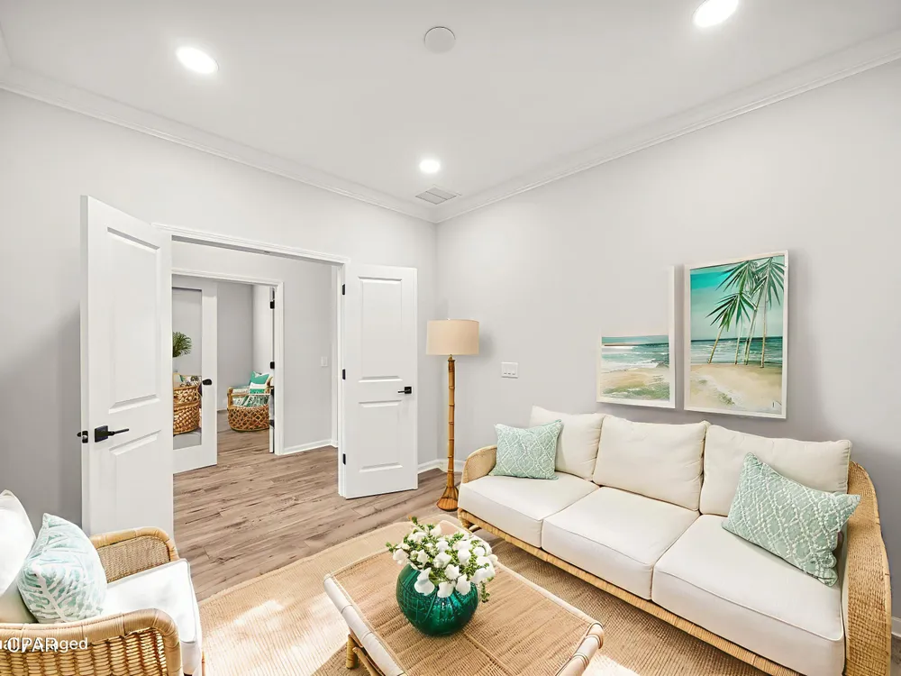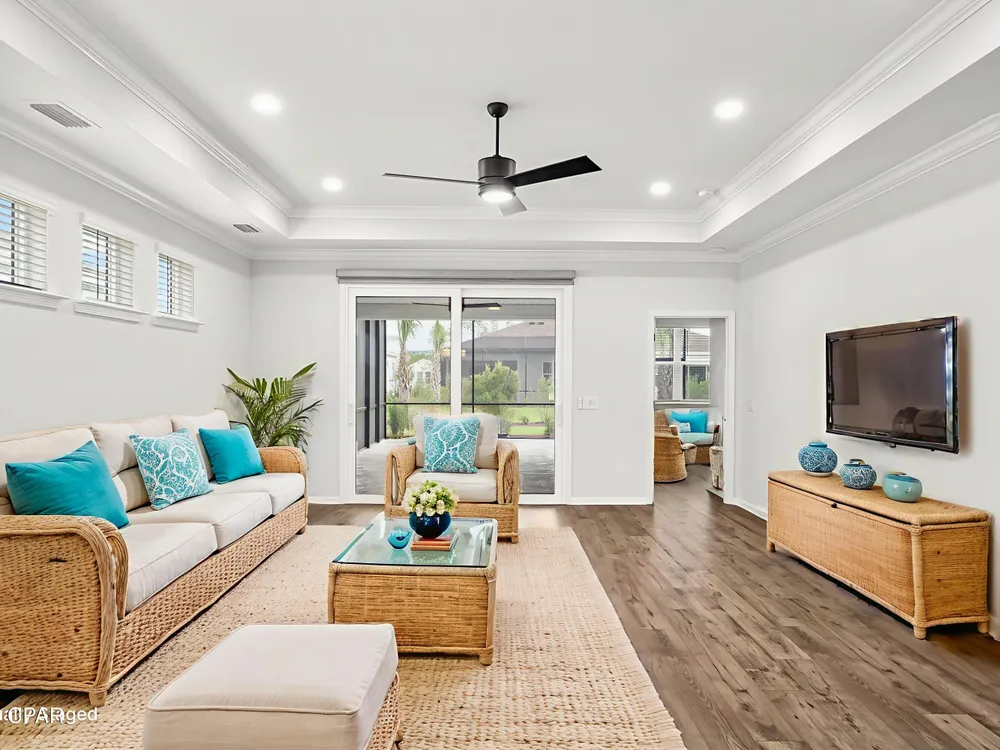 Brand New NEVIS villa. 2 Bonus Rooms/Den/Hobby! Welcome to your slice of paradise in the Jimmy Buffett-inspired 55+ community of Latitude Margaritaville Watersound! This beautifully appointed 2-bedroom, 2-bathroom villa comes with an impressive $94,000 in premium upgrades that transform this space into something truly special. Step inside and you'll immediately notice the attention to detail throughout. The whole house features impact doors and windows for peace of mind during storm season, plus custom Reserved White paint and elegant aged bronze door hardware that gives every room a cohesive, polished look. Crown molding in the common areas and gorgeous faux wood blinds add those finishing touches that make a house feel like home. The heart of this home is undoubtedly the stunning kitchen, where cooking becomes a joy rather than a chore. Granite countertops provide plenty of workspace, while the upgraded backsplash adds visual interest. The KitchenAid French door refrigerator with platinum interior keeps everything fresh and accessible. Under cabinet lighting illuminates your culinary creations, and thoughtful storage solutions like pull-out shelves and pots and pans drawers keep everything organized. The island features flat panel details that complement the soft-close cabinets throughout. The primary bedroom suite is your personal retreat, featuring an alternate bathroom layout with a seamless shower enclosure and convenient corner ledge. Quartz countertops and level 3 floor and shower wall tile create a spa-like atmosphere, while the oil rubbed bronze fixtures add warmth and character. A designer ceiling fan keeps things comfortable year-round. The second bedroom also boasts quartz countertops and level 3 floor tile, maintaining the home's high-end aesthetic throughout. The dedicated hobby room with solid French panel doors and recessed lighting gives you space to pursue your passions, while the den with French glass doors offers flexibility for whatever life brings. Your outdoor living space is equally impressive with an extended, screened and paver lanai perfect for morning coffee or evening cocktails. The outdoor ceiling fan and strategically placed outlets for lighting and television mean you can truly live the outdoor Florida lifestyle in comfort. Practical touches make daily life easier too. The laundry room features stackable LG ThinQ Smart electric units, upper and lower cabinets with sink, and granite countertops for folding. The whole house WiFi upgrade package keeps you connected, while the dedicated 20-amp garage outlet handles whatever projects you have in mind. Throughout the home, silverstone chestnut laminate flooring provides durability and style, while all tile and granite have been professionally sealed for longevity. Power blinds at the front door and remote blinds at the sliders add convenience and privacy control at your fingertips. The great room and family room feature recessed lighting and designer ceiling fans, creating comfortable gathering spaces for friends and family. Every detail has been thoughtfully considered and professionally executed, as confirmed by an independent third-party inspection completed after close with all items completed by Mastercare. This isn't just a house - it's your ticket to the relaxed, resort-style living that makes every day feel like a vacation in paradise.