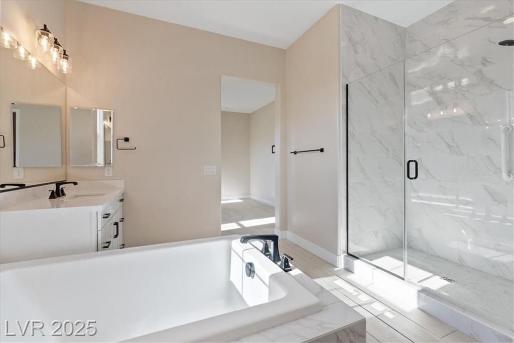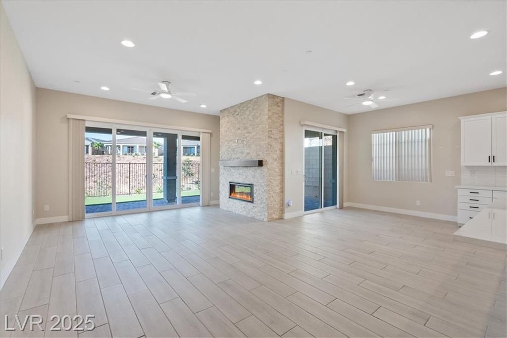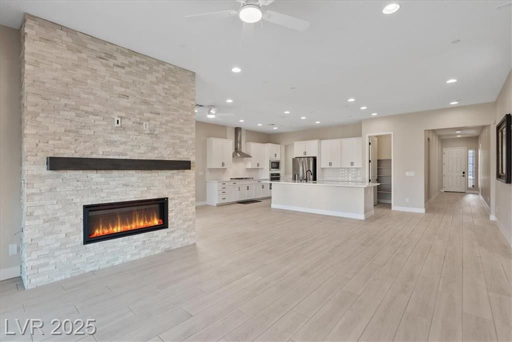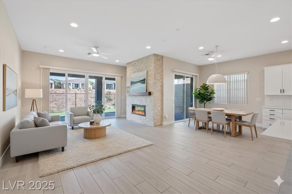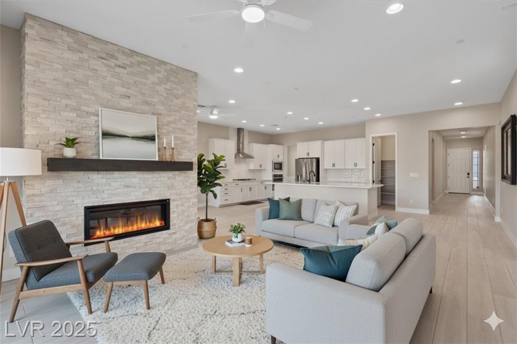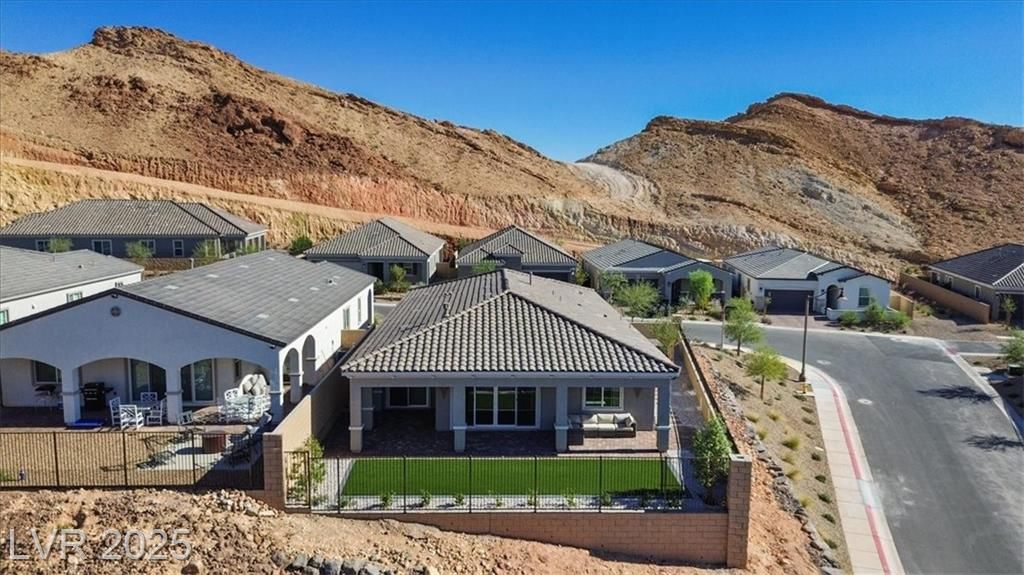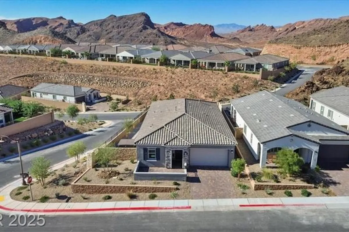 Discover this nearly new 2024 home in Lake Las Vegas, where stunning mountain views grace most rooms. Step inside to soaring 10' ceilings, elegant 8' doors, and a bright open layout anchored by a cozy gas fireplace. The gourmet kitchen impresses with GE Plus stainless appliances, quartz countertops, a tile backsplash, a walk-in pantry, and an expansive island with a breakfast bar; perfect for entertaining. Open the sliding doors to your backyard sanctuary: a large covered patio with a BBQ stub, fresh landscaping, and a hot tub with breathtaking mountain panoramas. A deluxe primary suite features a spa-inspired bathroom with dual vanities, a walk-in shower, a soaking tub, and a generous walk-in wardrobe. ceiling fans in all room. Enjoy Lake Las Vegas lifestyle, where resort style living and picturesque scenery define everyday life. Indulge in lakeside dining, shopping, water sports and golf, all enhanced by a transferable sports club membership that completes this exceptional lifestyle.