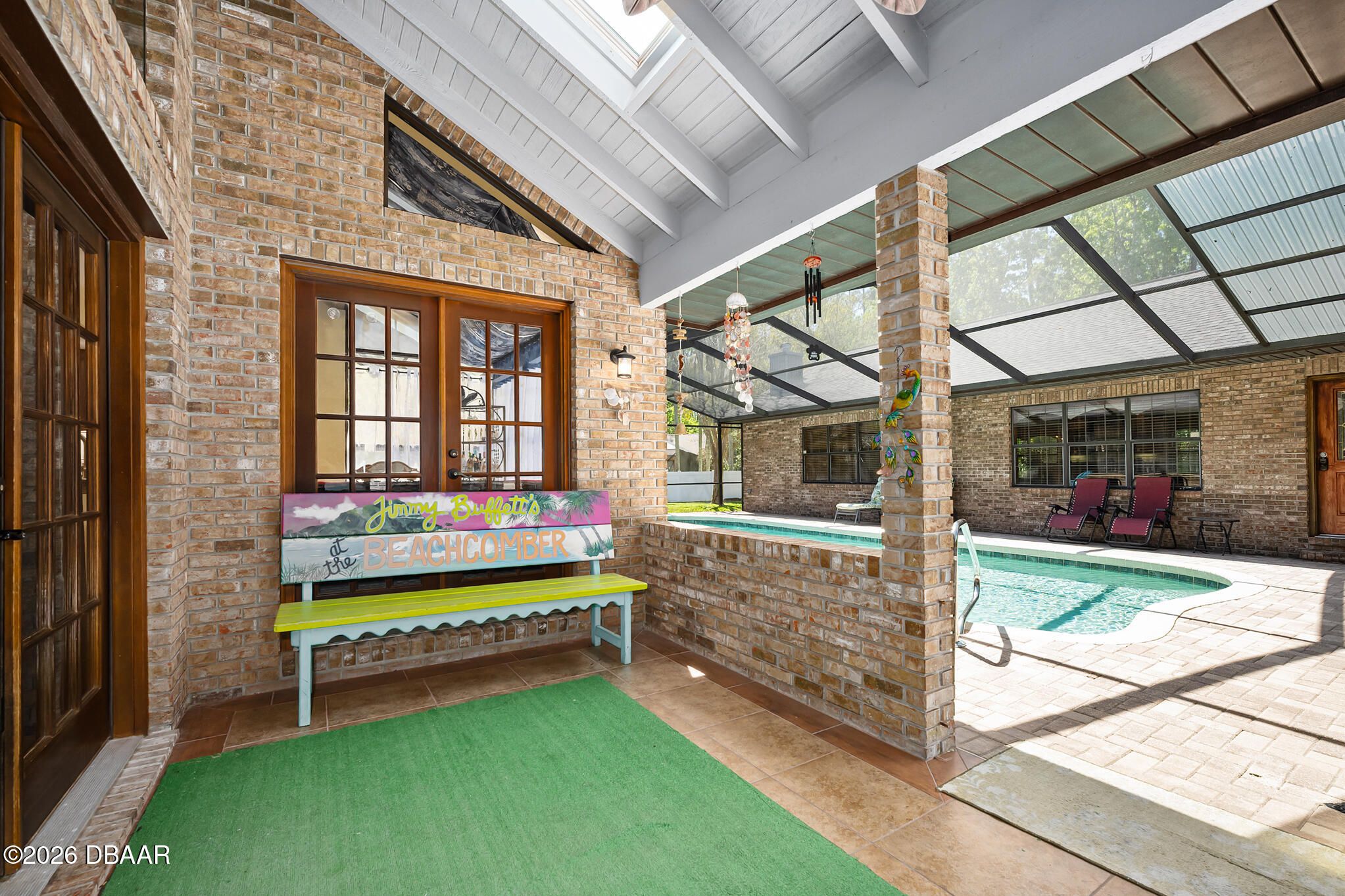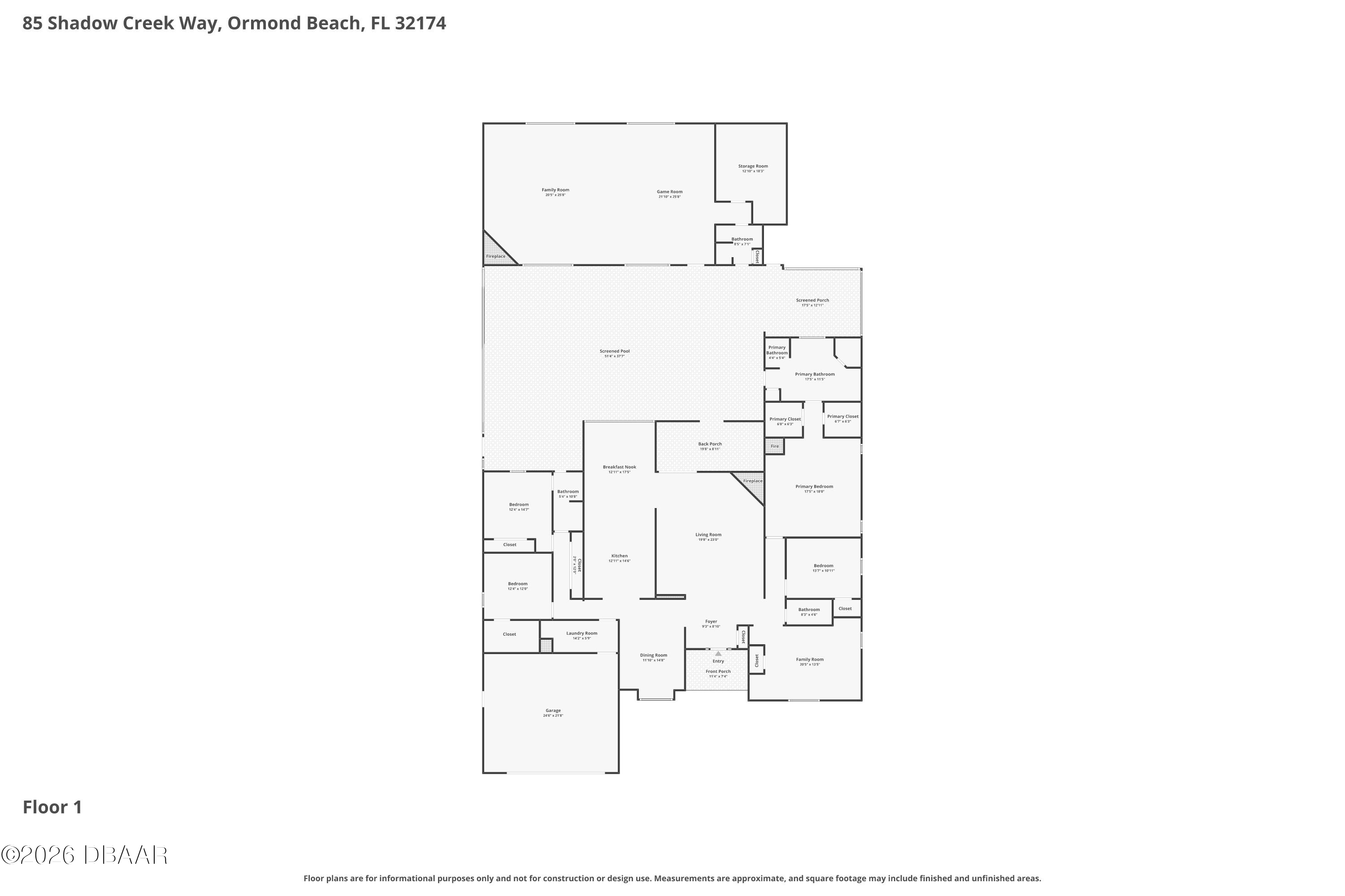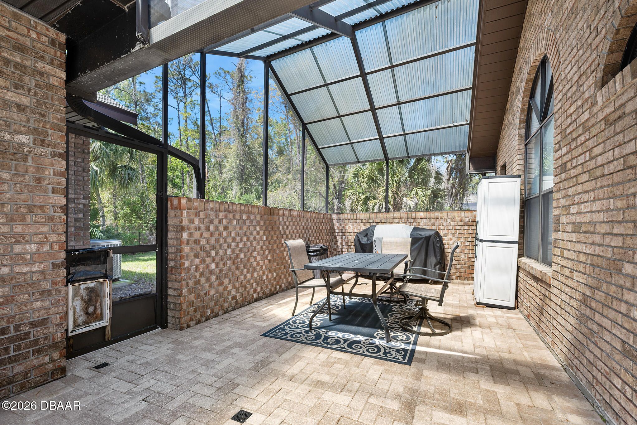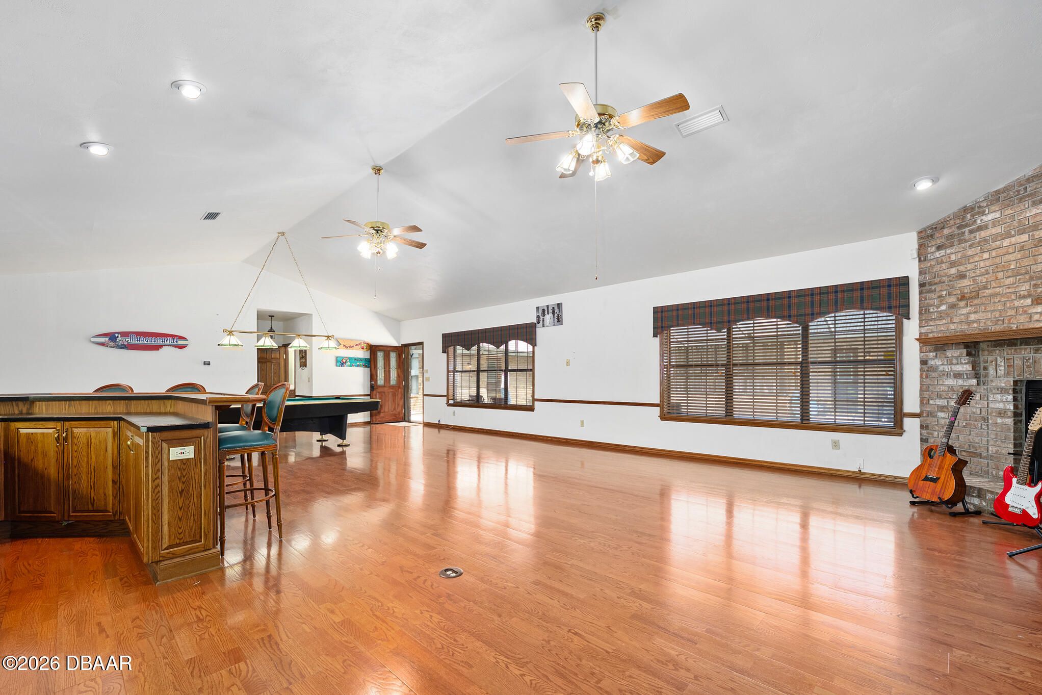 Spacious 4,400+ sq ft estate on a 3/4-acre lot backing to private preserve in prestigious, guard-gated Breakaway Trails, Ormond Beach with potential for a 2.25 percent assumable VA mortgage--a rare financing advantage in today's market! This custom brick home blends seamless indoor-outdoor flow, ideal for Florida's year-round lifestyle of relaxation, family gatherings, and effortless entertaining. Centered around a screened private pool, it offers multiple living areas, vaulted ceilings with a stunning brick fireplace in the living room, and generously sized bedrooms--including a luxurious primary suite with dual walk-in closets/fireplace, spa-like bath (jacuzzi tub, walk-in shower, dual vanities, pool access), plus guest rooms with direct pool access. The dual-access kitchen impresses with real wood cabinets, granite counters, stainless appliances, central island, wet bar, wine racks, and a glass-enclosed breakfast nook overlooking the pool. The standout separate bonus building (2023 roof), connected via the pool area, provides a large open entertaining space with full wet bar, built-in entertainment center, fireplace, 9ft billiard table, storage closet, and full bath with walk-in shower--perfect for guests, family, or hosting gatherings away from the main home. Residents enjoy 24/7 security and resort-style amenities: community pool/clubhouse, tennis, pickleball and basketball courts, children's park, and beautifully maintained sidewalk-lined streets--delivering a true neighborhood feel with resort perks in this prime location.