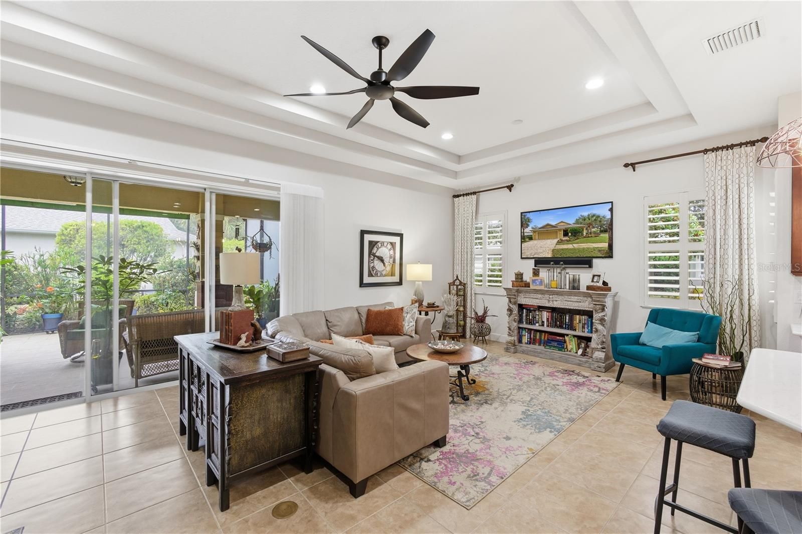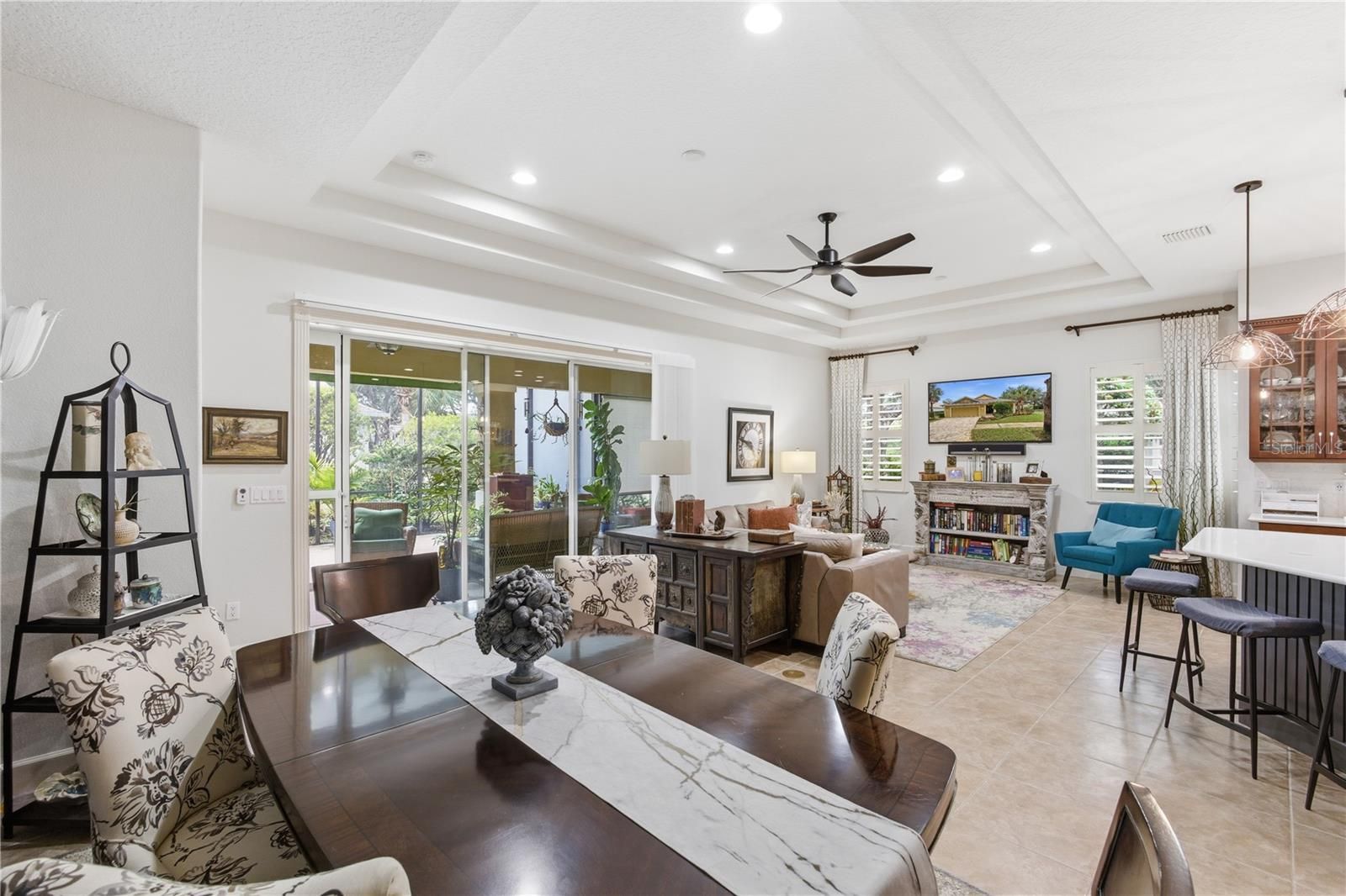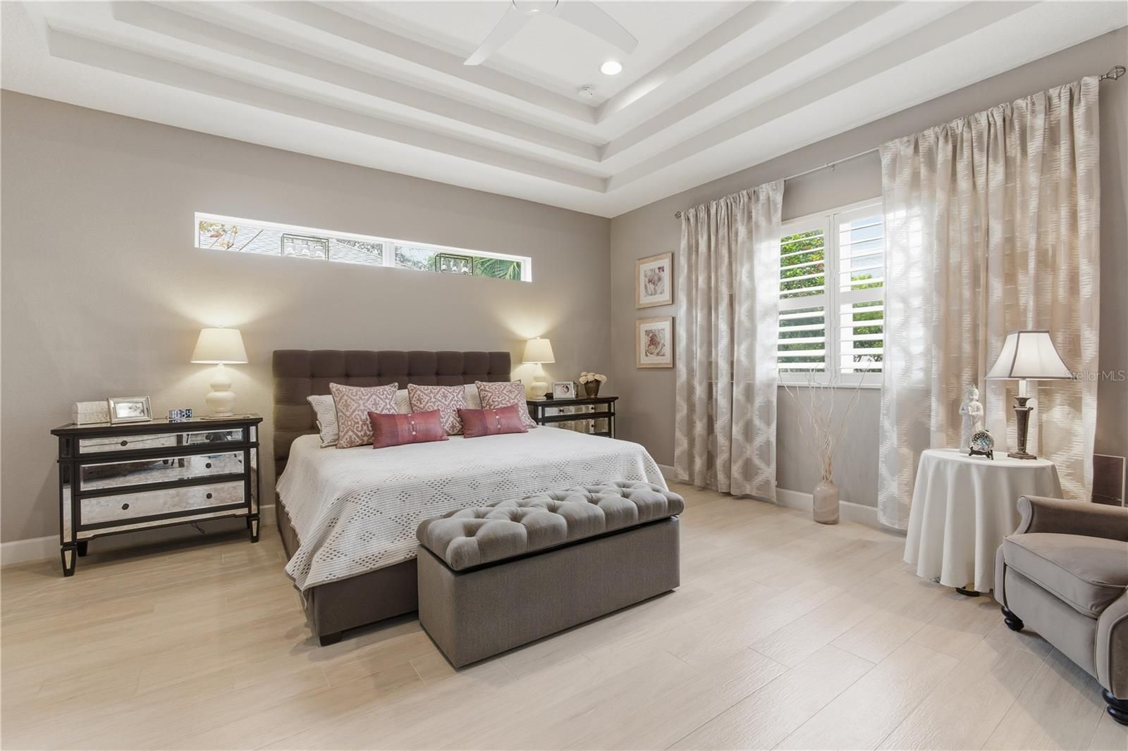 - Built-in Features, Ceiling Fan(s), Coffered Ceiling(s), Crown Molding, Eat-in Kitchen, High Ceilings, Living/Dining Room, Open Floorplan, Main Level Primary, Solid Surface Counters, Solid-Wood Cabinets, Split Bedrooms, Stone Counters, Thermostat, Tray Ceiling(s), Walk-In Closet(s), Window Treatments
