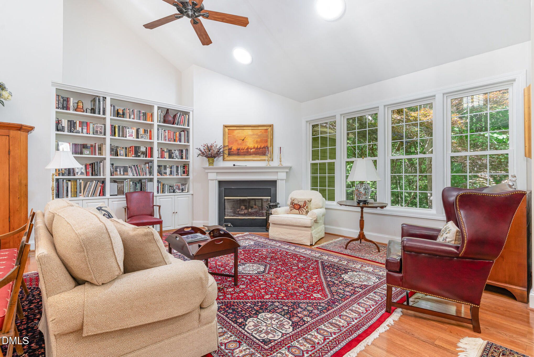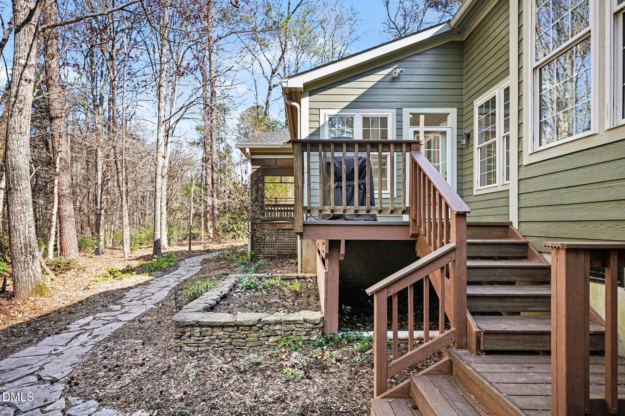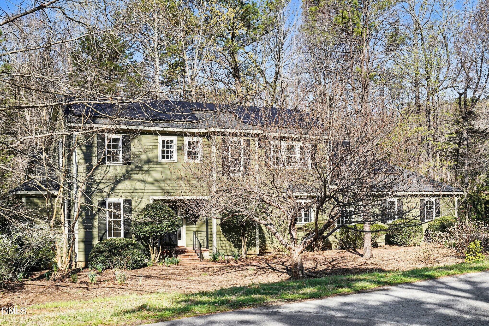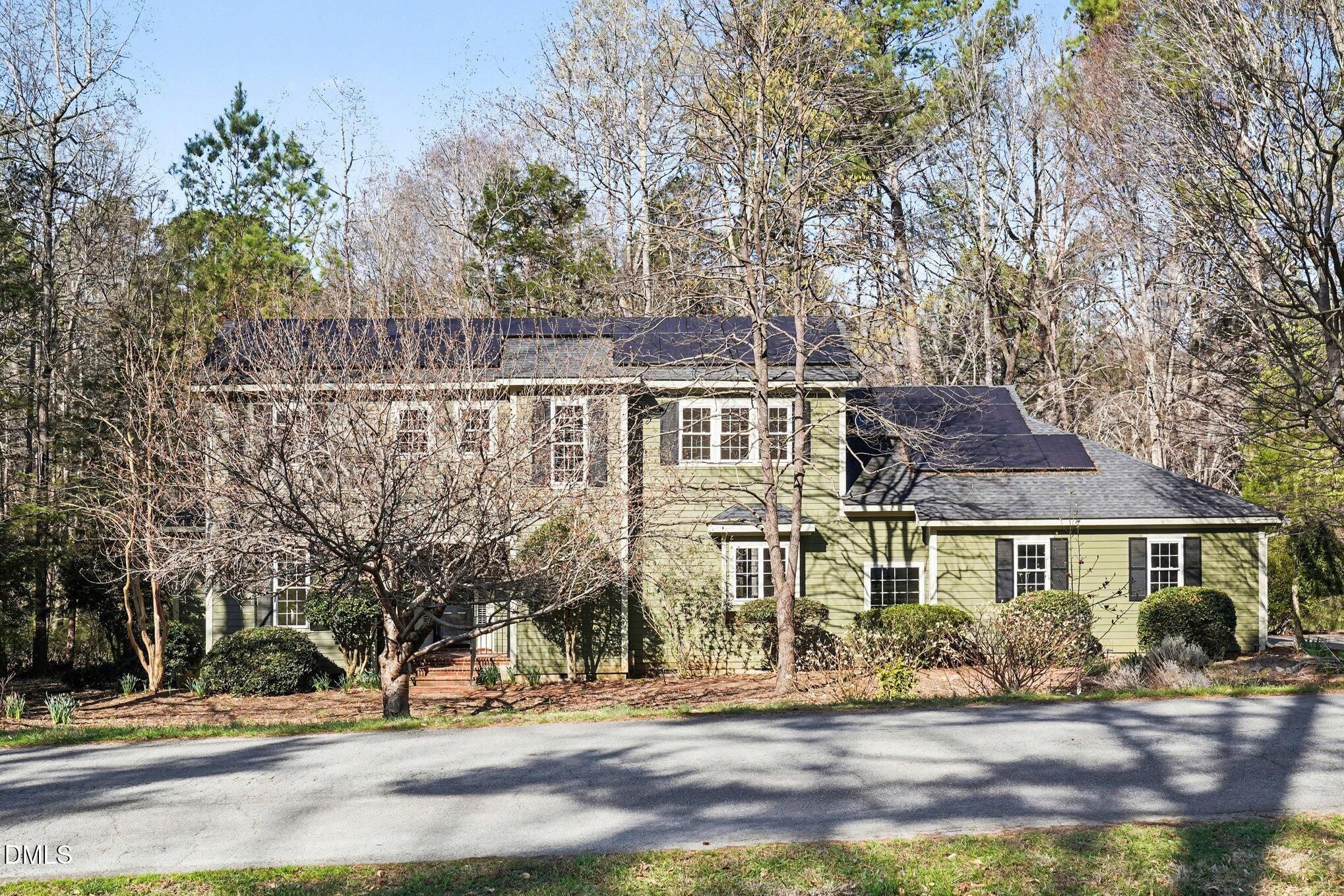 This well updated, 3-bedroom, 2.5-bath home, with large 2-car garage, and an open floorplan, benefits from a private setting and a corner lot. Positioned on almost an acre, the home allows views of the lovely natural areas with seasonal views of the adjoining creek. Included in the home's many modern features are solar panels which lower energy costs, and a low-maintenance exterior. Throughout the home there are many large windows and solar tubes that allow natural light to steam into the interiors. Guests are greeted by an ample foyer and living room. This space boasts built-in shelving with cabinetry, a gas-log fireplace, and vaulted ceilings. Adjoining this area are the dining room and kitchen. The cook's kitchen includes ample cabinetry and counter space, a pantry, multiple storage options, a breakfast area, and room for seating at the island. Stainless-steel appliances include a dishwasher, a gas cook top with downdraft, an electric wall oven, a built-in microwave, and a double door refrigerator. A large passthrough between the kitchen and dining room makes entertaining a breeze. Through the dining room is the family room. This is a large space with many windows and access to the deck and impressive screened porch with artisan detailing. Also on the main level are an office and the primary bedroom suite. The primary bedroom suite boasts large closets, plantation shutters, and a spa-like bathroom with custom tile shower with two shower heads, and two vanities. Upstairs two additional bedrooms are found. A loft space could be a sitting room or library. The home is surrounded by well-maintained garden areas, and many native and rare plants are found amongst the plantings. Indoor and outdoor spaces have an easy flow, perfect for entertaining. Additional features of the home include a spacious laundry room with sink, an exterior storage room, and ample attic space accessed by a door on the second level. This home is the perfect blend of privacy, woodland views and low-maintenance features, coupled with Fearrington Village's many amenities.