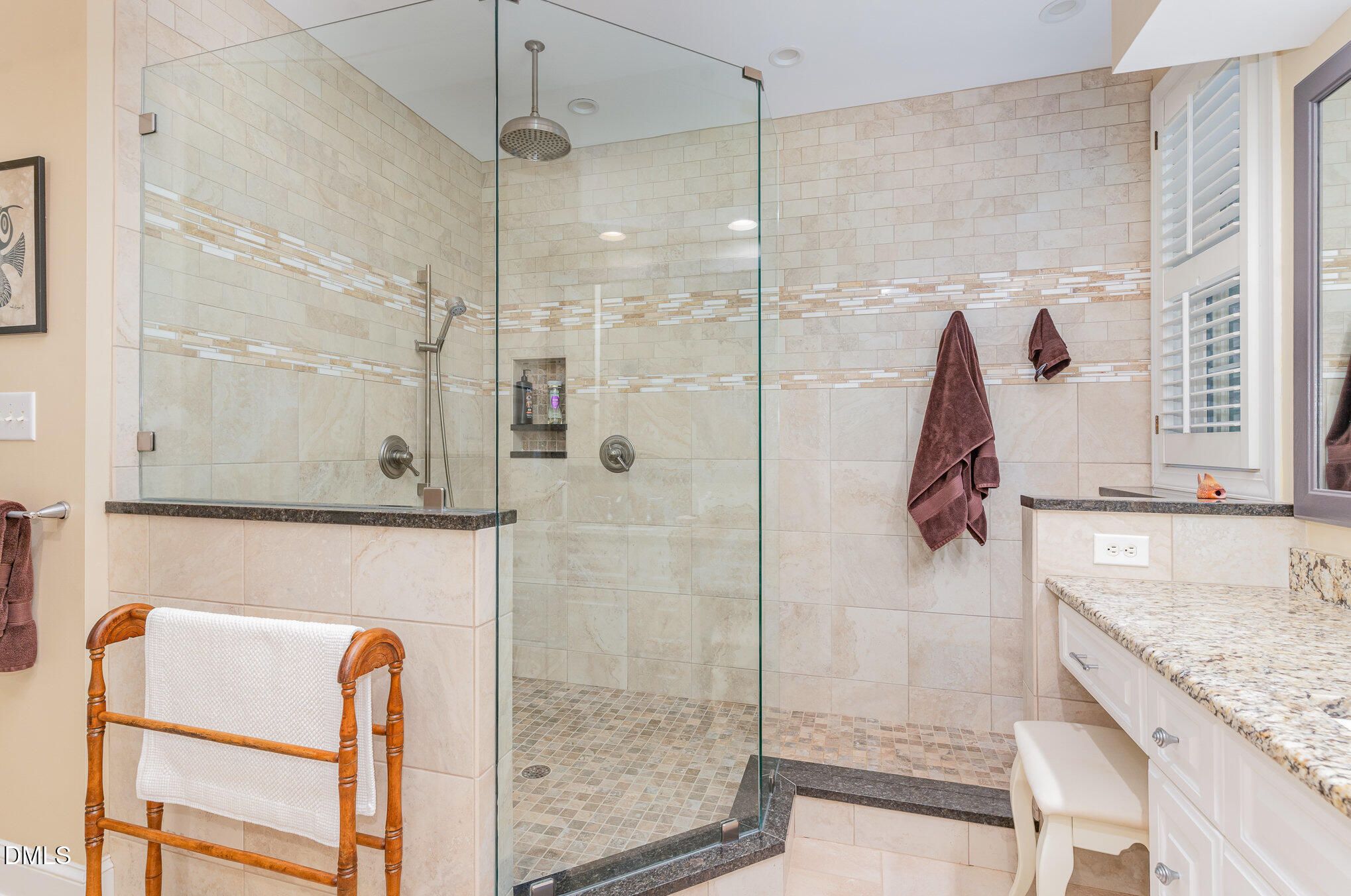 - Bookcases, Built-in Features, Ceiling Fan(s), Double Closet, Eat-in Kitchen, Entrance Foyer, Granite Counters, High Ceilings, Kitchen Island, Pantry, Master Downstairs, Recessed Lighting, Stall Shower, Smooth Ceilings, Solar Tube(s), Storage, Vaulted Ceiling(s), Walk-In Closet(s)