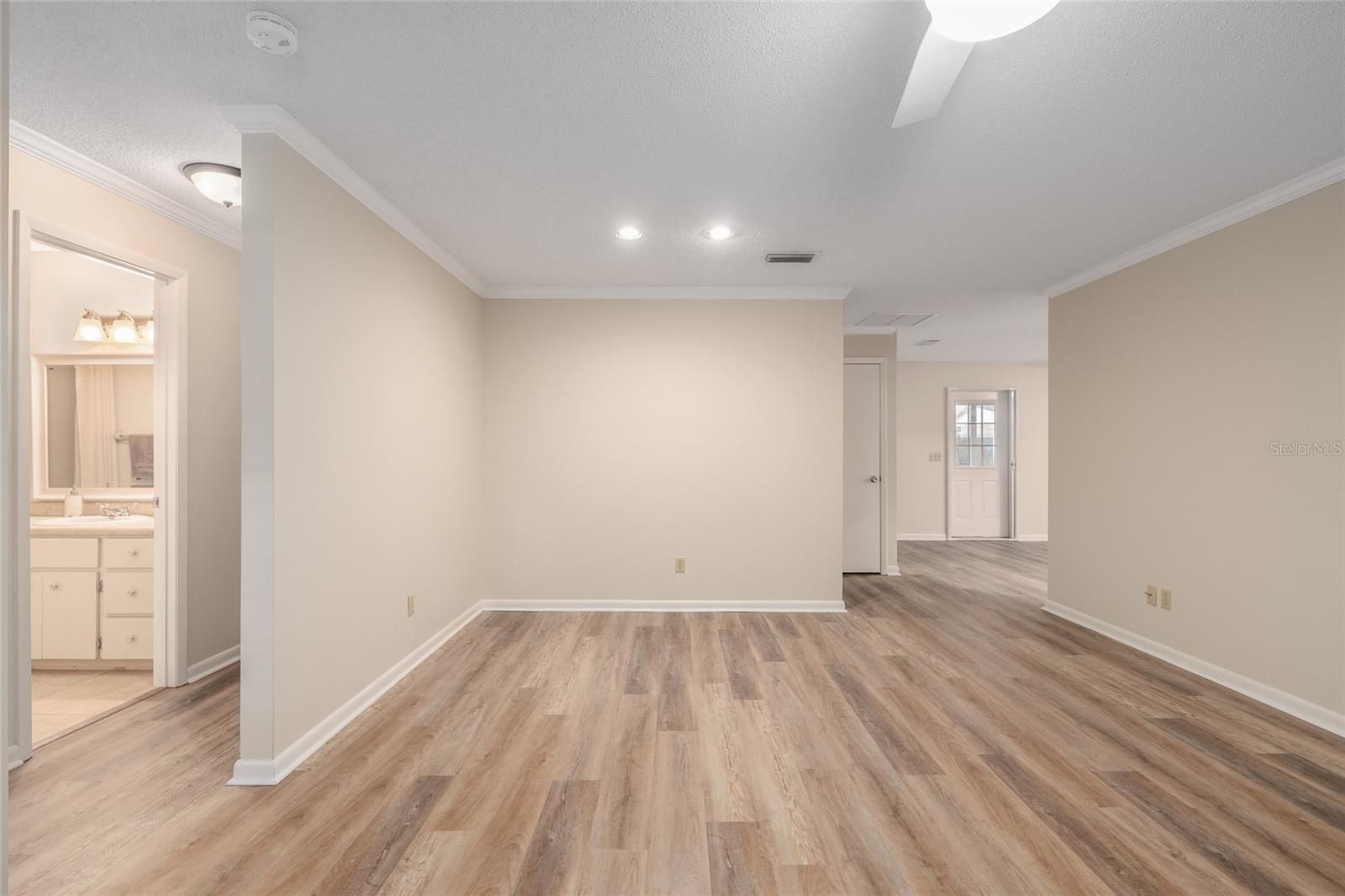 - Ceiling Fan(s), Crown Molding, Eat-in Kitchen, Kitchen/Family Room Combo, Living/Dining Room, Main Level Primary, Walk-In Closet(s)
