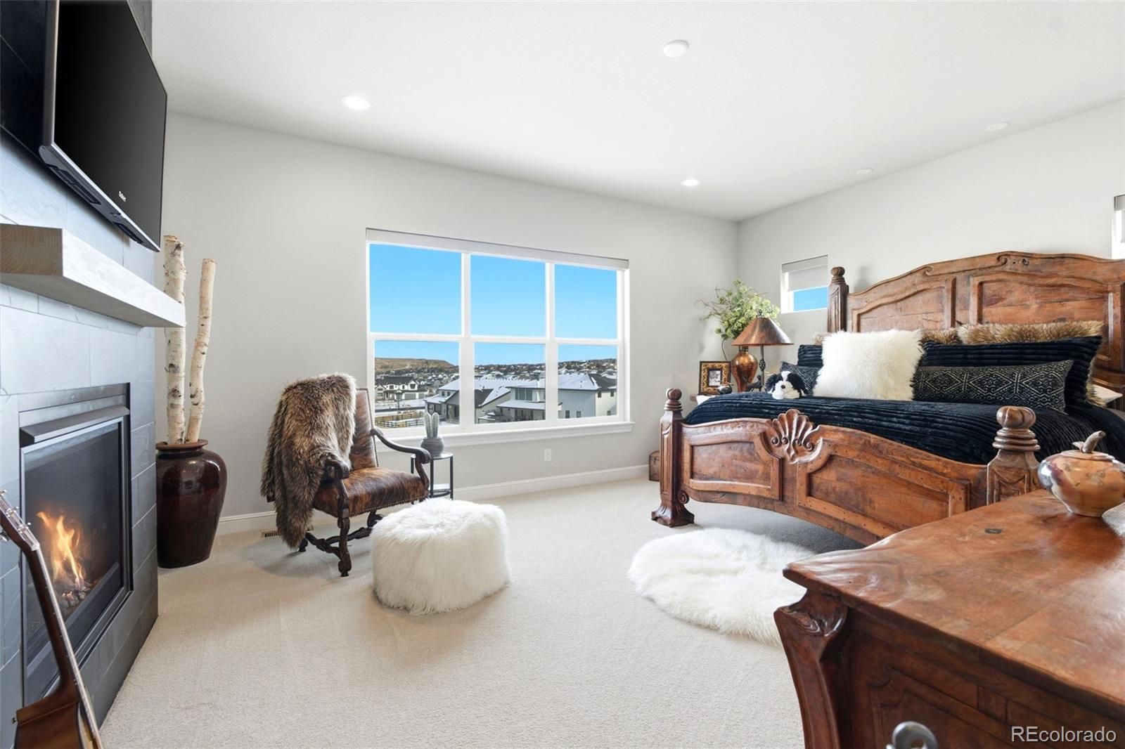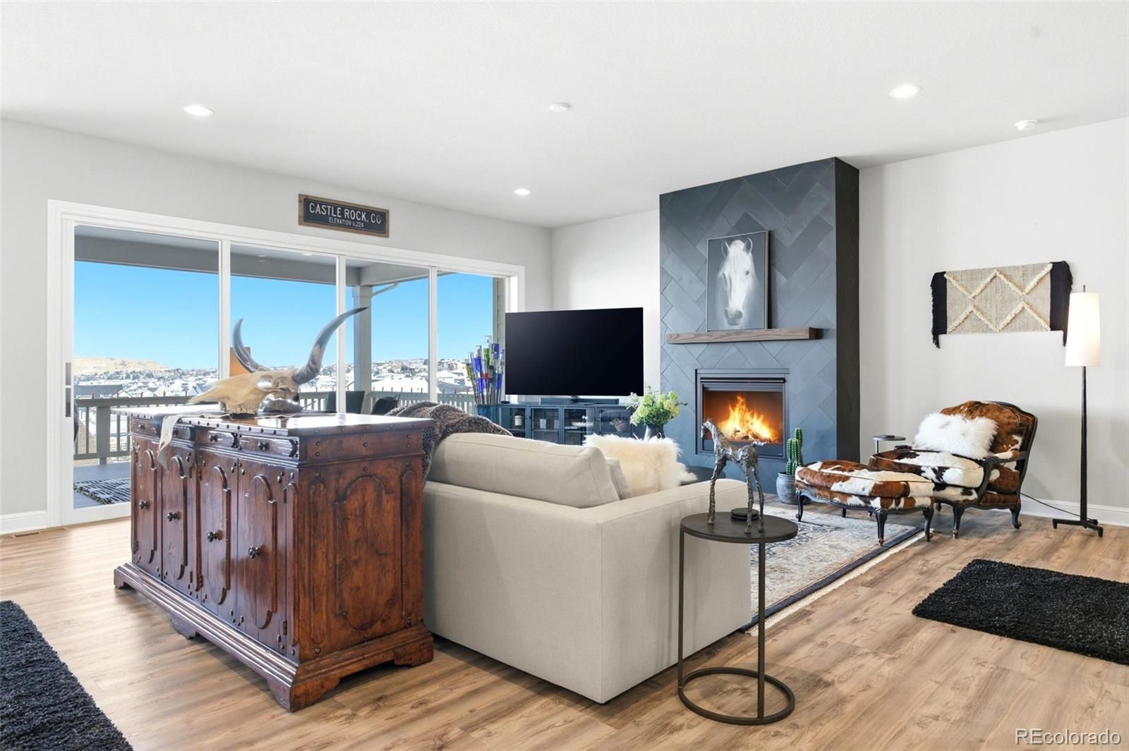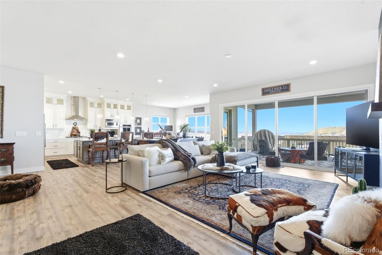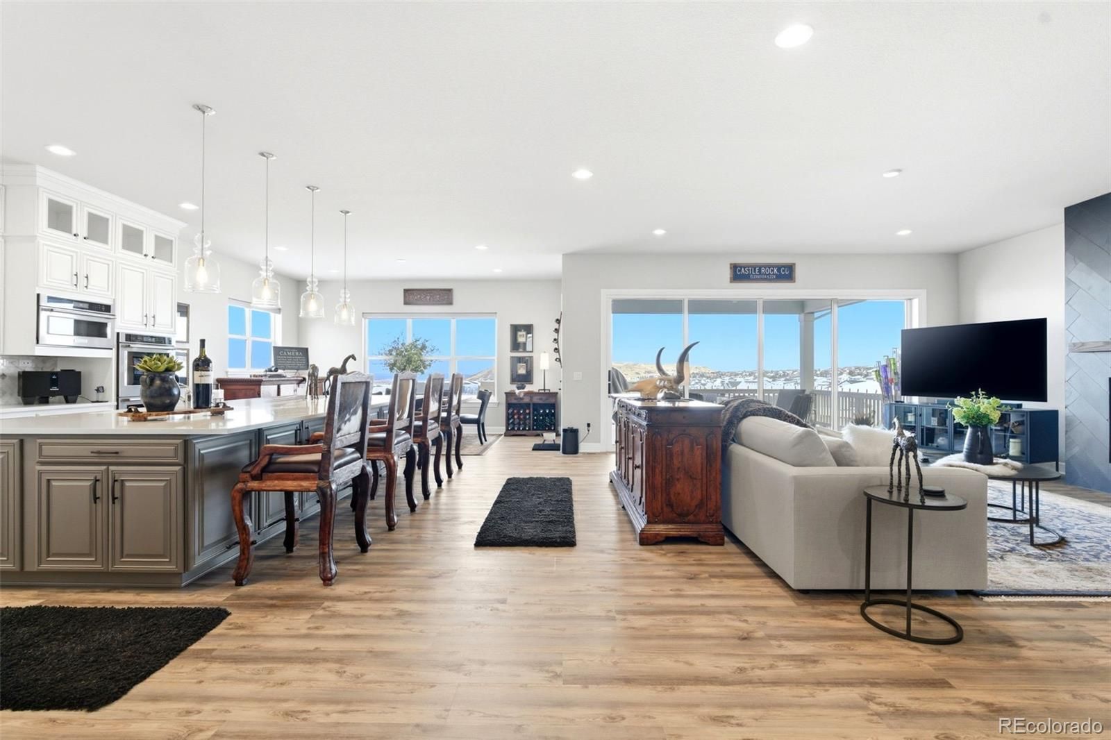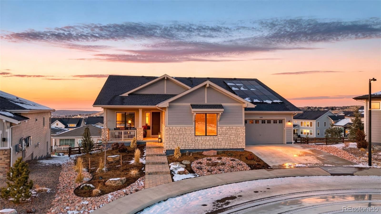 Welcome to effortless main-level living in Montaine’s sought-after Regency Collection, Castle Rock’s premier 55+ luxury community. Ideally located on a quiet cul-de-sac, this 2022 Toll Brothers ranch offers refined design, low-maintenance living, and an active lifestyle just minutes from downtown Castle Rock. The open-concept floor plan is filled with natural light and features high ceilings, wide plank flooring, and a stunning great room with front range views, gas fireplace and large nesting sliding glass doors, creating a seamless indoor-outdoor flow perfect for entertaining. Electronic window coverings throughout the home add modern convenience and a polished finish. The gourmet kitchen is the heart of the home, showcasing an oversized island, custom cabinetry, quartz and granite countertops, double ovens, walk-in pantry, and generous prep space—ideal for both everyday living and hosting. The primary suite is a private retreat, complete with its own gas fireplace, radiant heated floors in the spa-inspired five-piece bath, and a spacious walk-in closet. A secondary bedroom with ensuite bath and a dedicated home office provide flexibility for guests, hobbies, or work-from-home needs. Convenient main-level laundry enhances ease of living. Step outside to the covered composite deck and enjoy open views and peaceful surroundings. The south-facing driveway naturally melts snow, a thoughtful Colorado convenience. Additional highlights include owned solar panels, central A/C, an oversized 3-car garage with EV hookup, and a level, professionally landscaped lot. The walk-out basement is unfinished and ready for future expansion. Montaine offers a true resort lifestyle with pickleball, tennis, bocce, lap and lounge pool, spa, clubhouse, fitness center, and over 13 miles of trails across 548 acres of open space. Snow removal and trash are included. This is downsizing done right—luxury, comfort, and community in one exceptional home.
