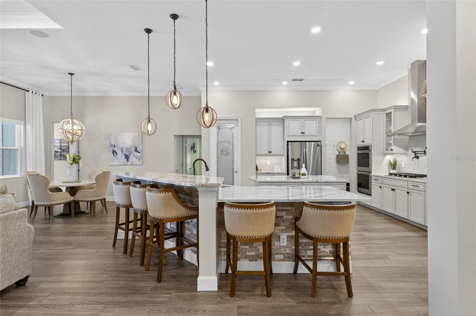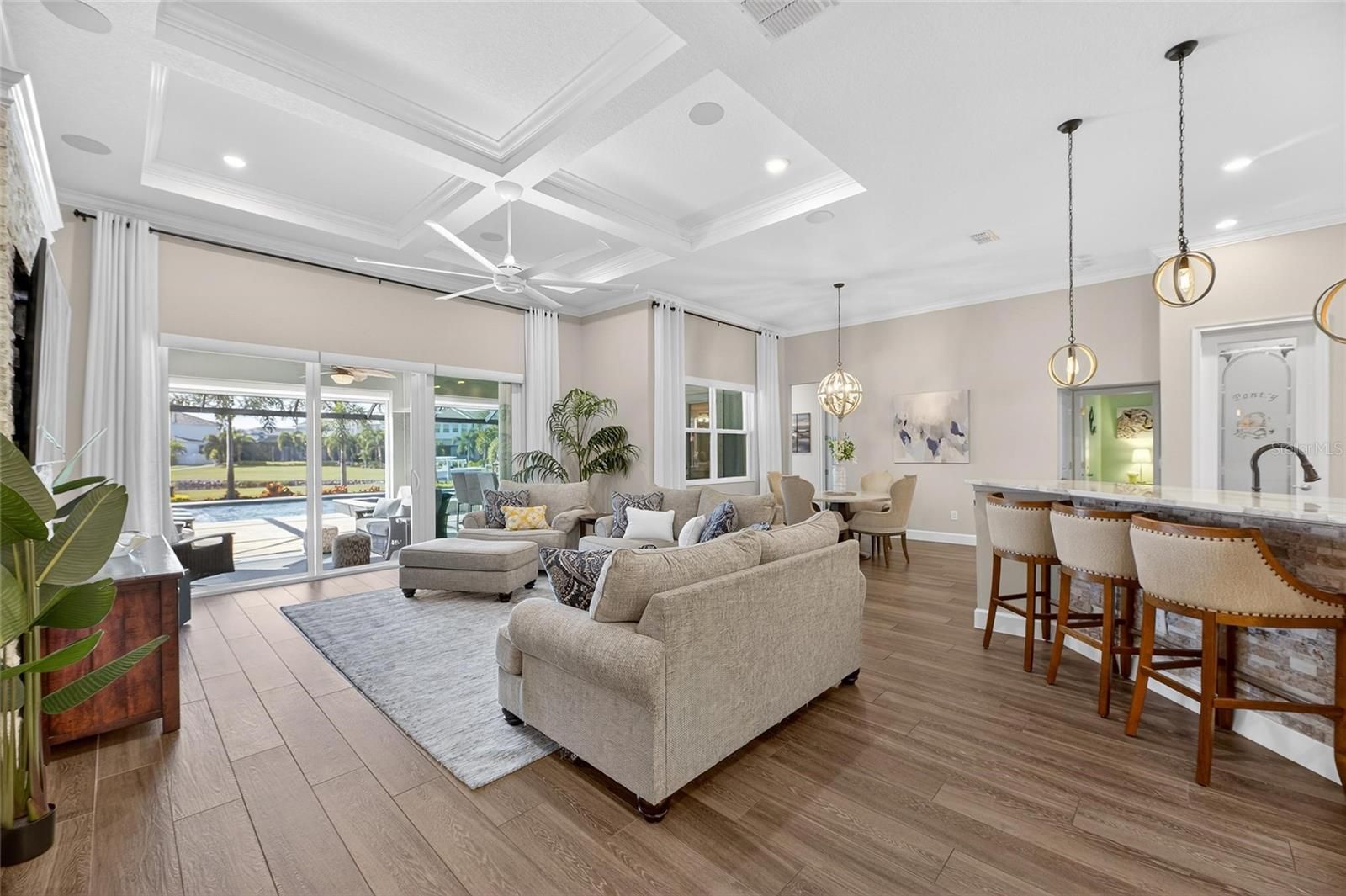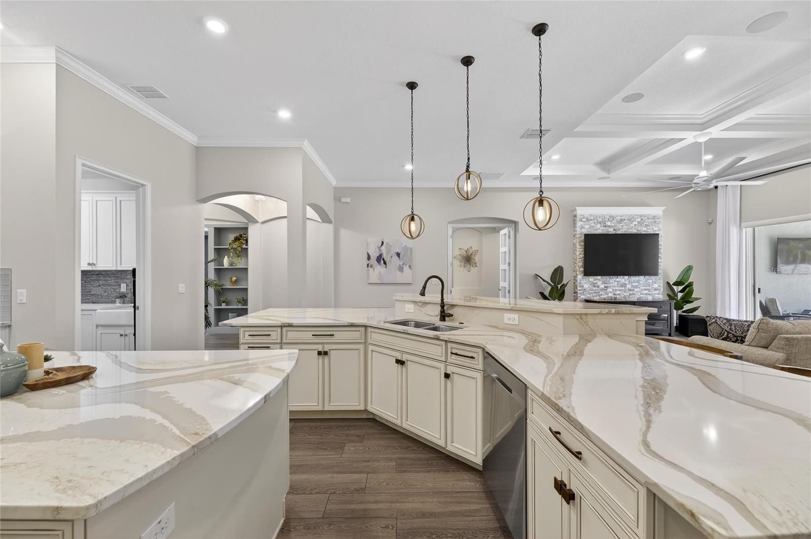 - Built-in Features, Ceiling Fan(s), Coffered Ceiling(s), Crown Molding, Dry Bar, Eat-in Kitchen, High Ceilings, Kitchen/Family Room Combo, Living/Dining Room, Open Floorplan, Main Level Primary, Smart Home, Split Bedrooms, Tray Ceiling(s), Walk-In Closet(s), Wet Bar, Window Treatments