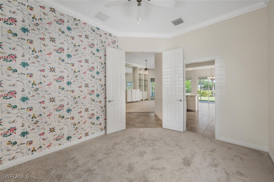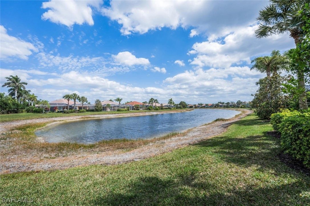 2025 new carpet in 3 bedrooms and office, new stainless steel refrigerator / ice maker, electric range, microwave and dish washer, LENNOX HIGH EFFICIENCY HVAC air conditioning unit. This popular “Oakmont” floor plan is ideal, great curb appeal with side load garage, and extra long drive way. Open and bright with 12’ ceilings, 3 bedrooms, 3 baths, * primary has double baths, office, screened-in lania, and 2-car garage. New roof, water heater, washer/ dryer in 2022. Nothing is overlooked except for the LAKEFRONT view! This is a gem and ready for the buyer who wants it all right now!. No pool but plenty of room to design your own. Verona Walk is the ultimate gated resort community with phenomenal pool, spa, fitness center, pickle ball, tennis, walking paths, clubhouse, amazing social events, gas station, basketball ball courts, private mailboxes and a full time post office open daily, a salon ,and restaurant. You’ll never have to leave.