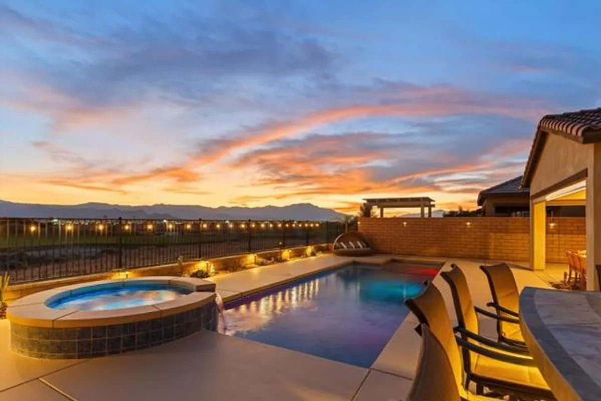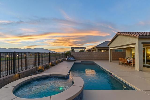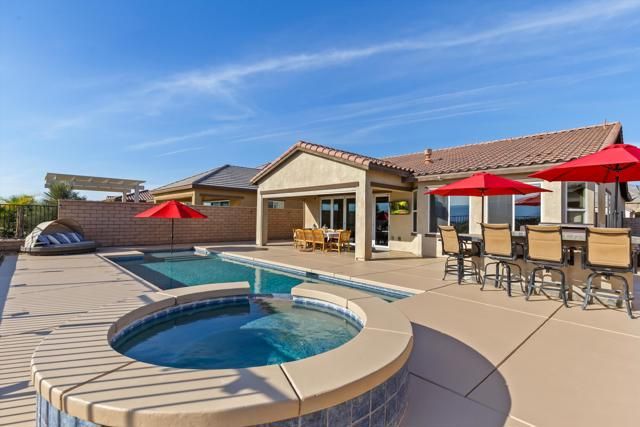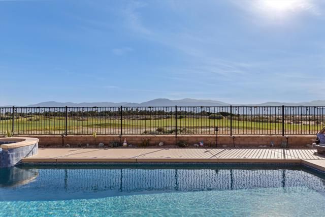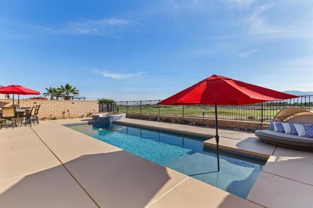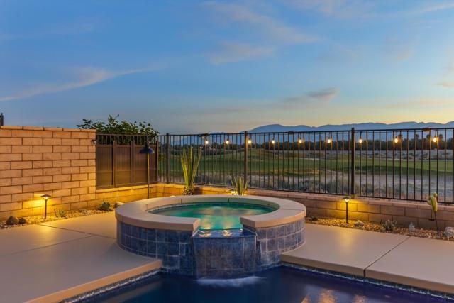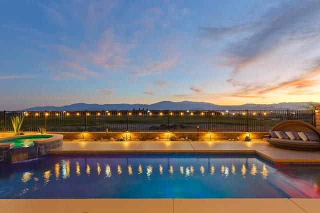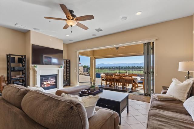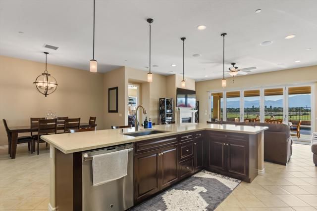 Welcome to resort style living at its finest in the prestigious guard gated community of Four Seasons Terra Lago. This beautifully appointed 3 bedroom, 2.5 bath home spanning 2,152 square feet offers an unparalleled combination of elegant interior spaces and breathtaking outdoor living, all set against sweeping golf course and mountain views.Step inside to discover a grand open-concept great room where the gourmet kitchen, dining, and living areas flow seamlessly together beneath soaring ceilings. The chef's kitchen features rich espresso cabinetry, a stunning mosaic tile backsplash, stainless steel appliances, and an oversized island with bar seating for five, perfect for entertaining. Walls of sliding glass doors bathe the interior in natural light while framing postcard worthy views of the fairways and San Bernardino Mountains beyond.Outside, your own private oasis awaits. The expansive covered patio, complete with a ceiling fan, mounted TV, and outdoor kitchen with dining for eight, overlooks a sparkling lap pool and spa with cascading waterfall. As the sun dips below the mountains, the pool lights illuminate and the desert sky transforms into a canvas of color, making every evening feel like a special occasion.Residents of Four Seasons Terra Lago enjoy world class 55+ community amenities including a clubhouse, fitness center, tennis and pickleball courts, and an active social calendar, all just minutes from the shopping, dining, and entertainment of the greater Palm Desert area.This is more than a home. It's a lifestyle.