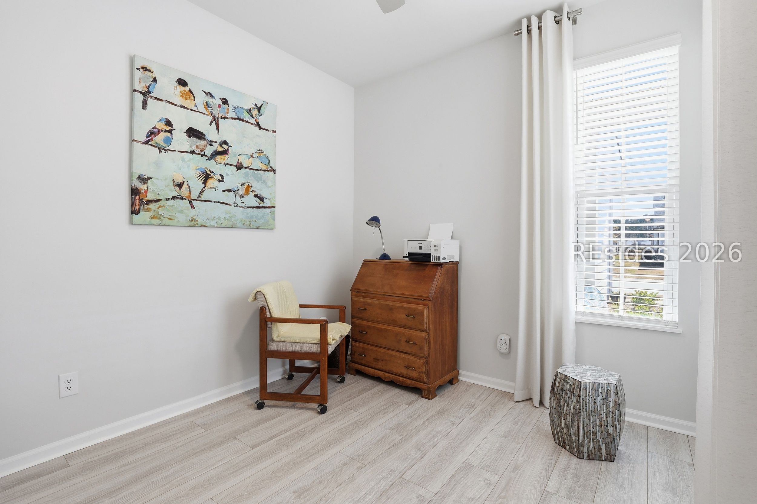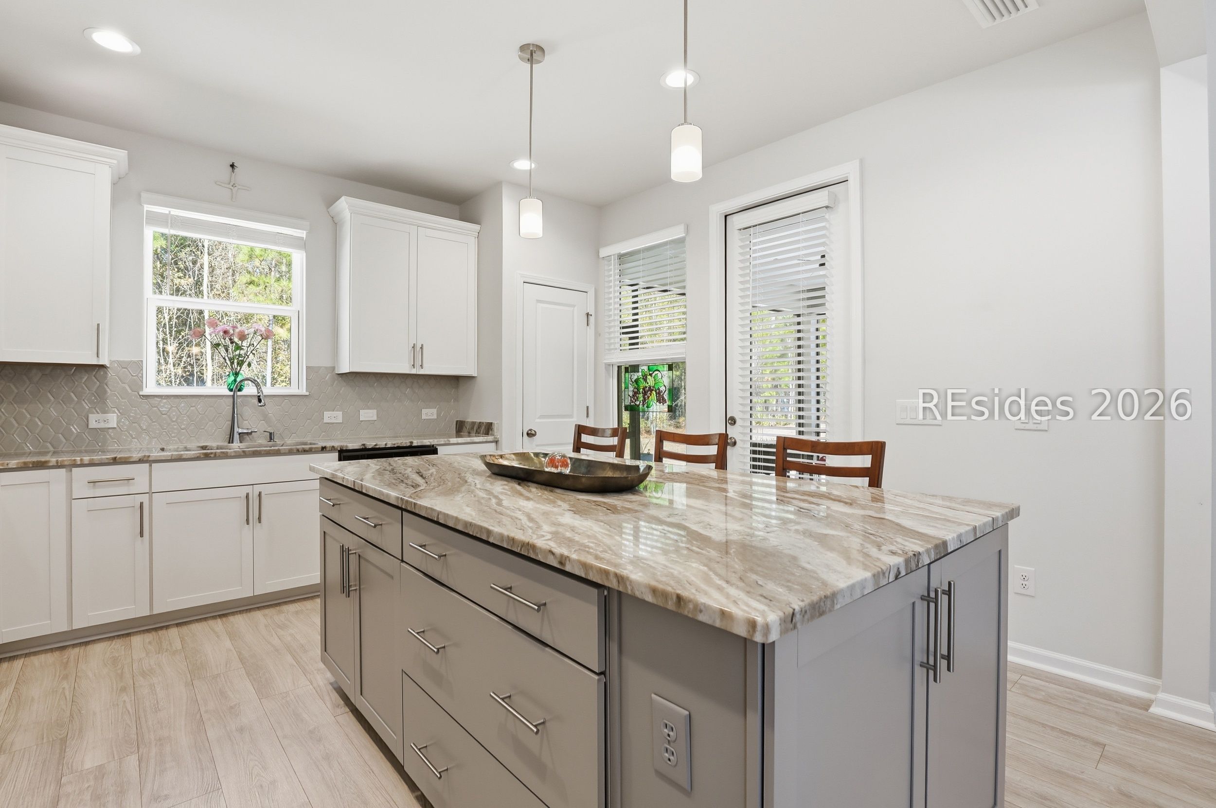 Modern, refined, and move in ready in Sun City Hilton Head, this beautifully upgraded 2022 Compass model delivers style, comfort, and privacy in one exceptional package. Offering 2 bedrooms plus a private office flex room and 2 full baths across 1,403 square feet, this thoughtfully designed home lives far beyond its footprint. Luxury Vinyl Plank flooring flows seamlessly throughout with no carpet, creating a clean, contemporary aesthetic. The open concept living area is anchored by a custom electric fireplace with wood surround, adding warmth and architectural interest. The kitchen makes a statement with granite countertops, tile backsplash, stainless steel appliances with gas range, white cabinetry paired with a contrasting gray island, soft close drawers, pull outs, updated lighting, and a window overlooking a peaceful wooded backdrop. The primary suite offers a spacious walk-in closet and a beautifully appointed bath with dual quartz vanities and a frameless floor to ceiling tiled shower complete with bench, transom window, and dual shower heads. Outdoor living includes a covered screened porch and extended patio designed for relaxing or entertaining. Residents of Sun City Hilton Head enjoy championship golf, resort style pools, fitness centers, pickleball and tennis courts, scenic walking trails, and a vibrant calendar of clubs and community events.