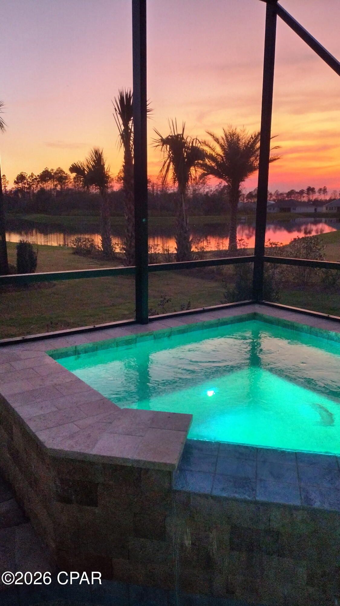 Welcome to this stunning Lucia floorplan in the Villa Collection, ideally located in Phase II near Town Square within the highly desirable Latitude Margaritaville Watersound 55+ community just steps from the amenities. This home is thoughtfully designed with 1,774 sq. ft., 2 bedrooms, 2 baths, and a den/flex room with pocket doors, offering both comfort and versatility. The true showpiece is the private, south facing saltwater pool and spa, perfectly positioned to capture breathtaking sunset views over the tranquil pond. The extended screened lanai creates an exceptional outdoor living space complete with gas grill hookup and mounted exterior TV, making it ideal for relaxing evenings or entertaining guests in a resort style setting. Inside, this home is abundant with upgrades and features no carpet anywhere. Luxury vinyl plank flooring flows throughout, complemented by 8' doors, crown molding, window treatments, and elegant finishes. The kitchen is beautifully appointed with quartz countertops, tile backsplash, gas range, under and above cabinet lighting, pull-out drawers, trash pull-out, island trim, and all appliances included. The living area is warm and inviting with a trey ceiling, shiplap accent walls, and electric fireplace! The primary suite offers a spa like retreat with dual separated vanities and a fully tiled shower. Additional highlights include a large laundry room with utility sink and washer/dryer, plus an extended length two car garage with space for storage or a workbench. Residents of Latitude Margaritaville enjoy world class amenities including the Fins Up! Fitness Center, lagoon and indoor pools, waterfront dining and bars, pickleball, tennis, bocce, scenic trails, creative studios, and a vibrant calendar of social events. Nearby conveniences include shopping, dining, banking, a future Publix, planned marina, and new medical facilities while the white sand beaches are only 7 miles away. This exceptional home offers luxury, location, and lifestyle, all in one unforgettable package.