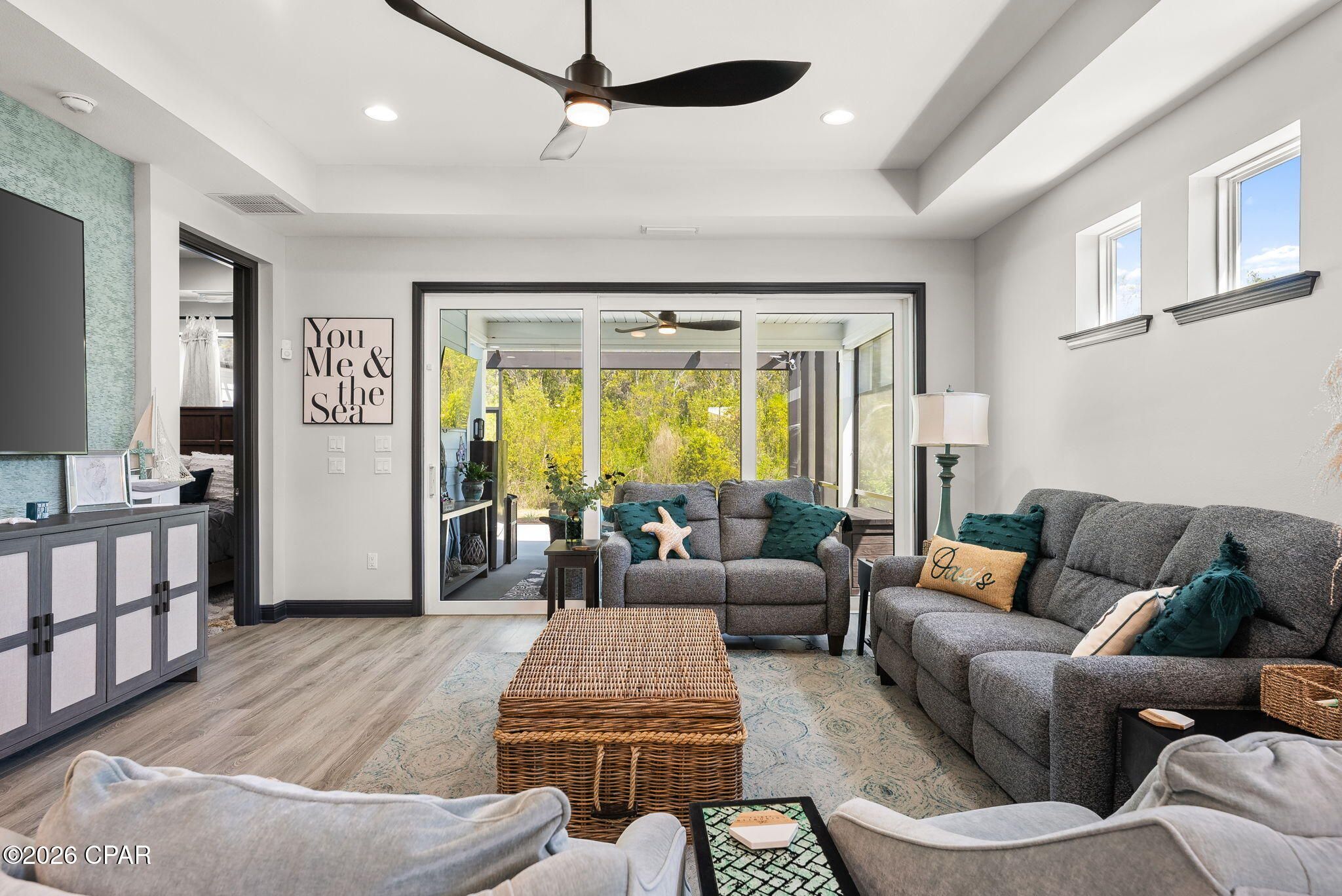 Welcome to this beautifully upgraded, coastal-modern home in the highly sought after Latitude Margaritaville Watersound community offering a thoughtfully designed living space, this home blends a clean, contemporary style with relaxed coastal living. From the moment you enter, your greeted by a striking light-filled foyer with soaring ceilings, custom wall detailing and designer lighting that sets the tone throughout the home. The open concept layout flows effortlessly into the main living area, where tray ceilings, abundant natural light, and a seamless indoor-outdoor connection create an inviting space perfect for both everyday living and entertaining. The kitchen is a standout, featuring crisp white cabinetry, updated hardware, modern lighting and an oversized island ideal for gathering. The adjacent dining area is warm and welcoming, while the living room offers a custom media wall and the included 75'' TV, making it a perfect space to unwind. Step outside into your outdoor retreat, an extended patio and newly added lanai with panoramic views and double doors that bring the outdoors in. The space is enhanced with professional landscaping and low-maintenance turf, perfect for pets and easy living. Unwind in your included hot tub and enjoy the added bonus of a 55'' TV on the covered patio - perfect for entertaining or relaxing evenings at home. Additional upgrades include premium Sherwin Williams paint, upgraded lighting in the kitchen, dining and entry areas, a widened driveway, a newly enclosed den for added flexibility (currently used as a bedroom) and custom up-down shades for light and privacy control. The home also features a solar system with a Tesla backup battery (all paid for) and a SimpliSafe security system for added comfort, efficiency and peace of mind. Ideally located within walking distance to the community dog park and resort-style amenities featuring an Expansive Fins Up! Fitness Center with state-of-the-art equipment, Resort-style lagoon pool, Indoor pool and dedicated lap lanes, Bar & Chill Restaurant and Changes in Attitude Bar overlooking the Intracoastal Waterway, Tennis, pickleball, and bocce courts, miles of walking, biking, and golf-cart trails throughout the community. Dog park, green spaces, and community gathering areas. Ceramic shop, wood-working shop, theater, meeting rooms, and multipurpose event spaces. Full calendar of events including special interest clubs, concerts, fitness classes, and social gatherings year-round. Adjacent commercial conveniences include- shopping, dining, banking and a future Publix grocery store. Future Marina adjacent to the amenities center off of Latitude Blvd. A new medical center is only 5 miles away with a new state of the art hospital opening in 2027. Located only 7 miles from the beach. This home offers a perfect blend of convenience, community and coastal living. Call today for your appointment! Seller/Owner is a Licensed Florida Real Estate Agent