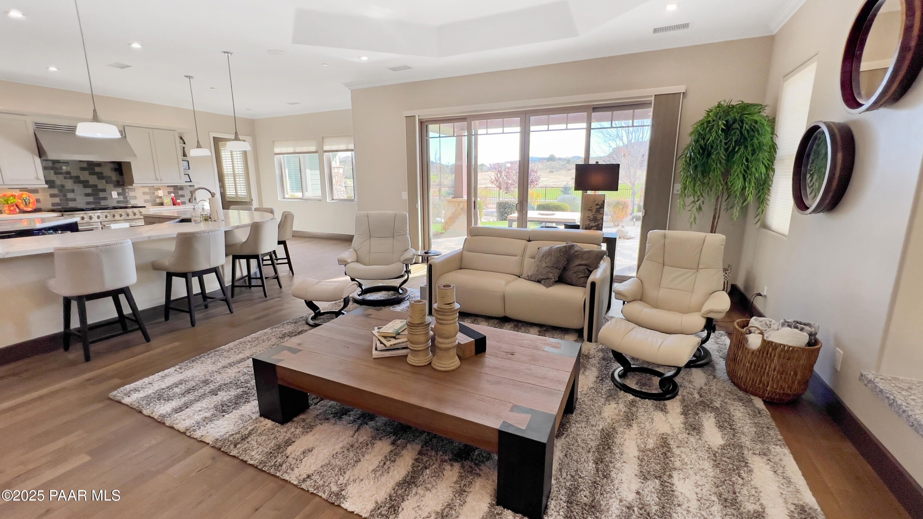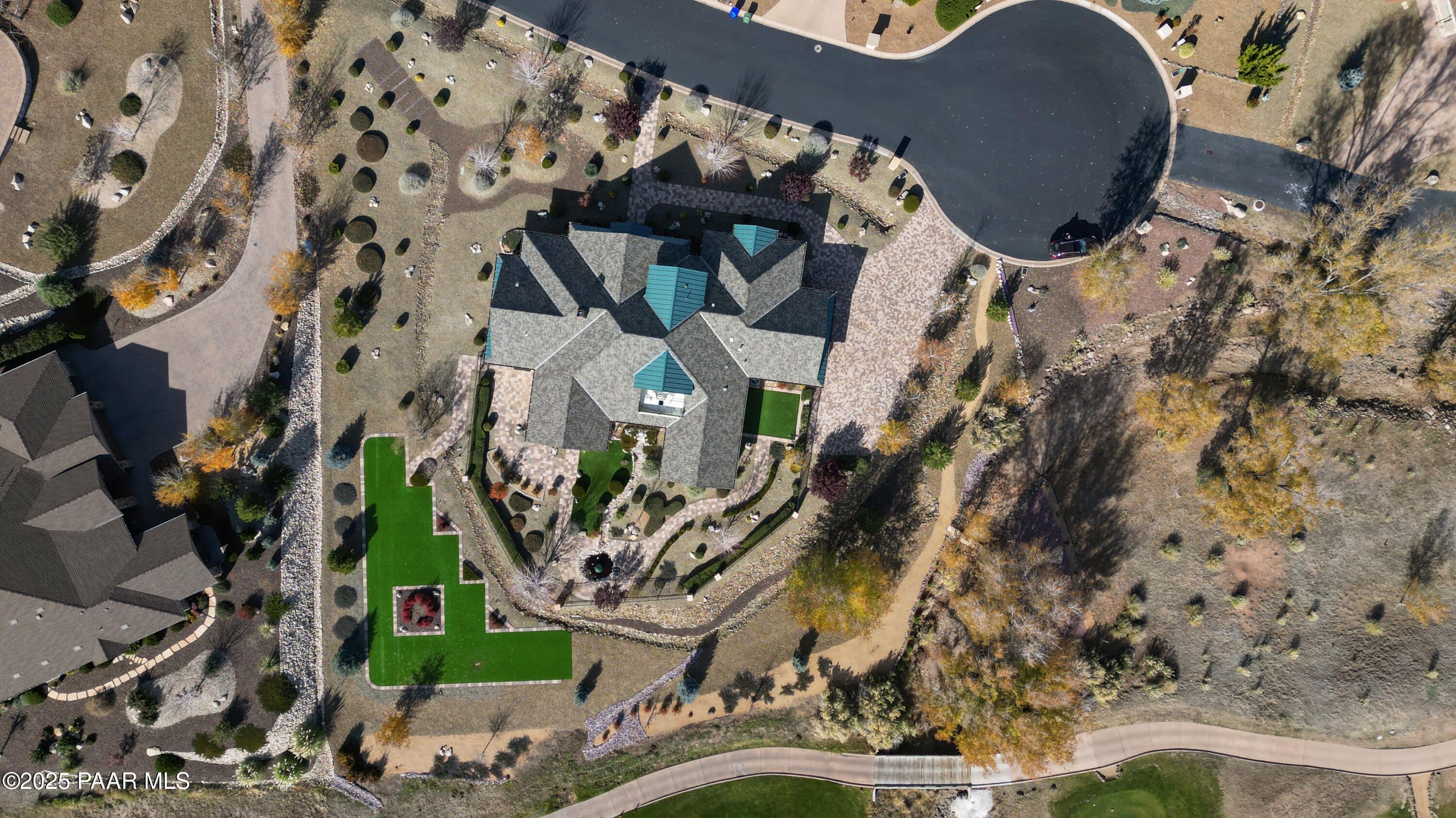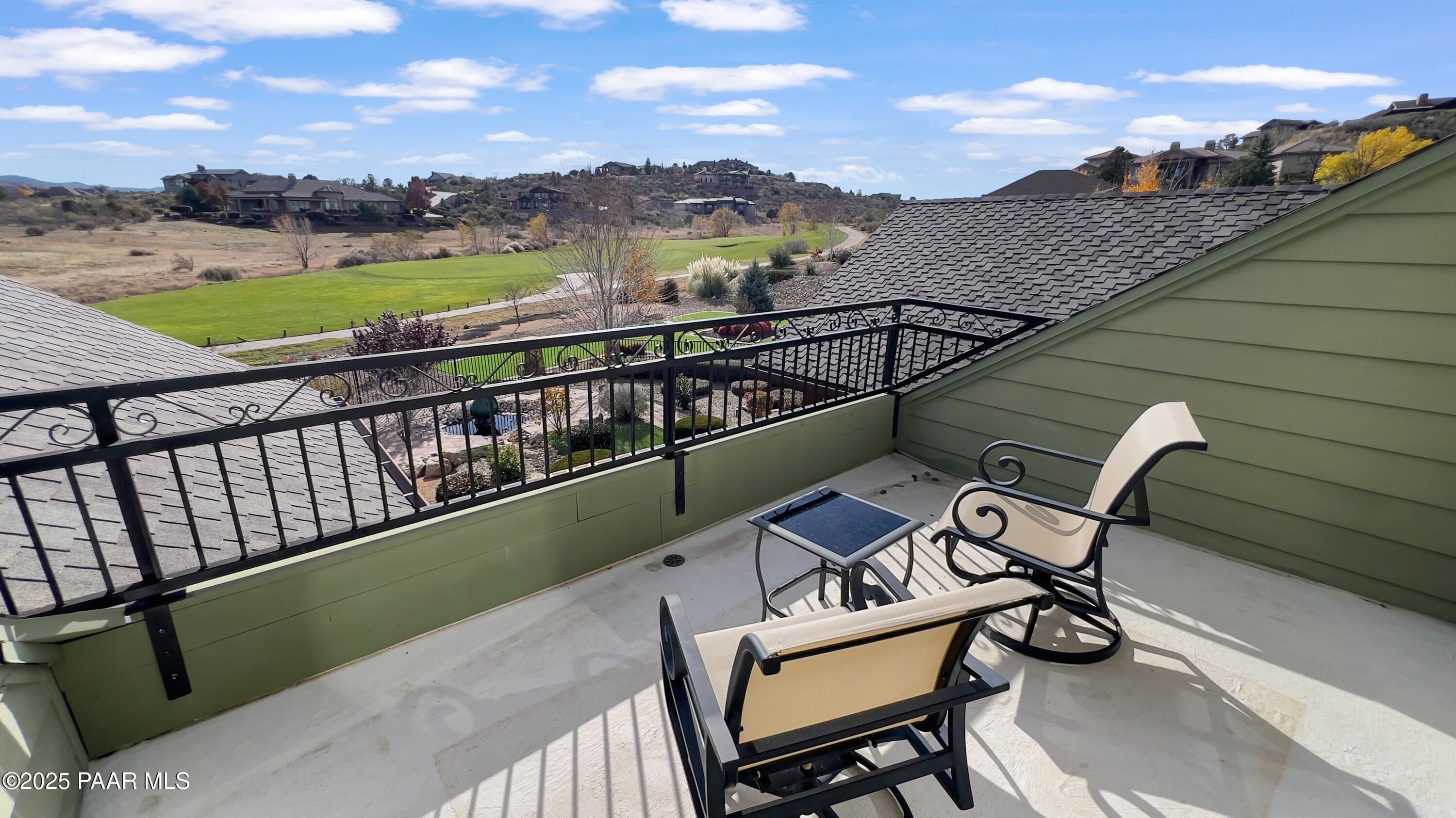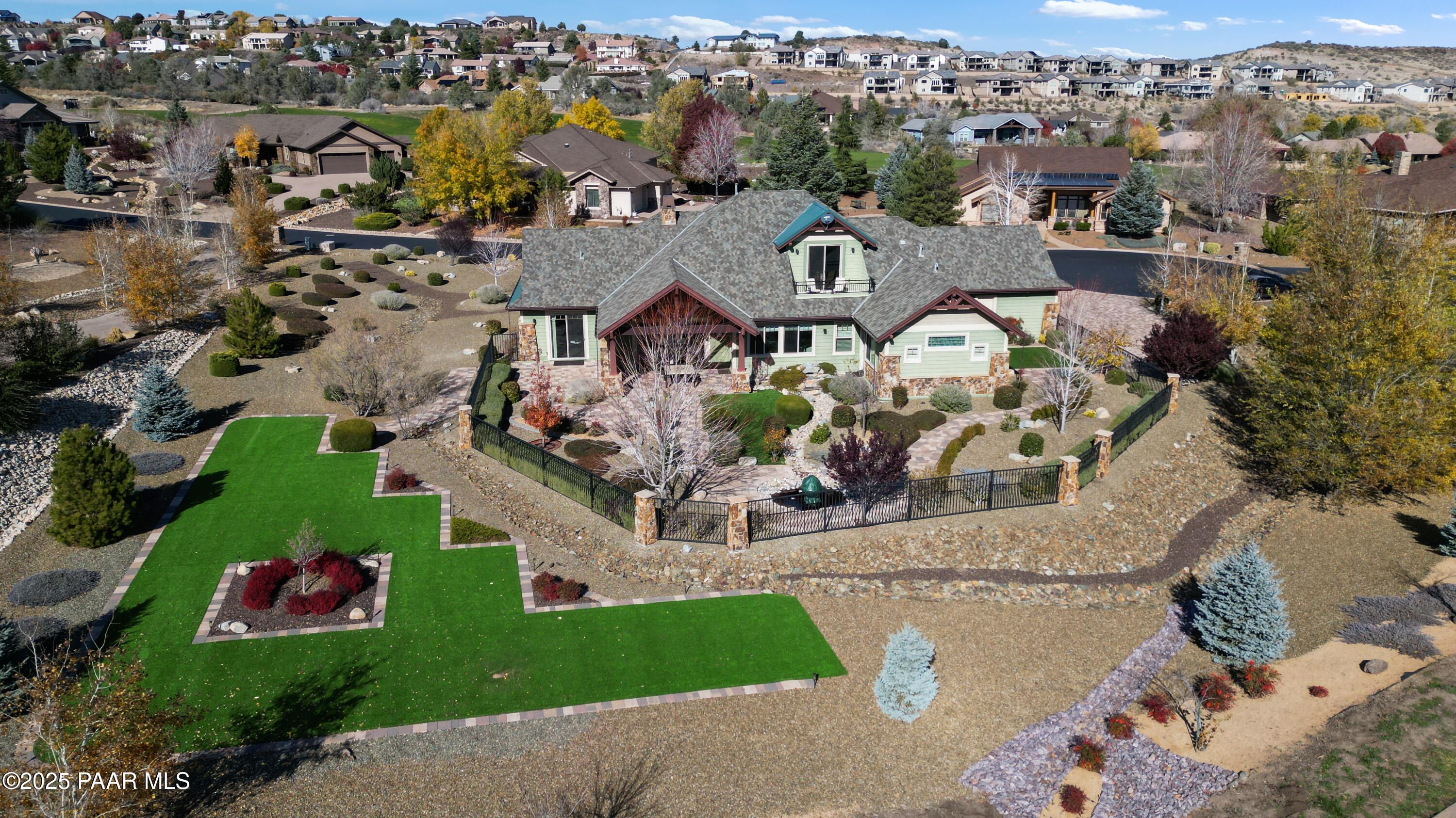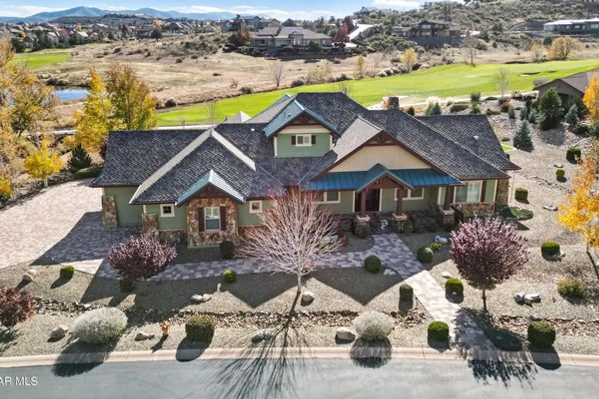 Welcome to 854 Northridge Drive, a luxurious, fully furnished retreat in the gated Estates of Prescott Lakes. This 3,401-sq-ft custom home delivers refined living, main-level convenience, and beautiful views just steps from private golf, indoor/outdoor pools, athletic center, pickleball, tennis, restaurant, and clubs. The approach sets the tone with professional low-maintenance landscaping, mature trees, a paver driveway, covered front porch, and an impressive entry door that opens to raised ceilings, engineered wood floors, crown molding, stone accents, and a striking double-sided fireplace in the living & dining area. This beautiful home sits right on the 3rd hole of the Prescott Lakes golf course and offers sweeping views. The gourmet kitchen is built for serious cooks, featuring quartz countertops, custom cabinetry, a large island and peninsula, reverse osmosis, a chef-grade fridge/freezer, new microwave and dishwasher, and a brand-new 8-burner Forno gas range with double ovens. The primary suite is truly a private refuge with a custom barrel wood ceiling with lots of sunshine. There is an amazing walk-in closet with custom built-ins plus a steam press for your clothing. The primary bath feels like a private spa with a jetted tub, walk-in shower with professional steaming system, double sinks, vanity, abundant natural light, and a heated towel rack. There are two guest bedrooms with one on the main level & one upstairs complete with a private patio deck porch & coffee station. Each guest suite offers walk-in closets and ensuite baths complete with granite counters and upgraded finishes. A dedicated office and a game room with wine fridge and beverage coolers round out the living spaces. Main level also has a powder room for added convenience. The backyard is a serene, private oasis with a covered patio, artificial turf, mature trees, waterfall, fountain, pond, outdoor sound system, drip system, natural-gas grill stub, and a second double-sided fireplace for year-round ambiance. The three-car garage is fully outfitted with epoxy floors, built-in cabinetry, workshop area, refrigerator, water softener, tankless water heater, recirc pump, and direct yard access. The home conveys fully furnished, including multiple refrigerators, wine fridges, washer/dryer, TVs, and outdoor furniture. The entire interior of the home has recently been repainted with new baseboards and new engineered flooring installed. If you are looking for luxury living in the Lakes that is a true retreat, look no further. This home offers it all plus enjoy all of the amazing amenities that the Club at Prescott Lakes has to offer. Club Initiation Fee of 1/2 of 1% on purchase price.