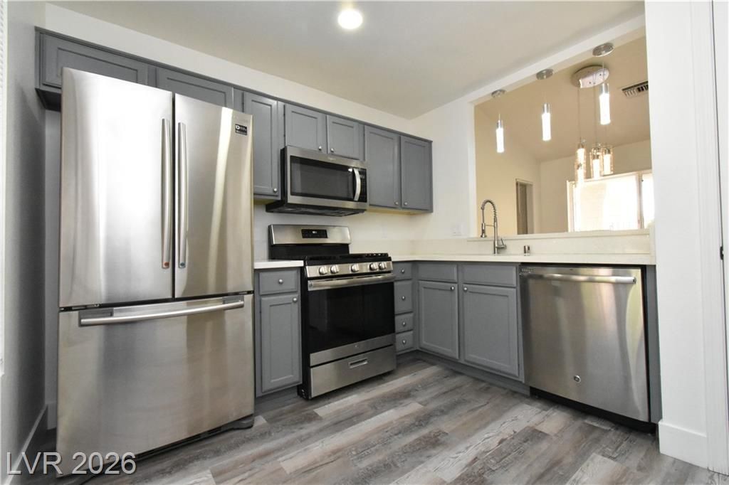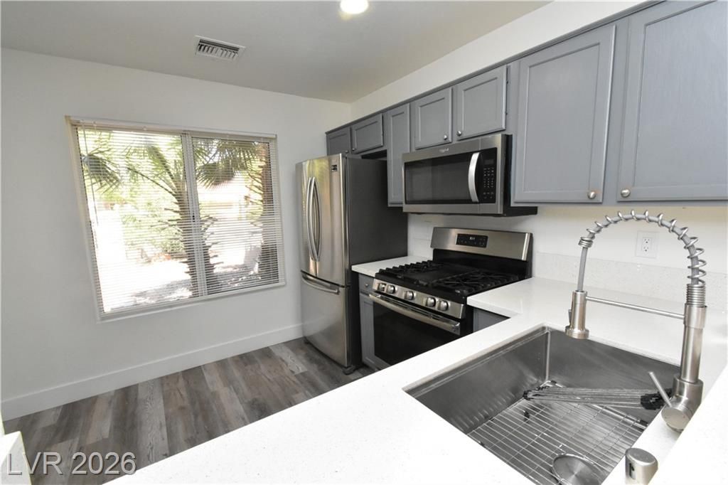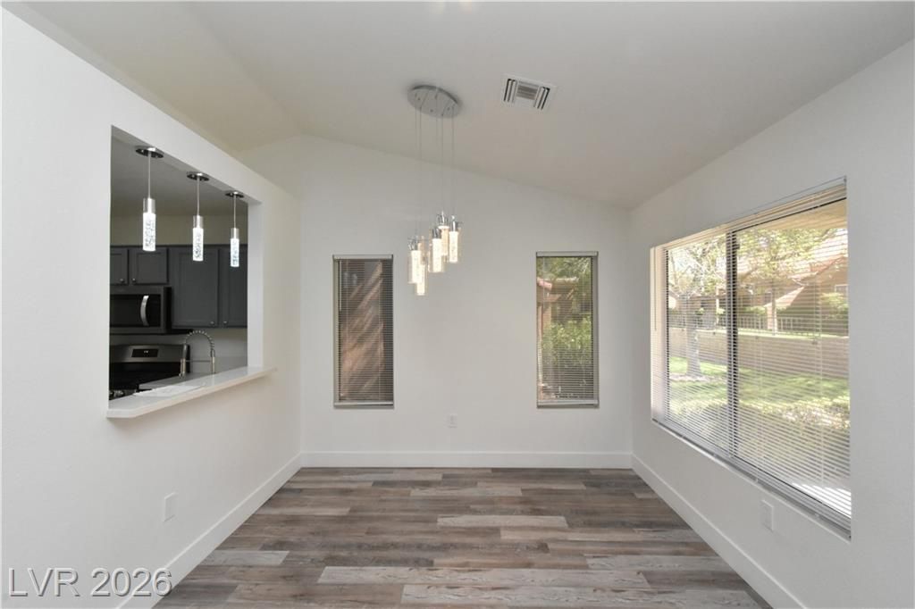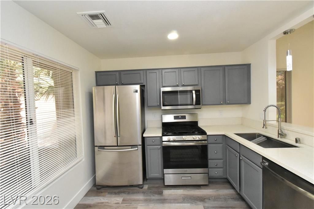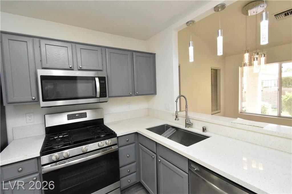 Single story home offering: beautiful recently installed laminate flooring throughout the house. NO CARPET!! Upgraded baseboards, Large walk- in shower with modern finishes!!! Functional kitchen with stainless steel appliances, built in microwave and quartz countertops. This lovely 2-bedroom, one bathroom, two car garage is located in Sun City Summerlin Resort Community offering: Social calendar, activities, pools, community centers, exercise room and more. Schedule a tour today!!!
